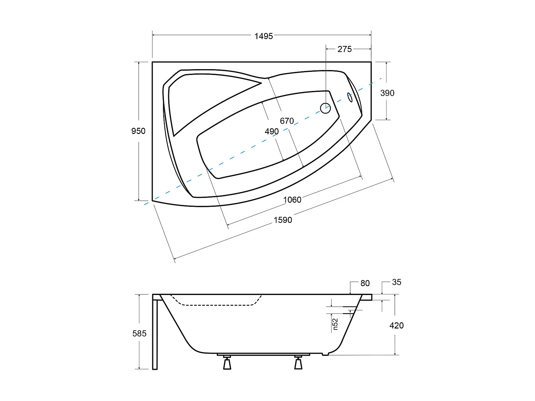 Badewanne Eckwanne RIMA 150x95 Links mit weißer Kopfstützen | Ablauf & Füße GRATIS !