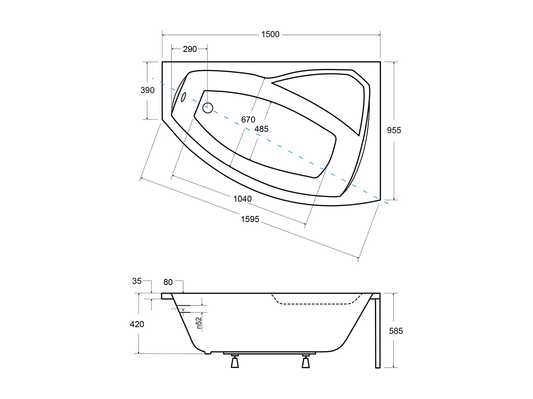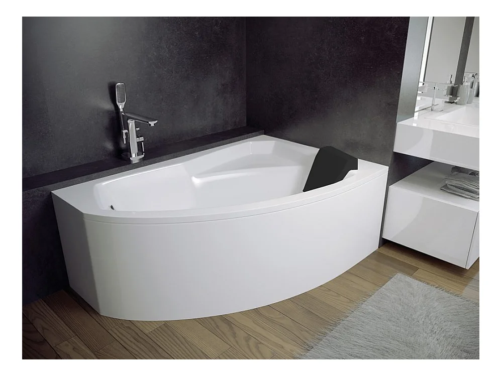 Badewanne Eckwanne RIMA 150x95 Rechts mit AcrylSchürze und schwarzer Kopfstützen | Ablauf & Füße GRATIS !