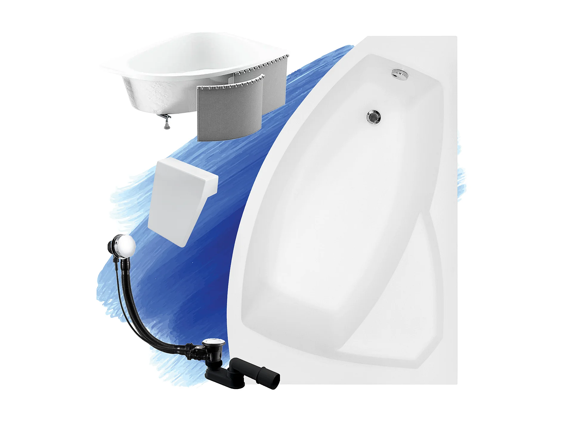 Badewanne Eckwanne RIMA 160x100 Rechts mit Styroporverkleidung und weißer Kopfstützen | Ablauf & Füße GRATIS !