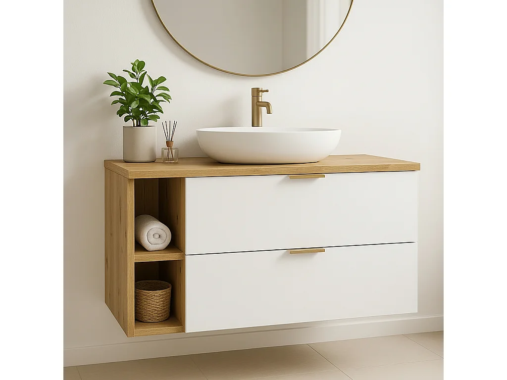 Badezimmer-Set 100 cm Schrank mit Arbeitsplatte und Regal Eiche Artisan / Weiß Orio