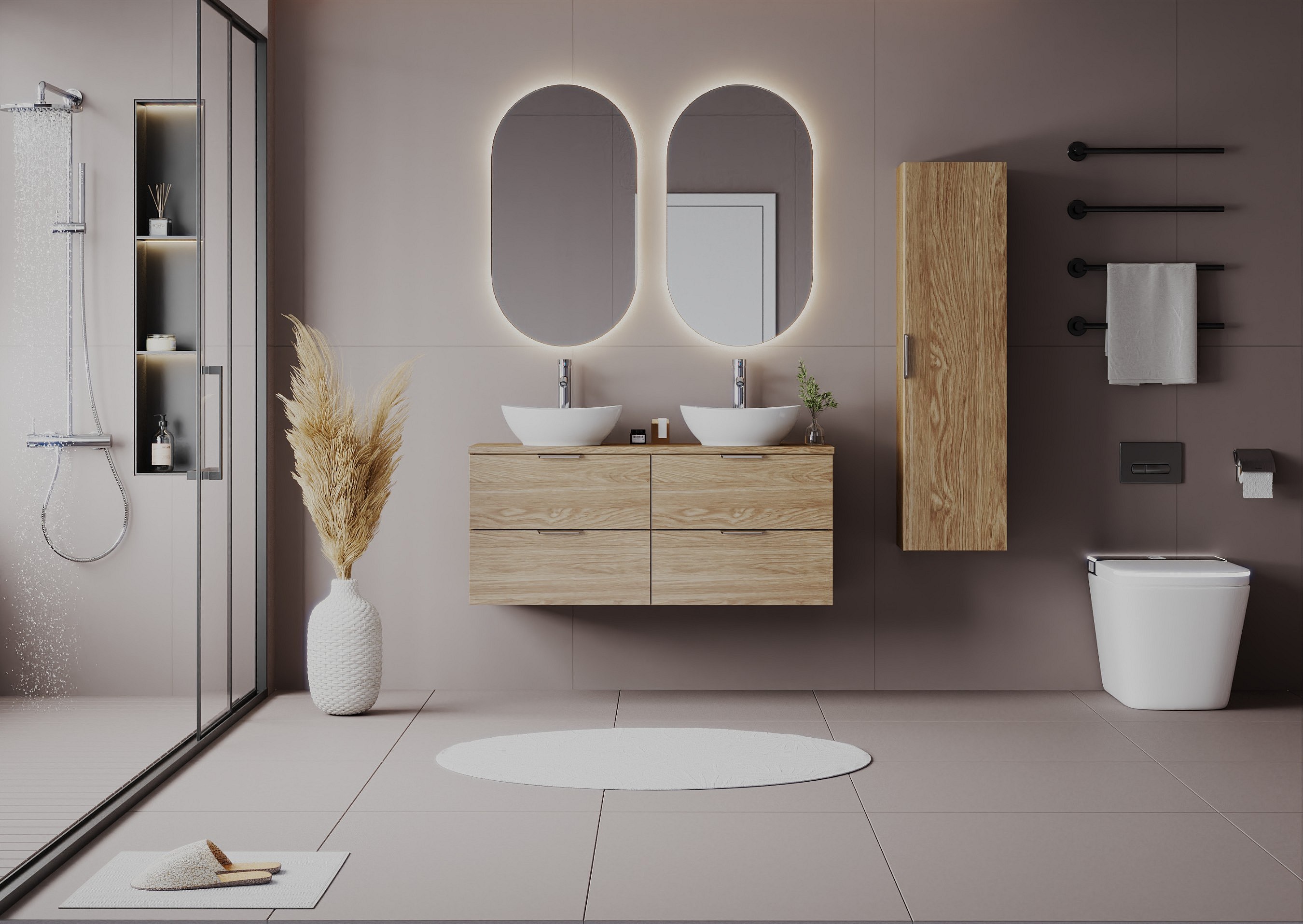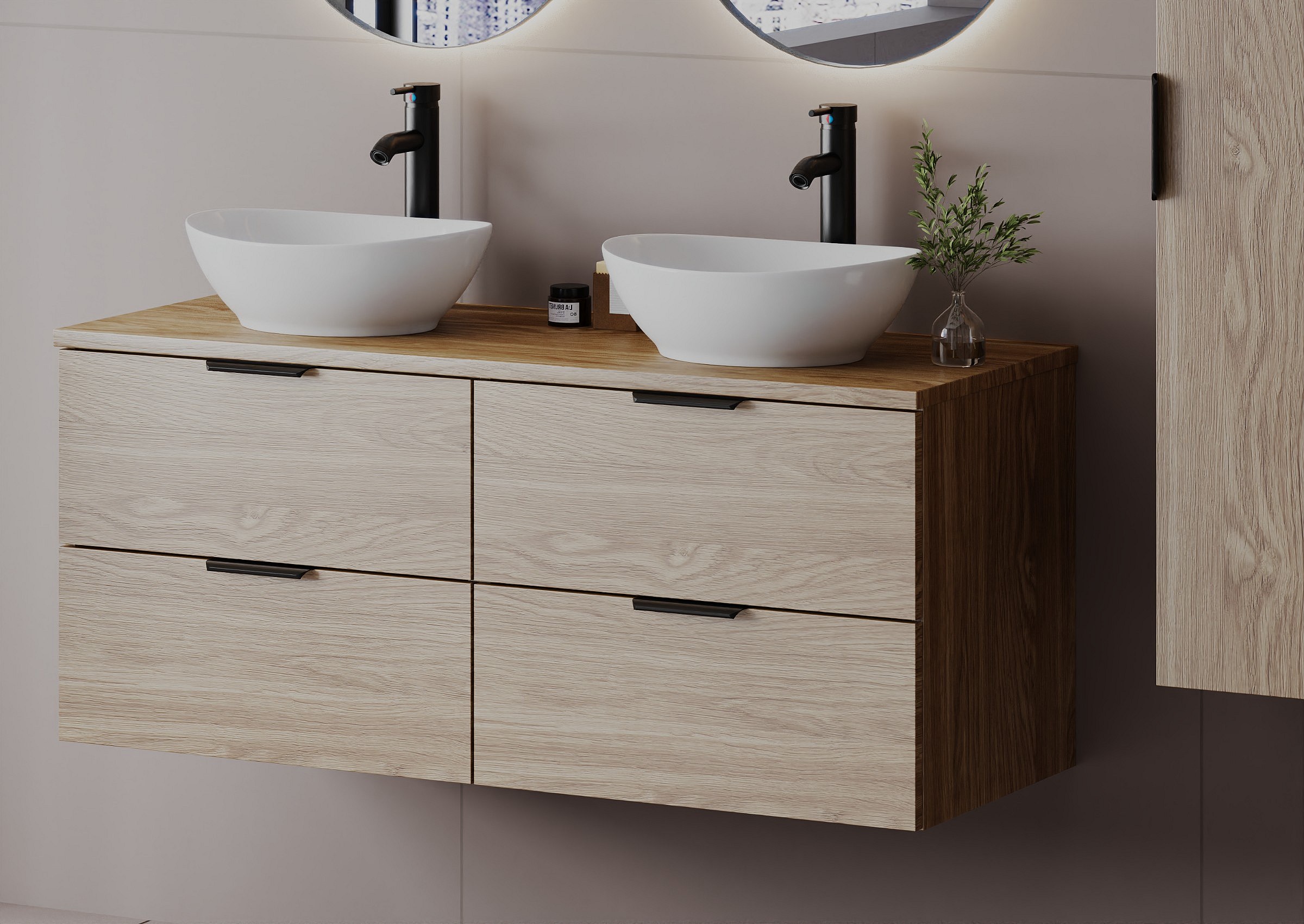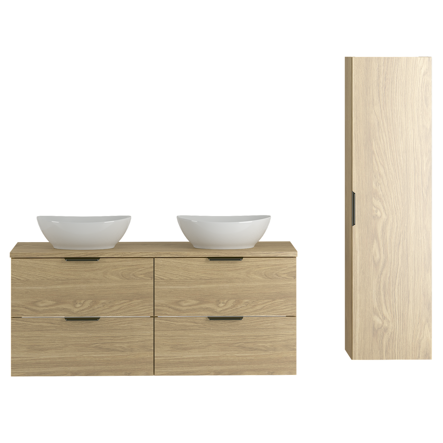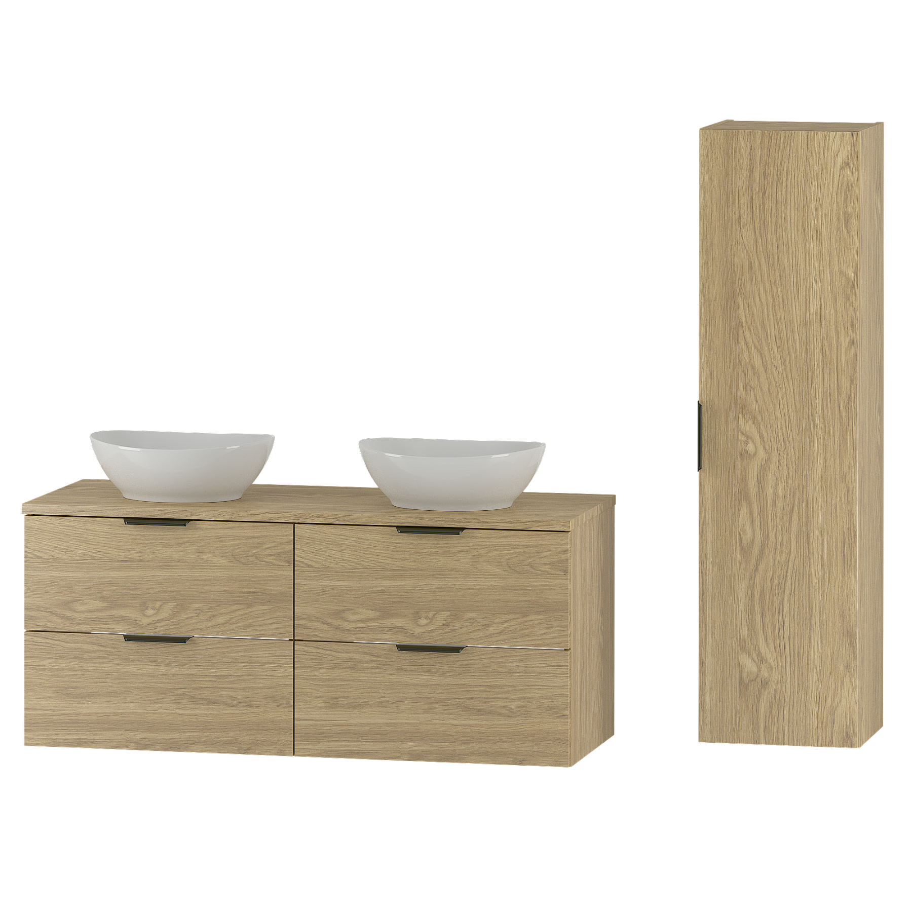 Badezimmer-Set 120 cm Schrank mit Arbeitsplatte und Washbecken und Hochschrank Eiche geölt Pile