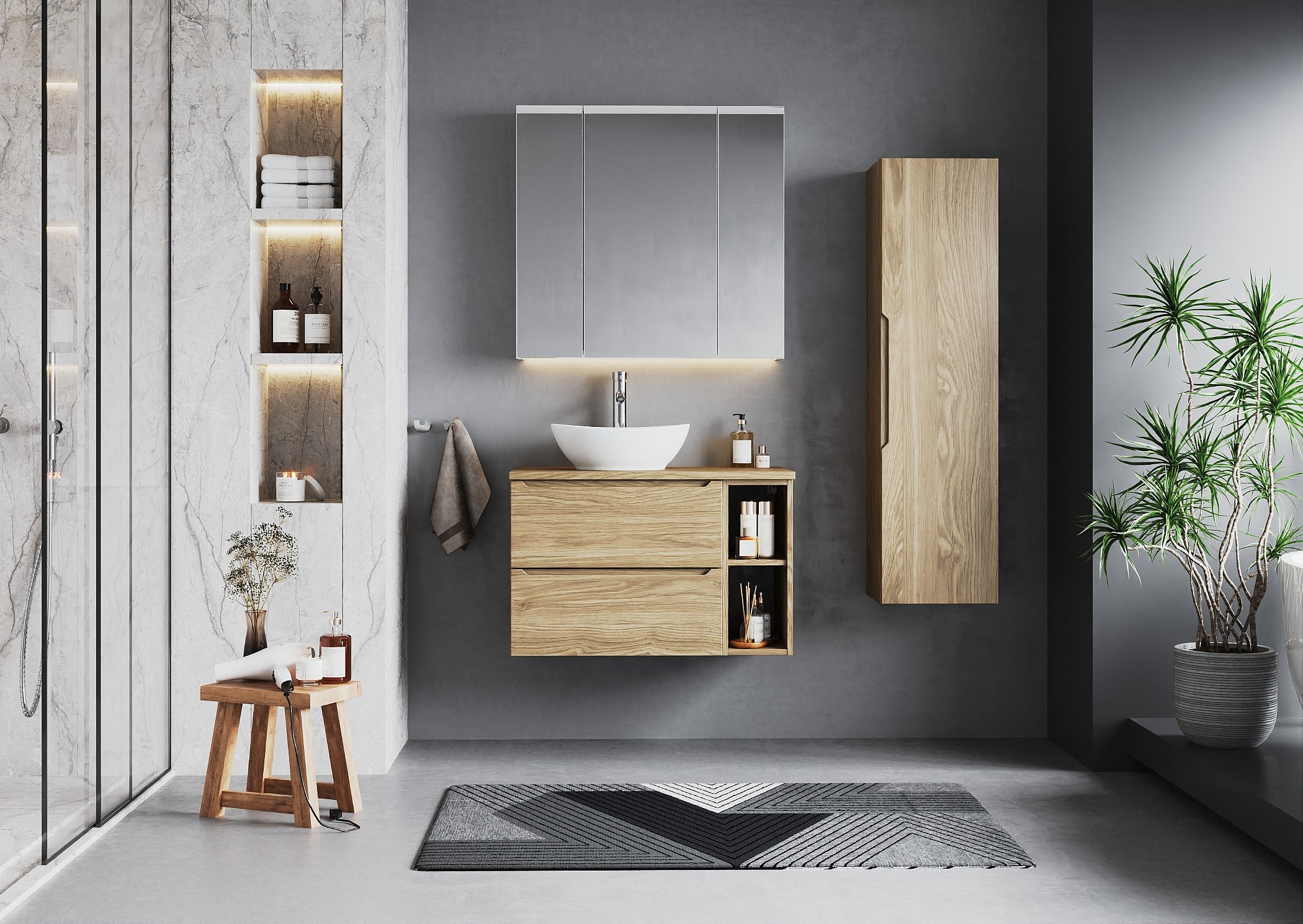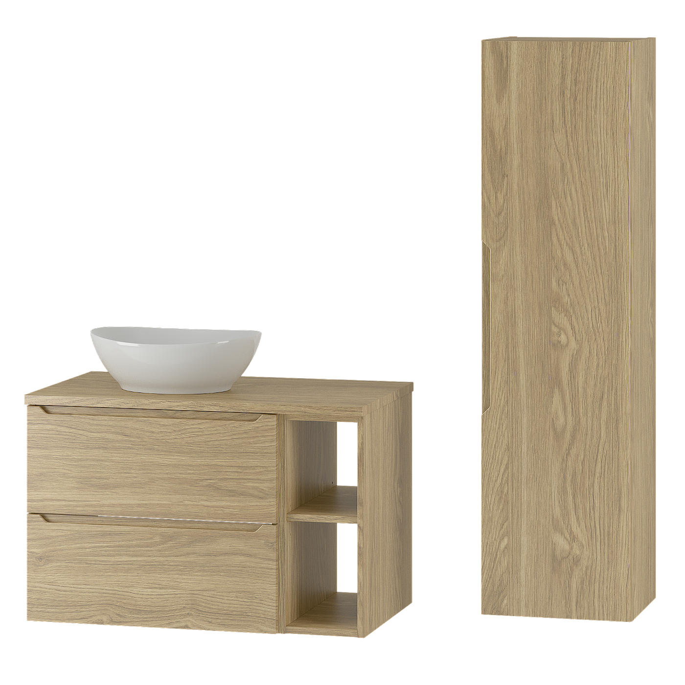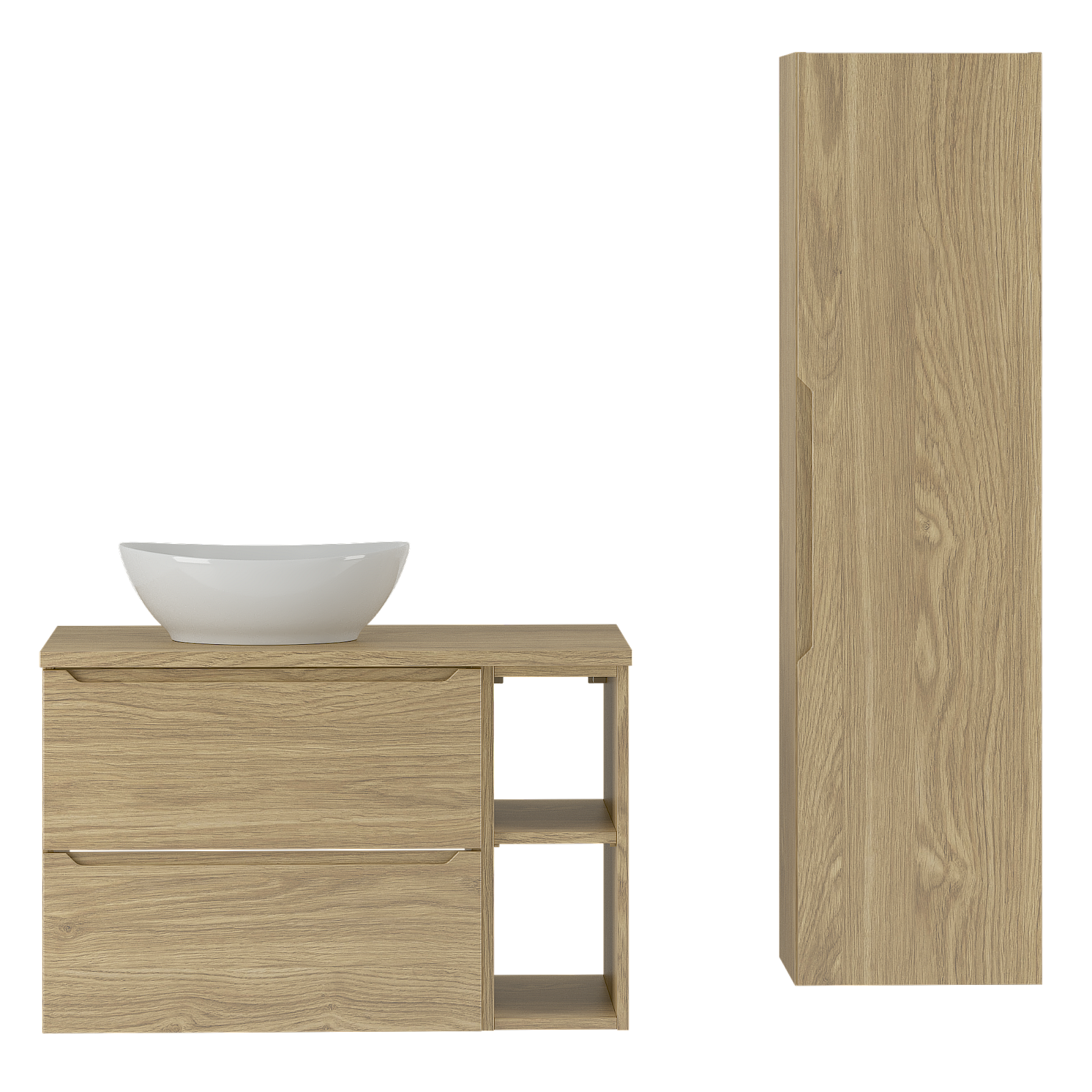 Badezimmer-Set 80 cm Schrank mit Arbeitsplatte Waschbecken und Regal und Hochschrank Eiche geölt Etna