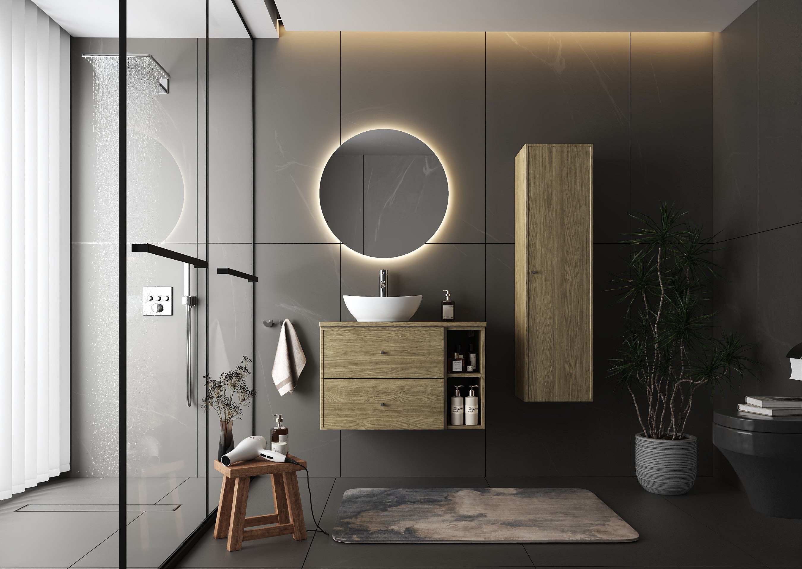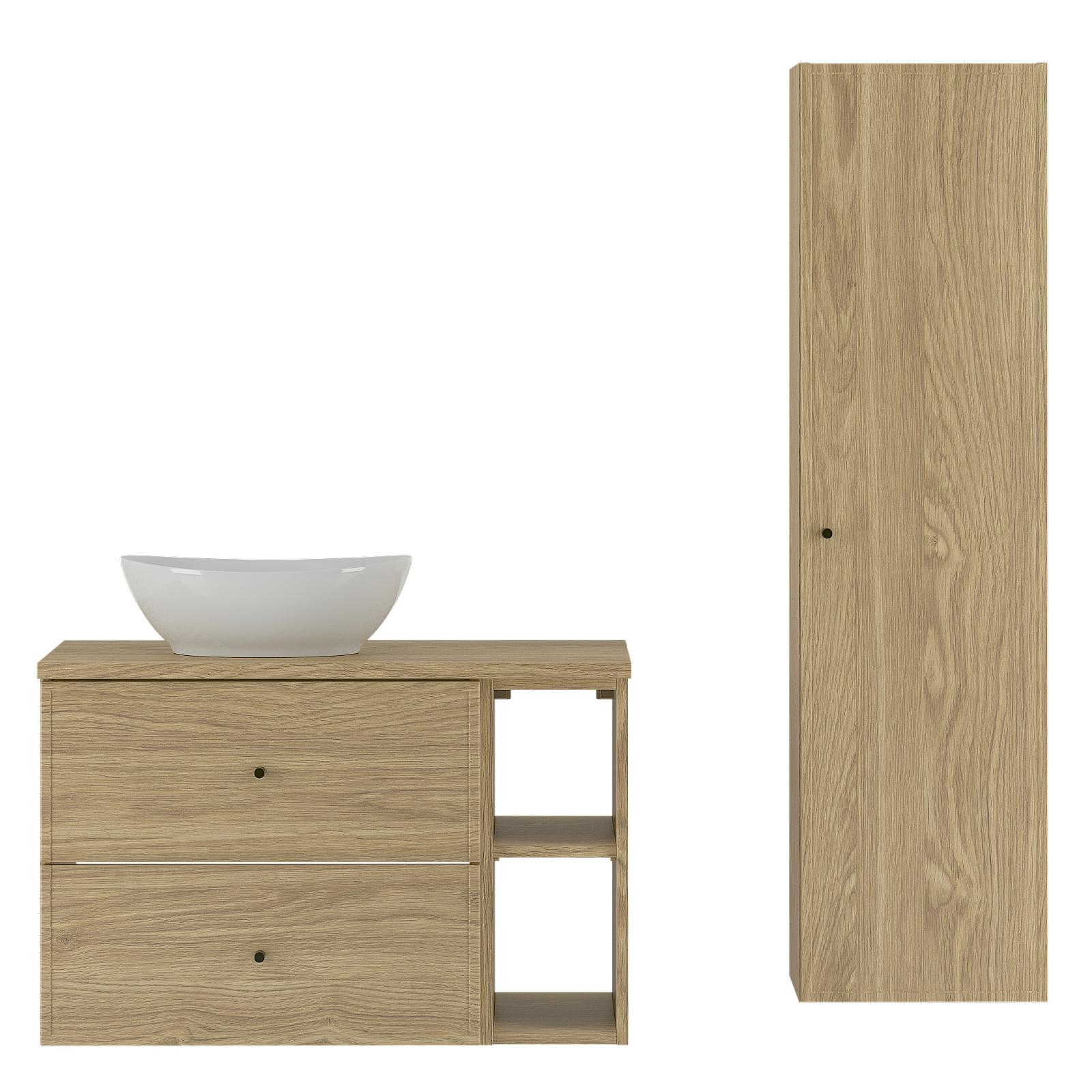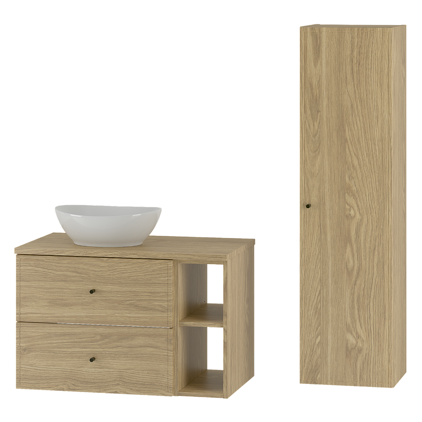 Badezimmer-Set 80 cm Schrank mit Arbeitsplatte Waschbecken und Regal und Hochschrank Eiche geölt Marco