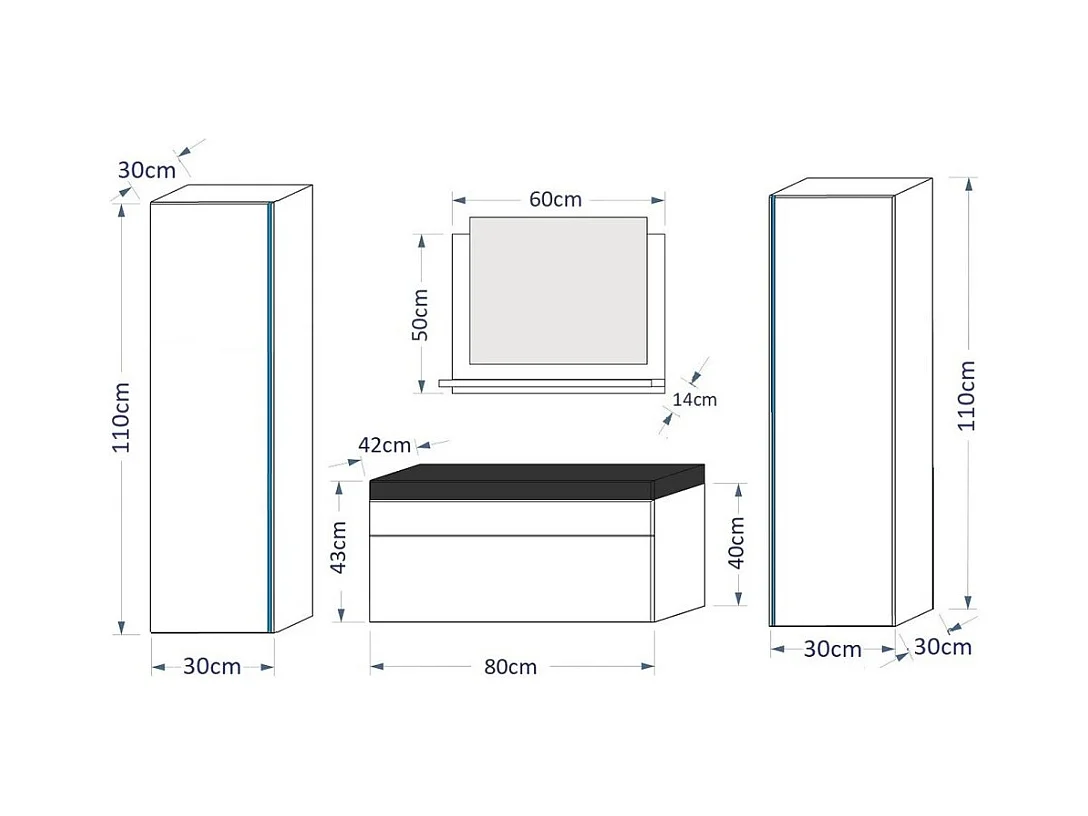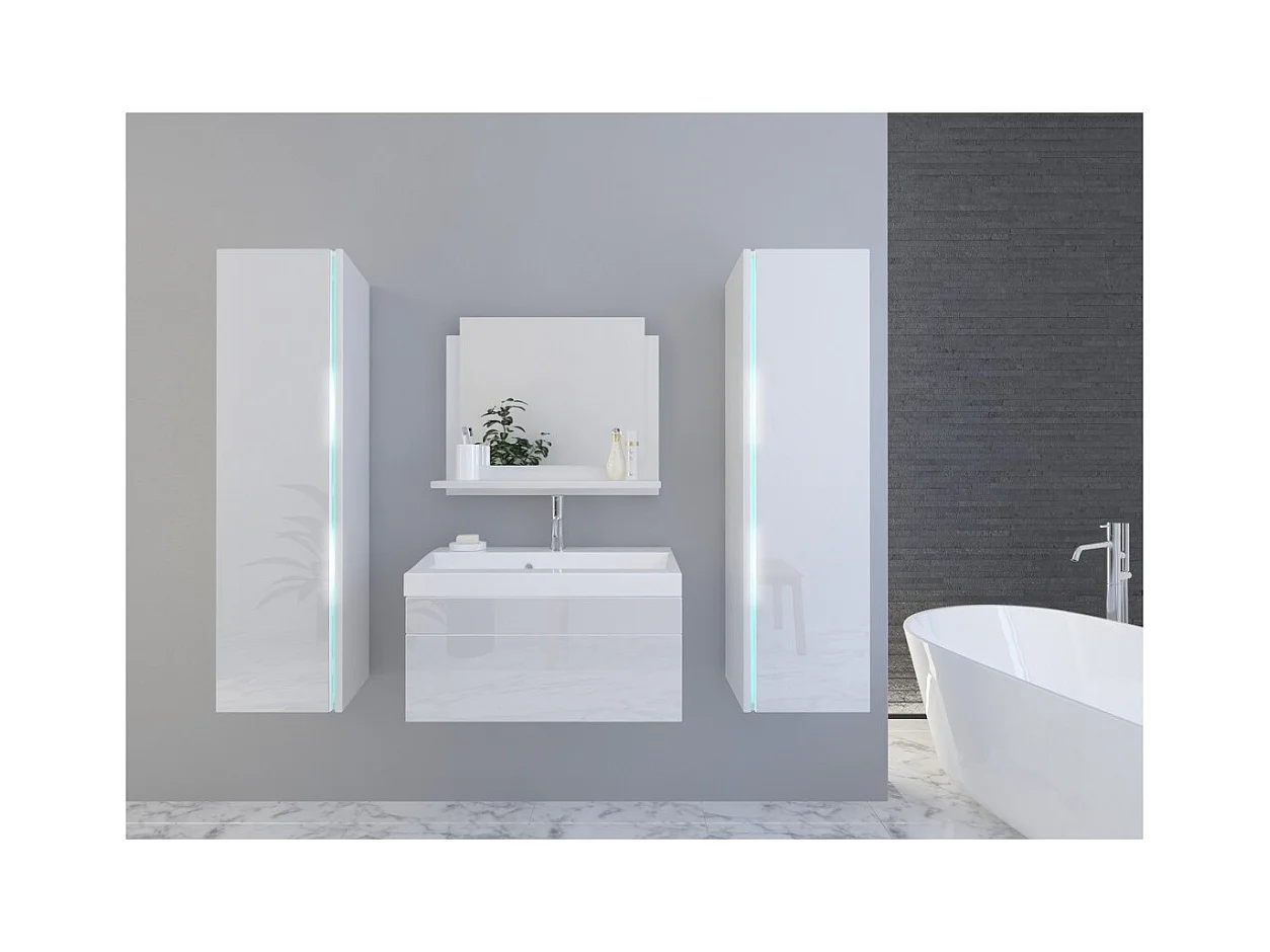 Badezimmermöbel-Set weiß, Kollektion BIRD, Hochschränke, Waschbeckenunterschrank 80 cm, Spiegel, Siphon und LEDs