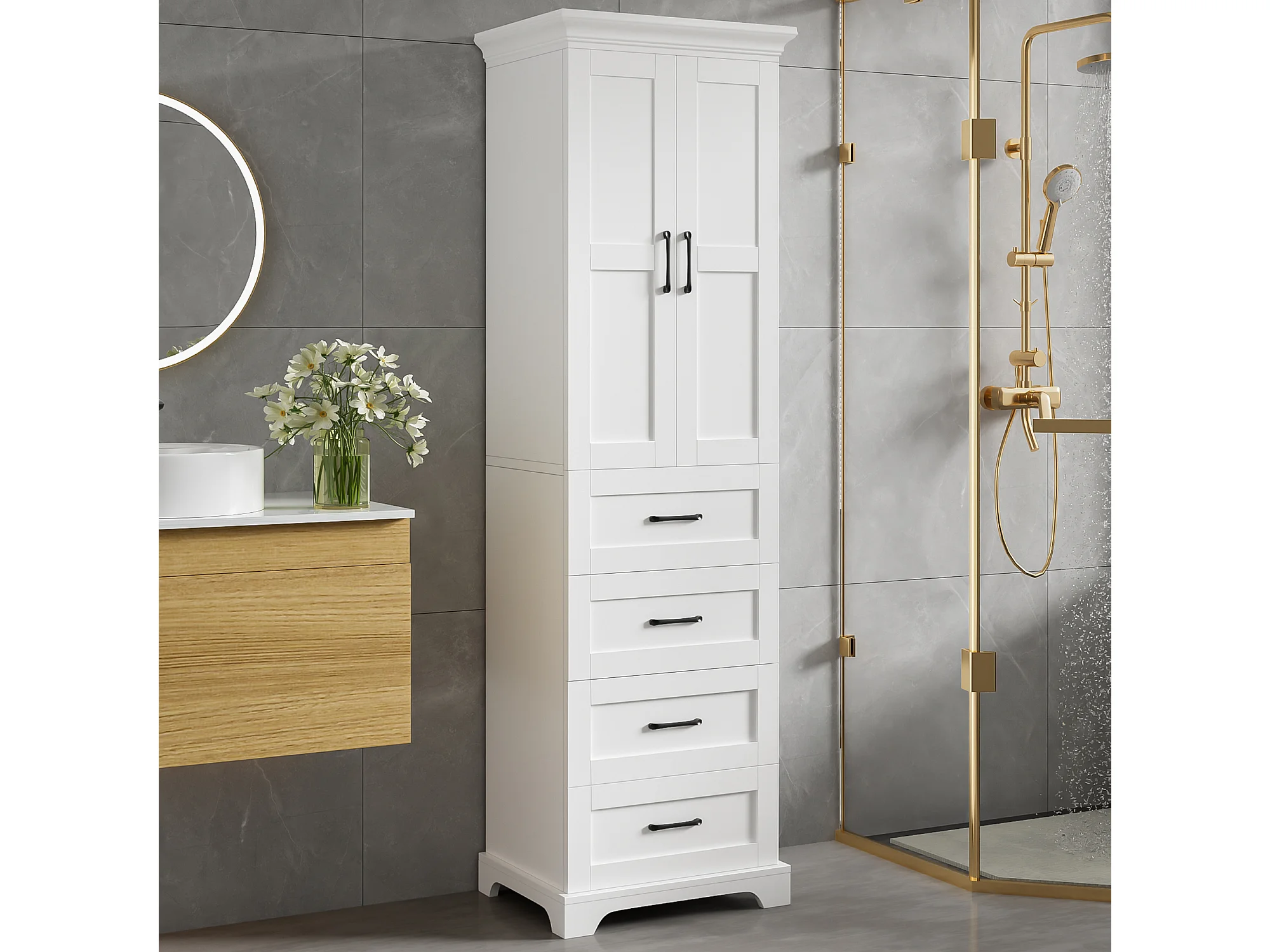 Badezimmerschrank 57x38x180 cm - mit 3 Schubladen und 2 Türen - höhenverstellbare Einlegeböden - MDF - Weiß