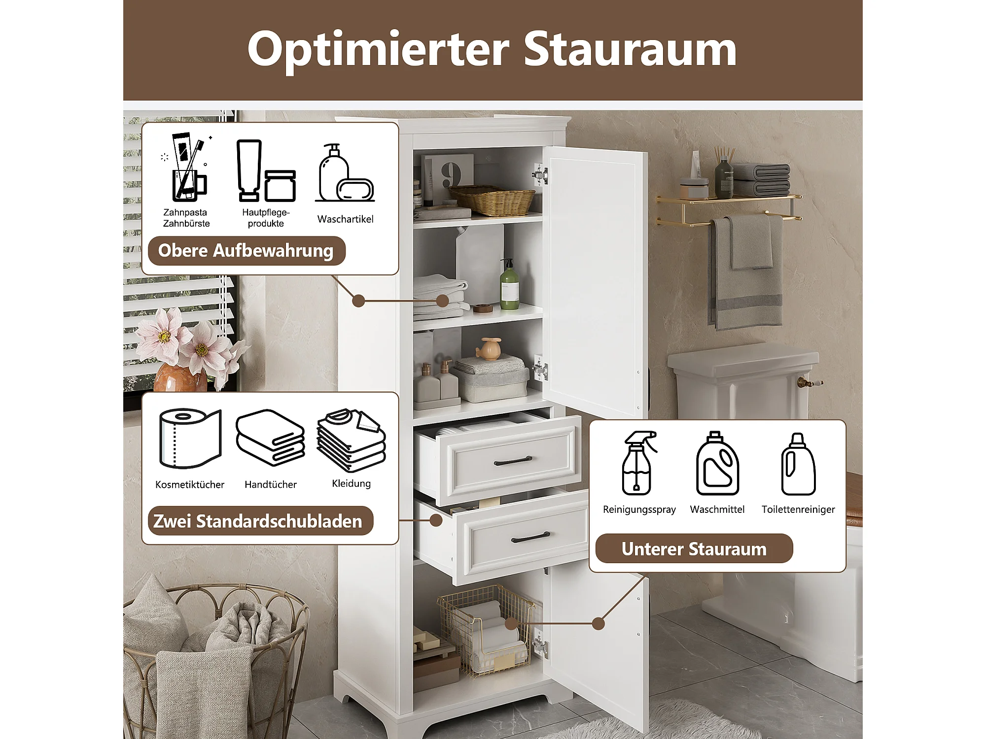 Badezimmerschrank 60x40x180 cm - mit 2 Schubladen und 2 Türen - höhenverstellbare Einlegeböden - MDF - Weiß