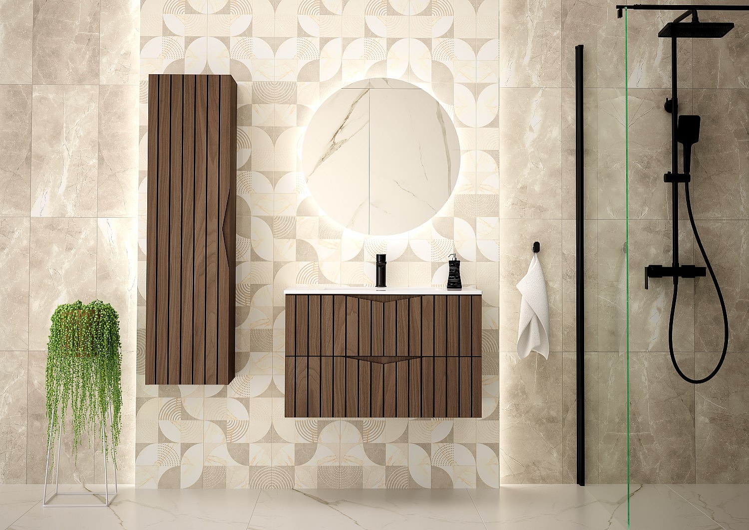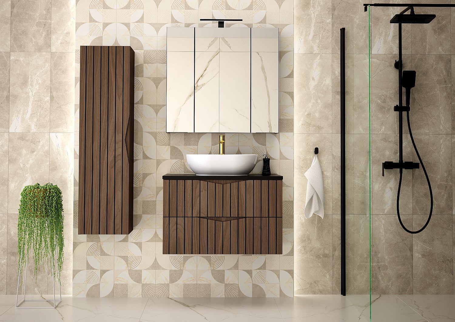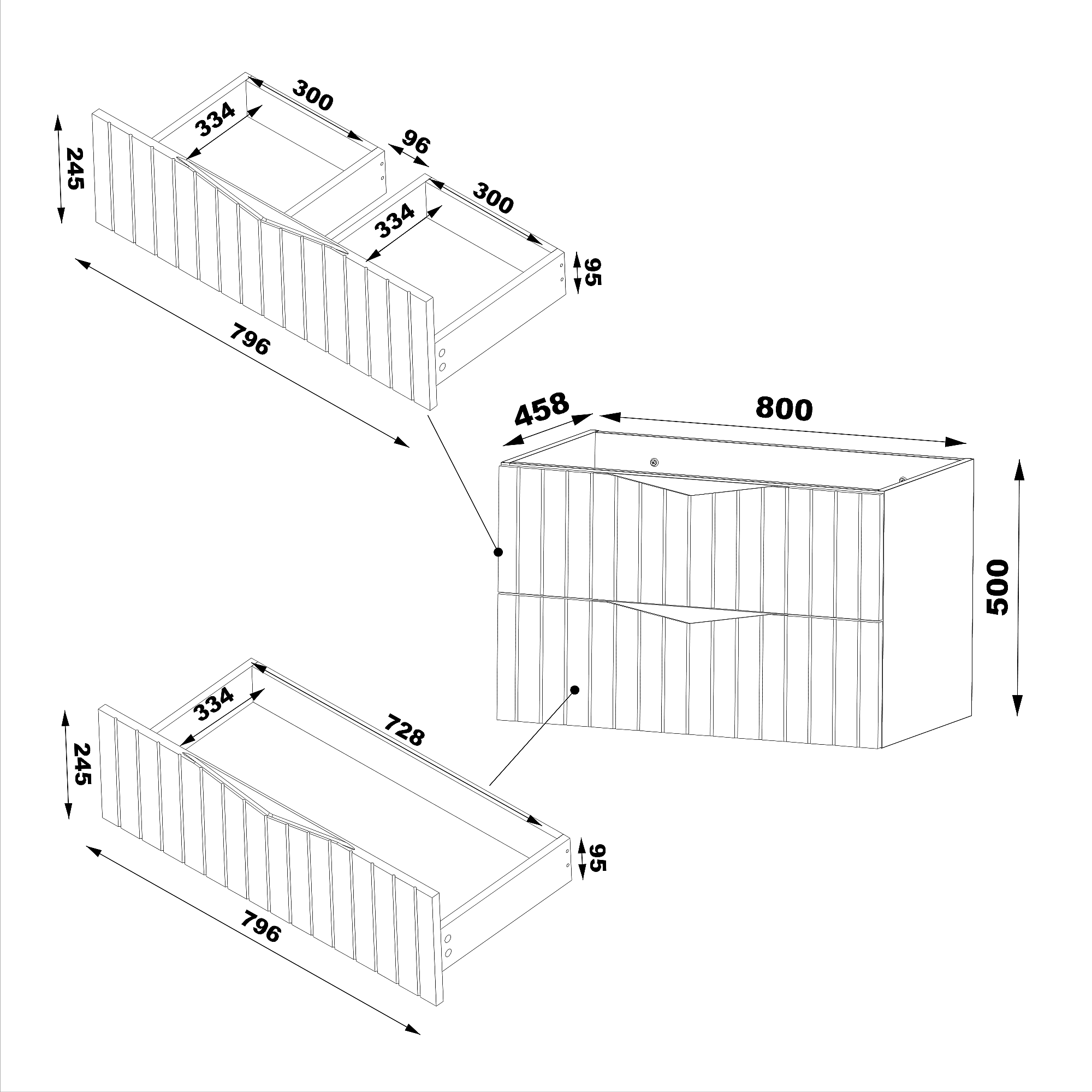 Badezimmerschrank unter Waschbecken 80 cm 2 Schubladen Geriffelte Fronten Eiche Nussbaum Stella