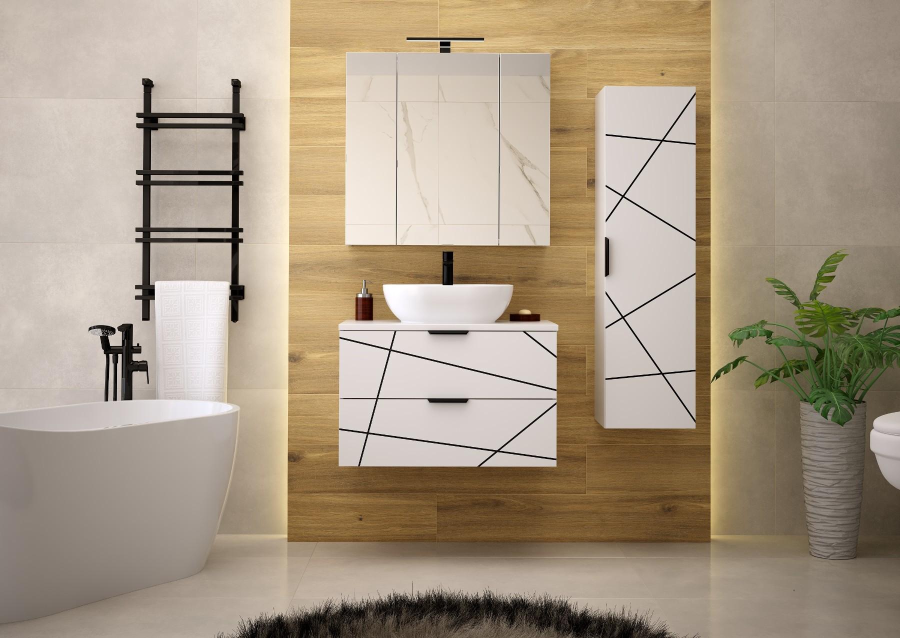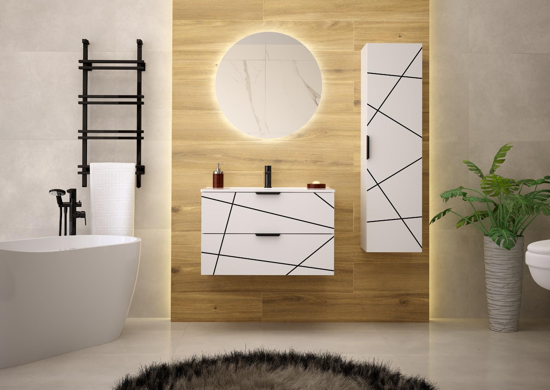 Die Kollektion umfasst Waschtischunterschränke (60 und 80 cm), einen Hochschrank, ein Regal und Arbeitsplatten, die mit Möbel- und Aufsatzwaschbecken, Spiegeln und Spiegelschränken kombiniert werden können. So können Sie die Möbel ganz einfach an Ihren Raum und Ihre Bedürfnisse anpassen, unabhängig von der Größe Ihres Badezimmers.