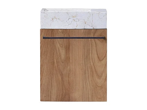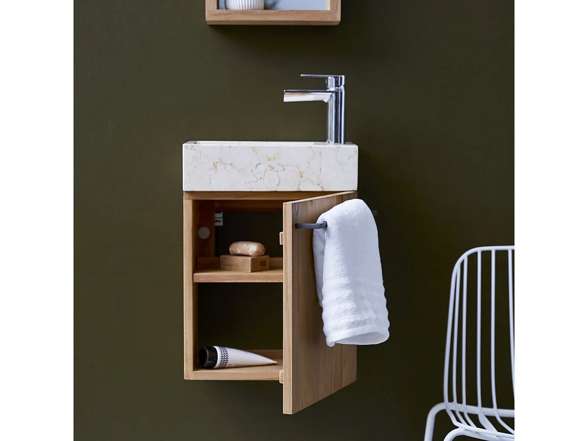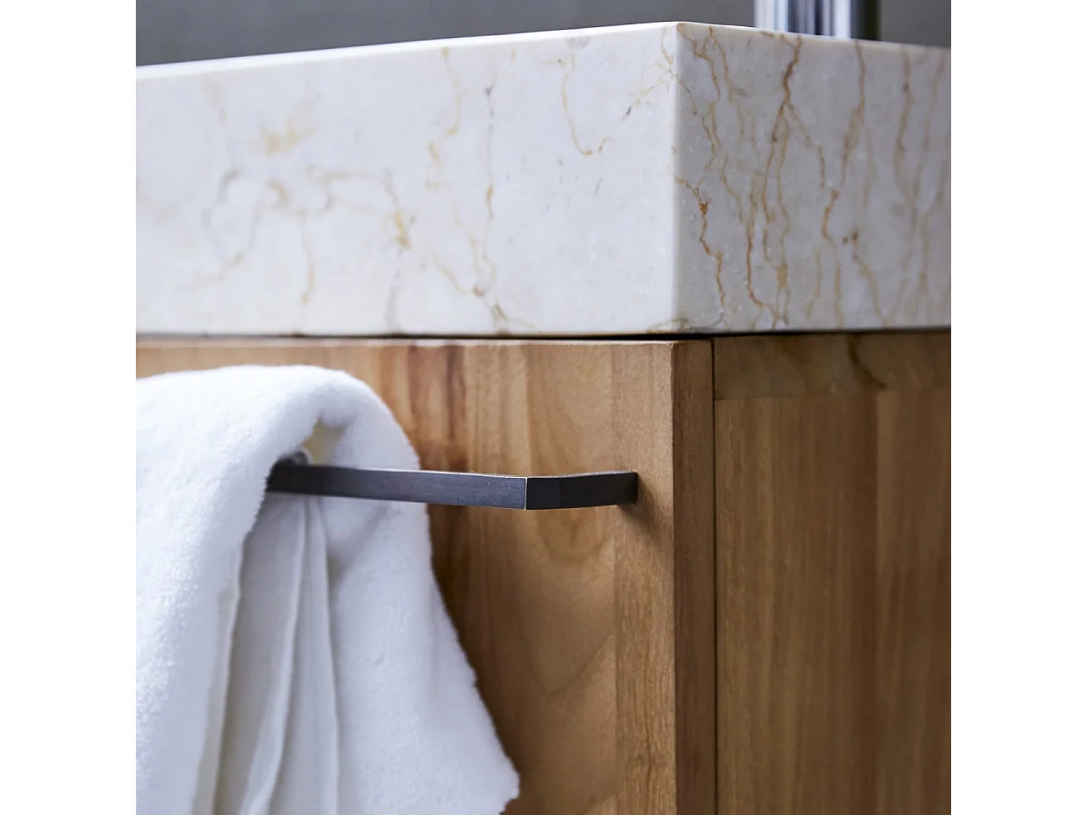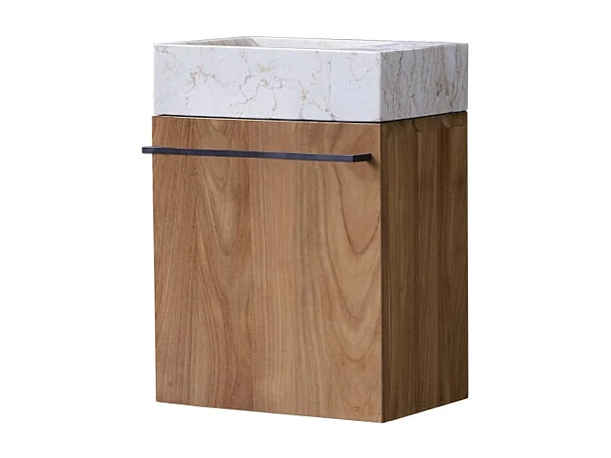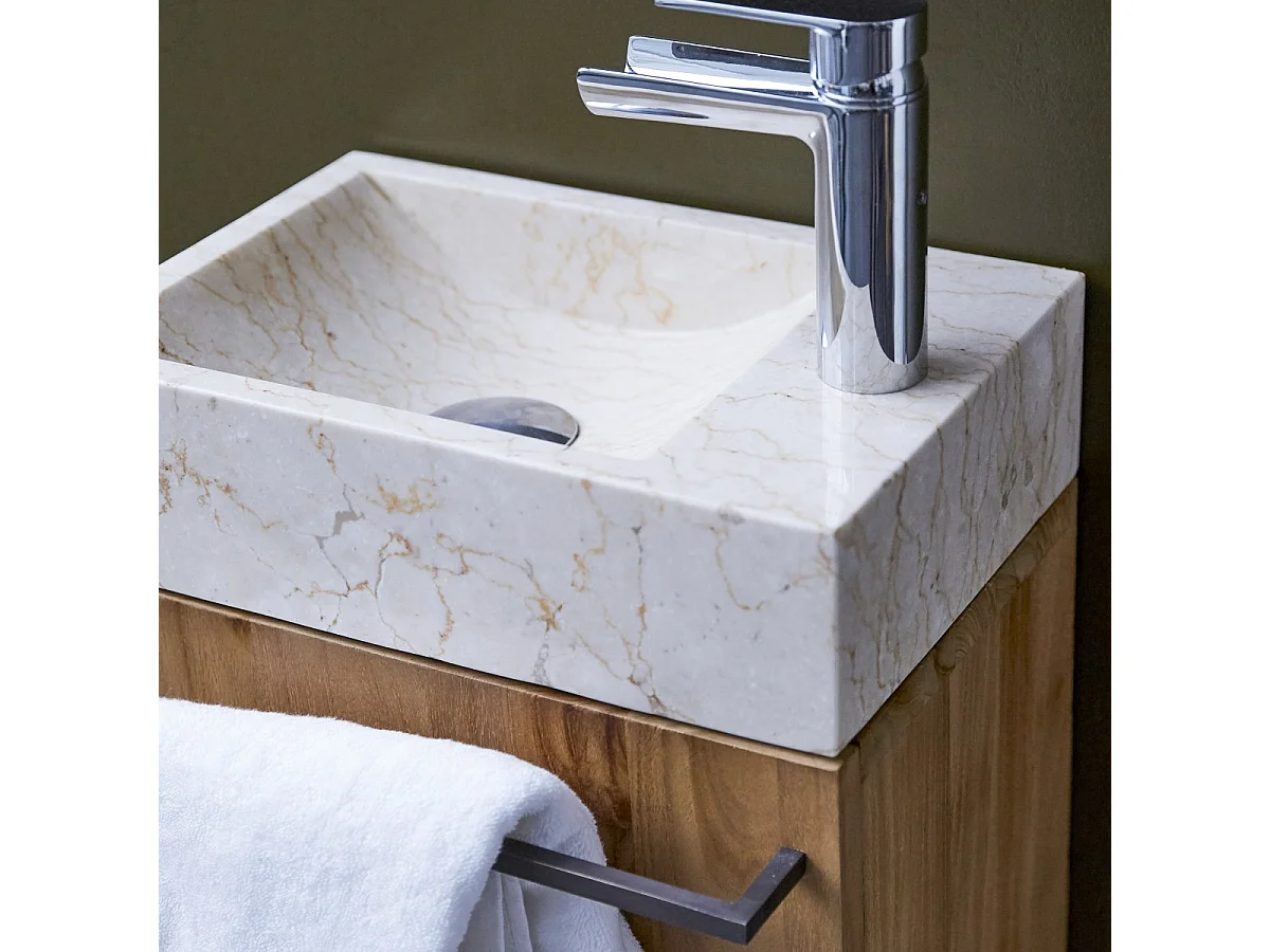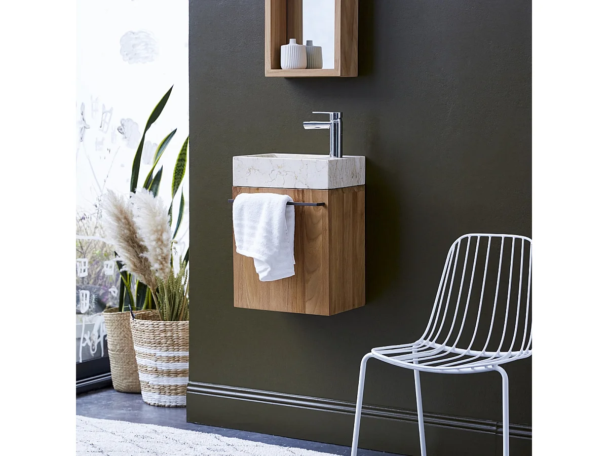 Badunterschrank hängend aus Teakholz mit cremefarbenem Marmorwaschbecken Stelle