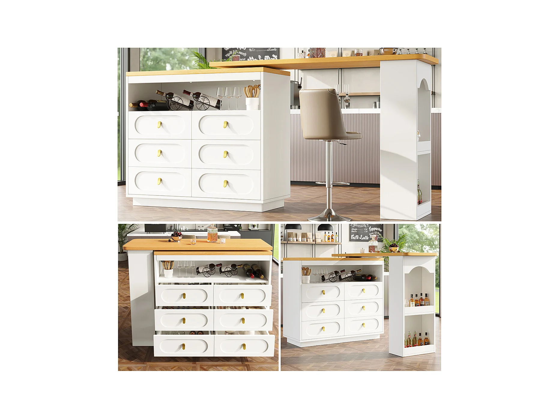 Bartisch mit 360° Drehfunktion und Stauraum Kücheninsel Hochtisch Küchentisch Längenverstellbar von 138-203cm Weiß