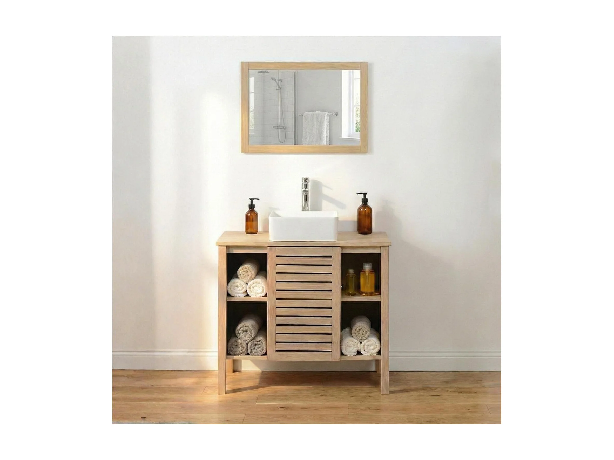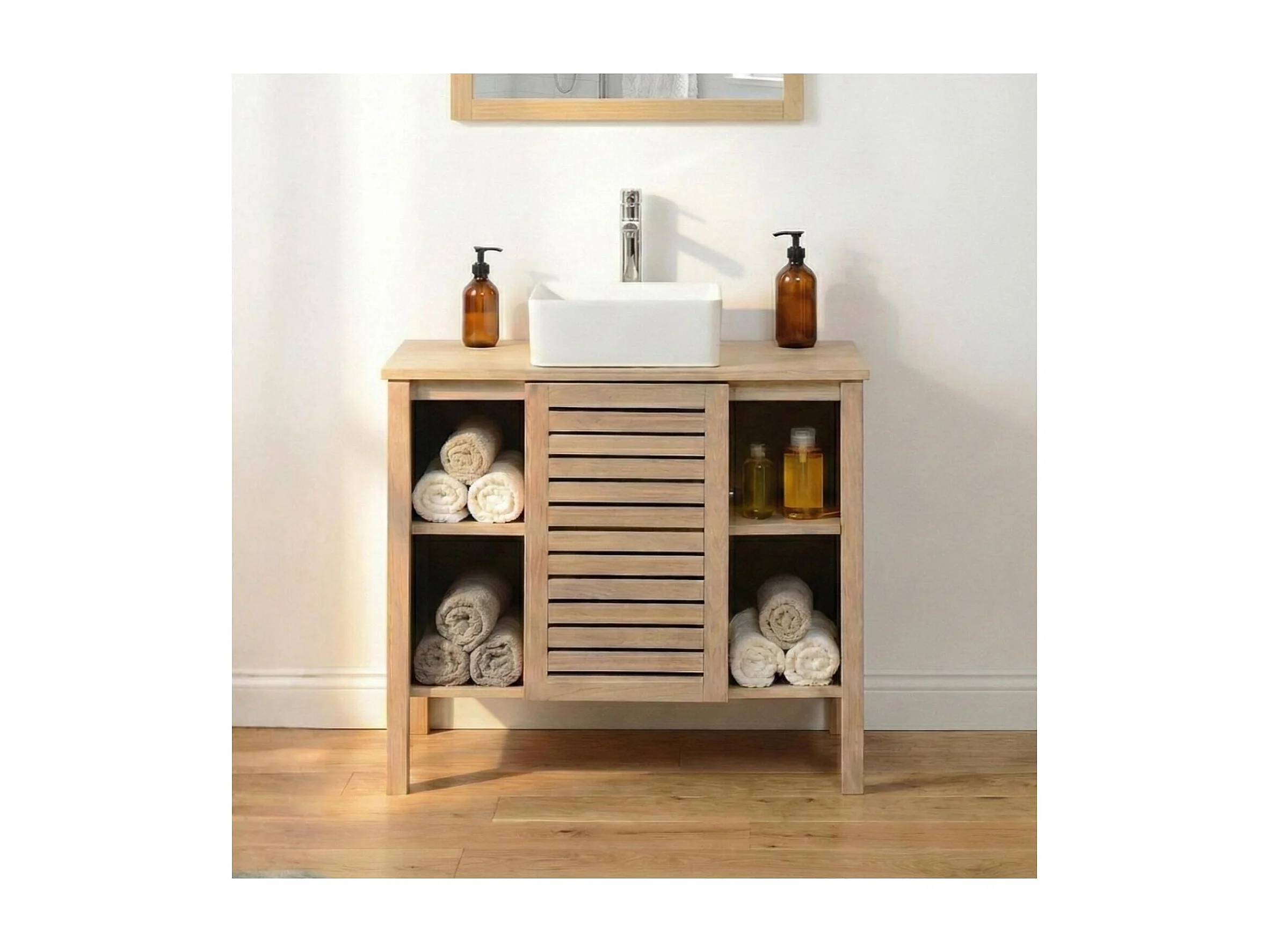 TALIX 90 cm Waschtischunterschrank aus Eiche Natur mit Einzelwaschbecken auf Beinen