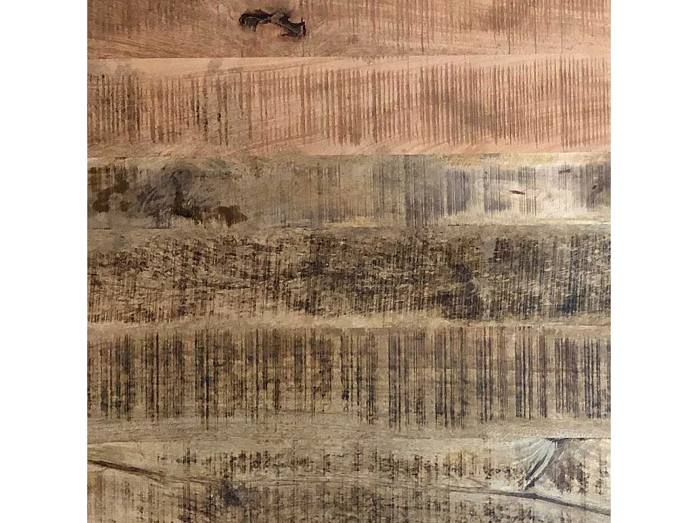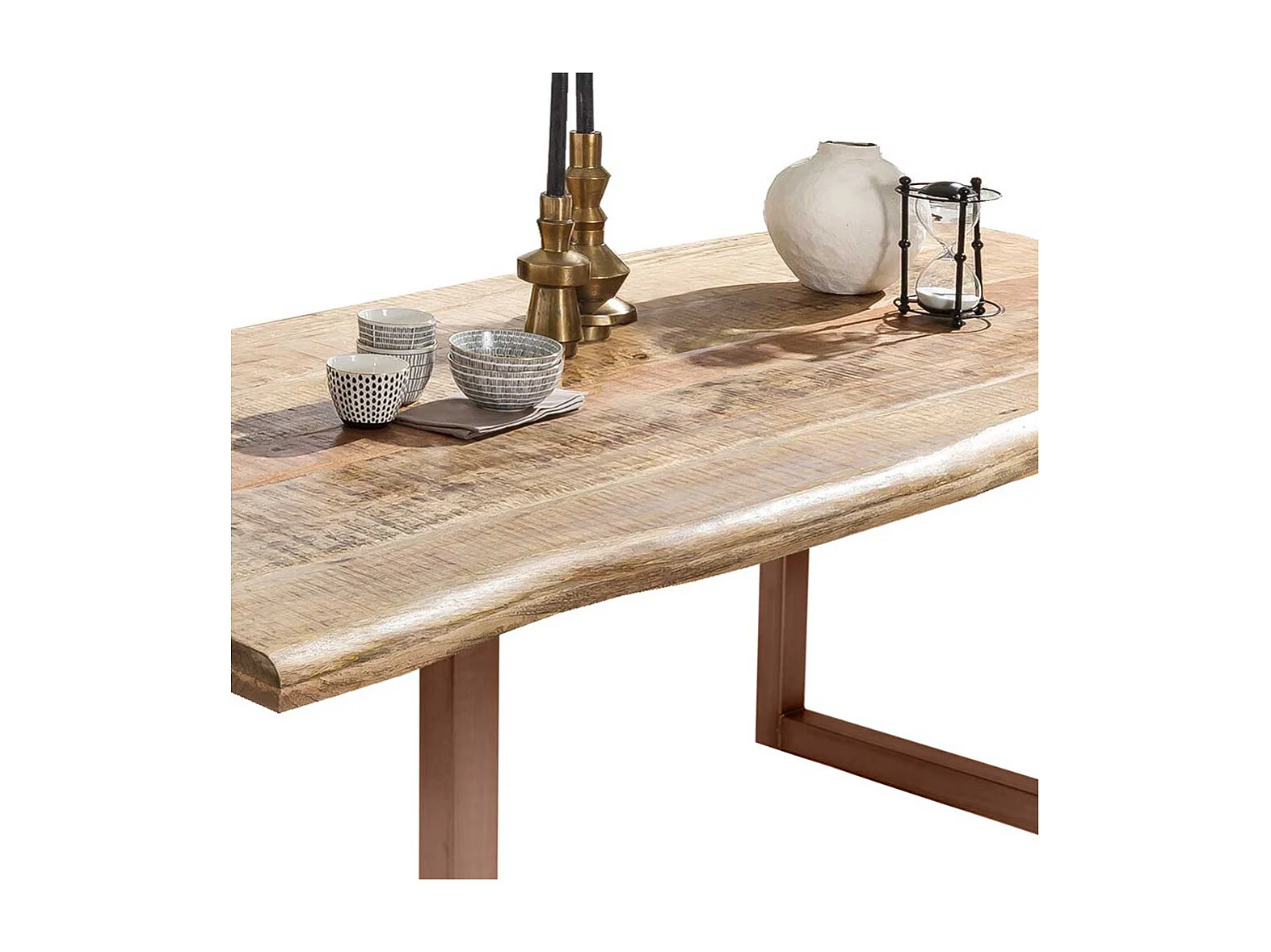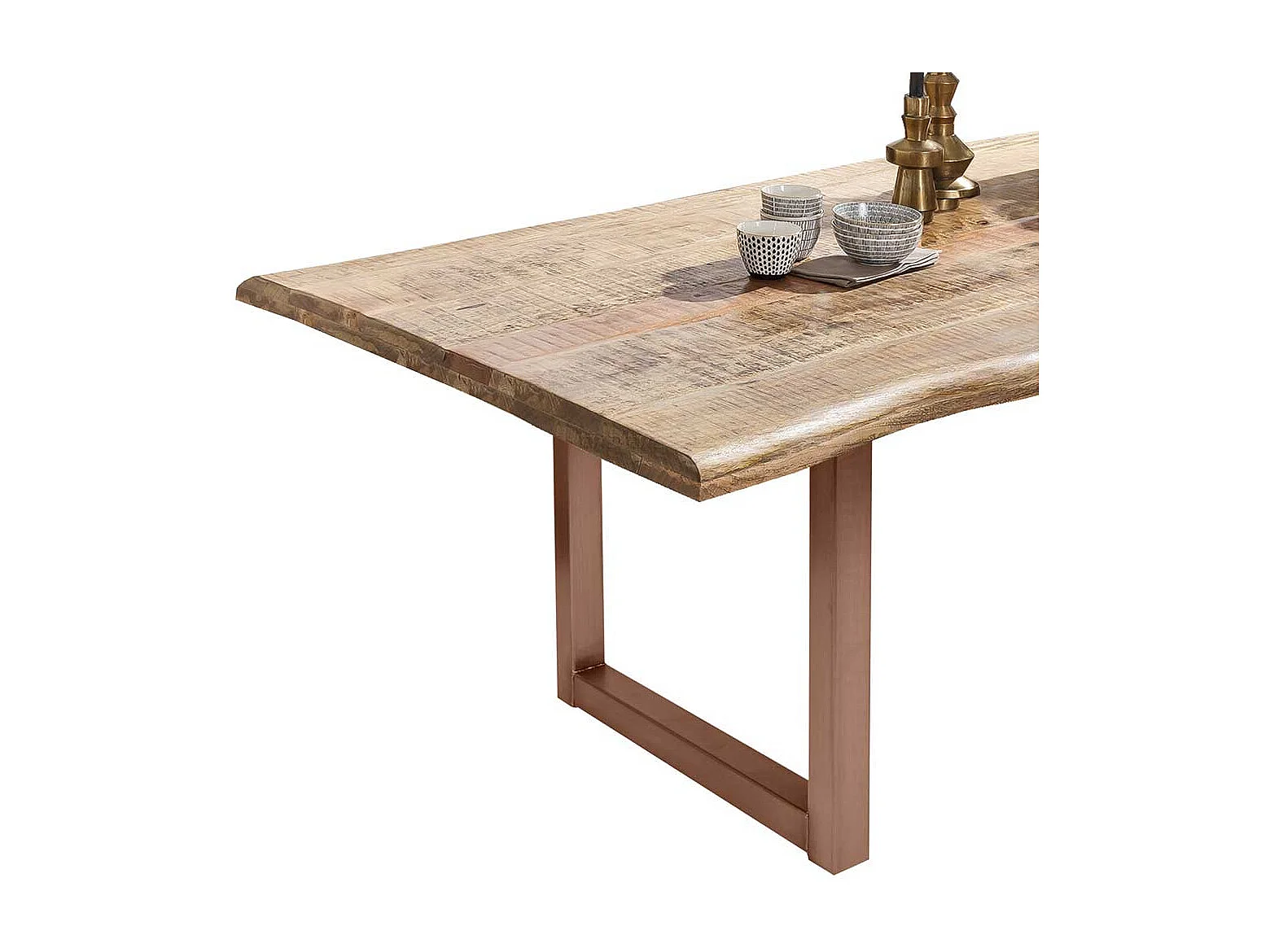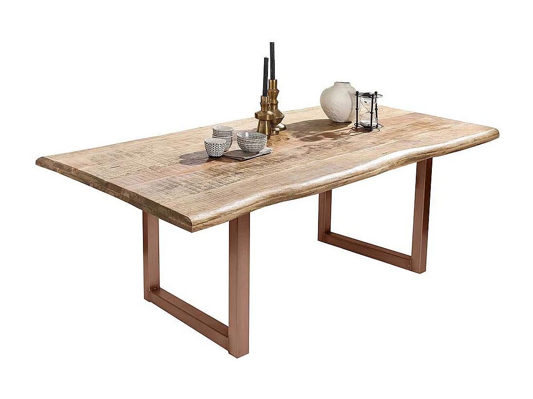 Baumkanten Esstisch aus Mangobaum Massivholz Bügelgestell in Braun