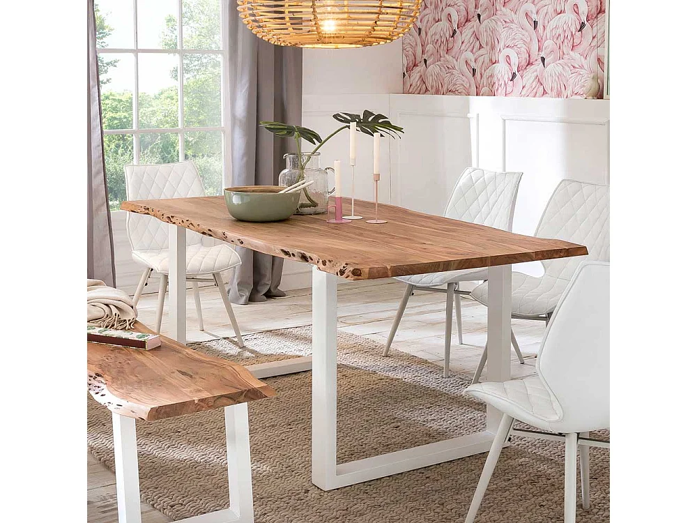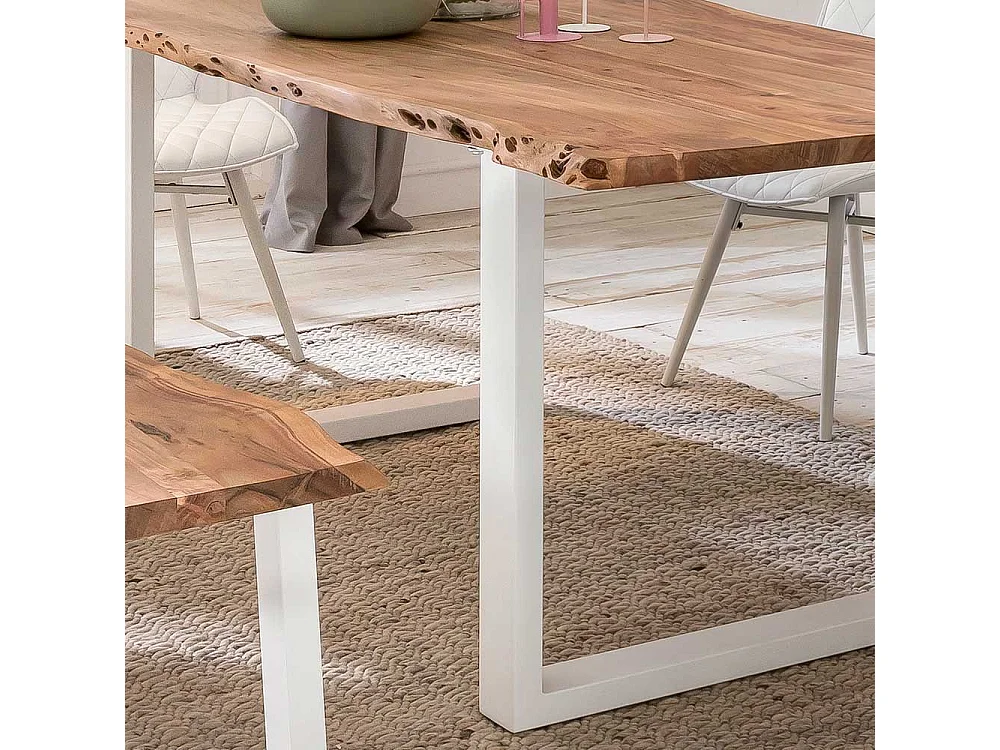 Baumkanten Esszimmertisch aus Akazie Massivholz Bügelgestell in Weiß