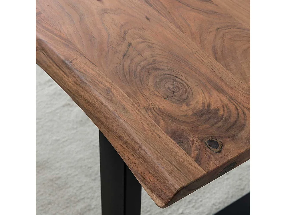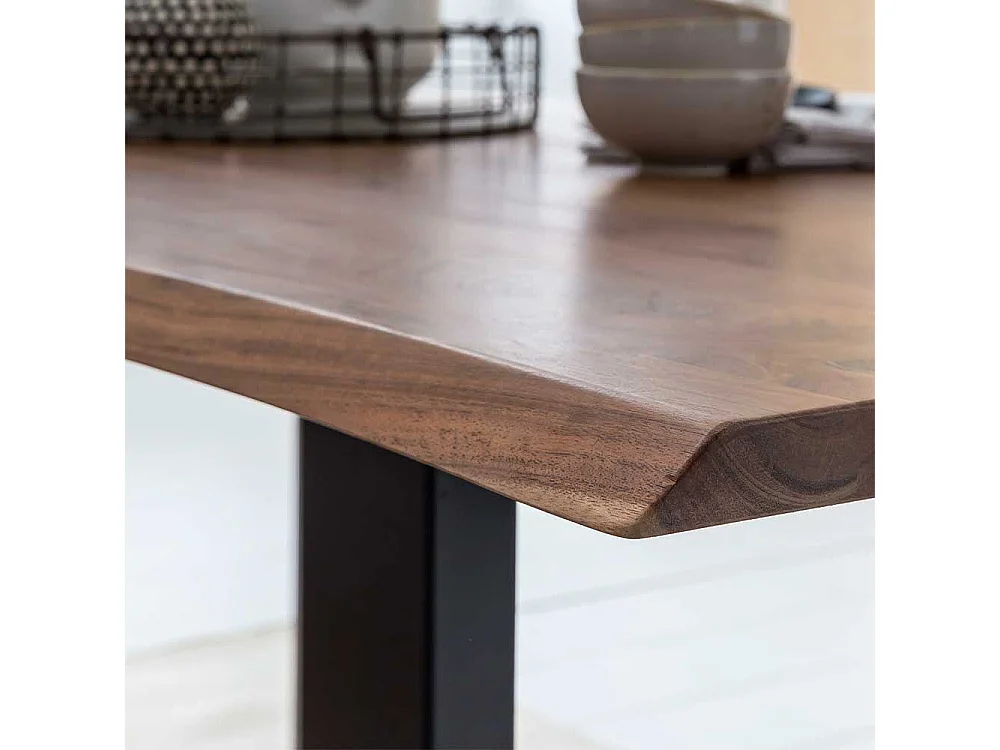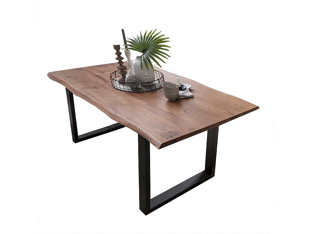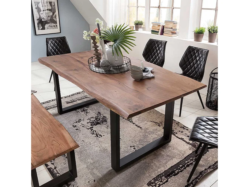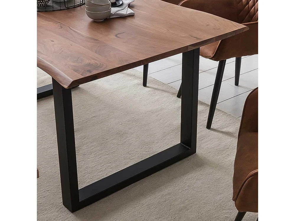Baumkanten Esszimmertisch aus Akazie Massivholz schwarzem Bügelgestell
