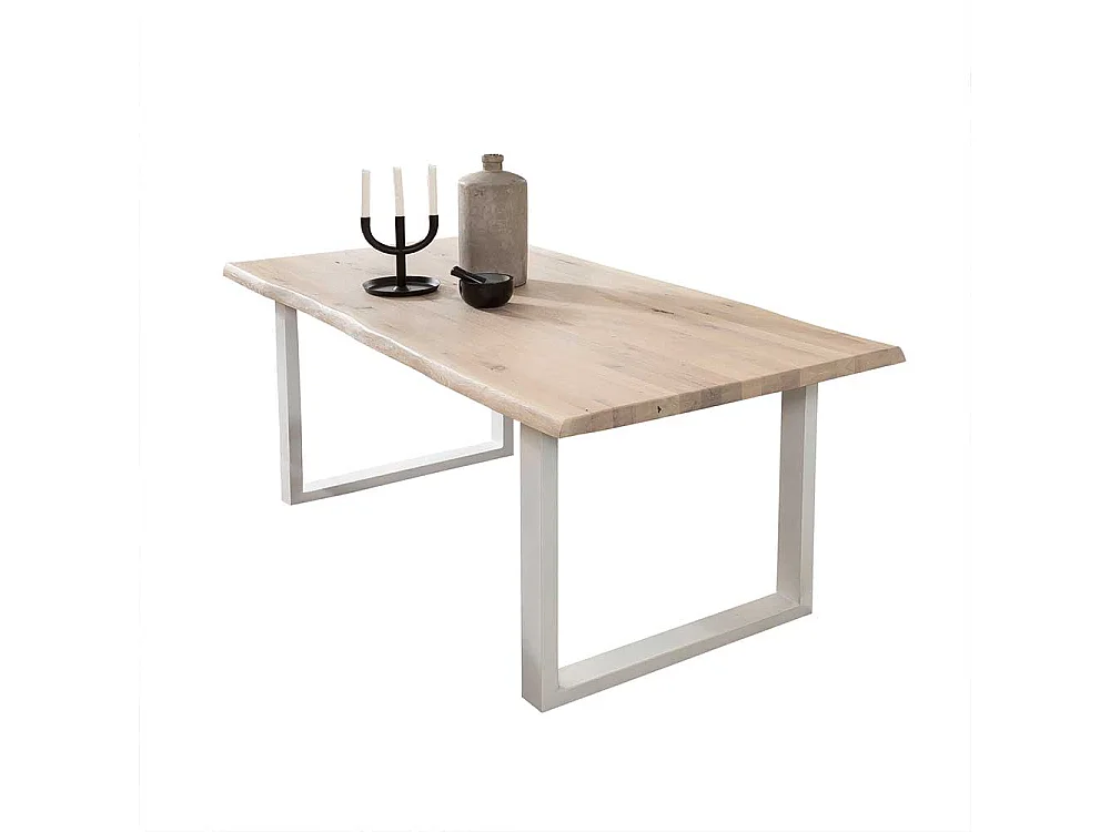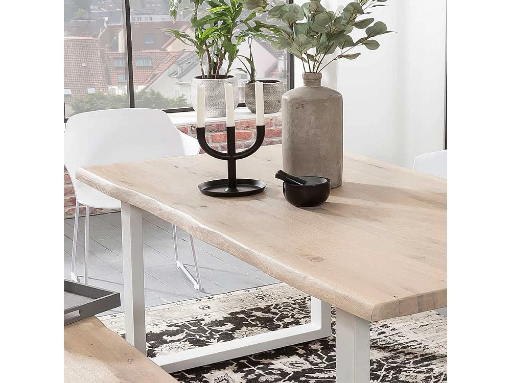 Baumkanten Esszimmertisch aus Eiche White Wash massiv Bügelgestell in Weiß