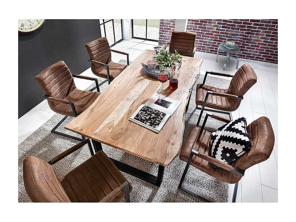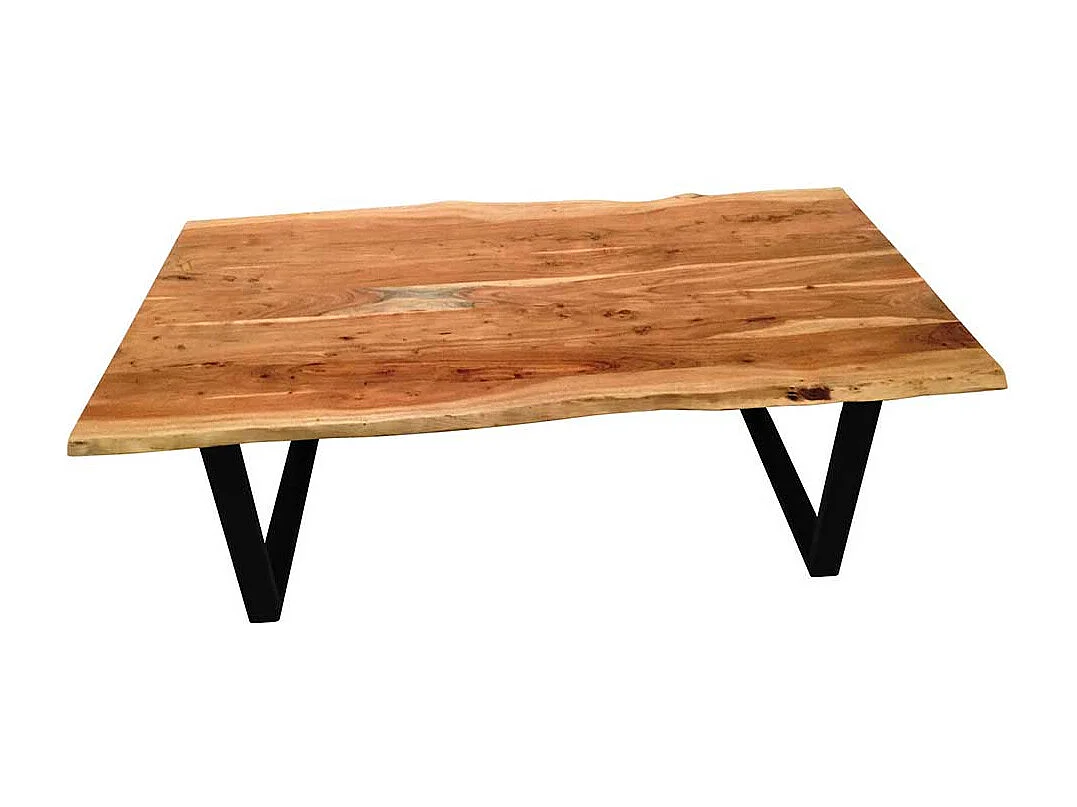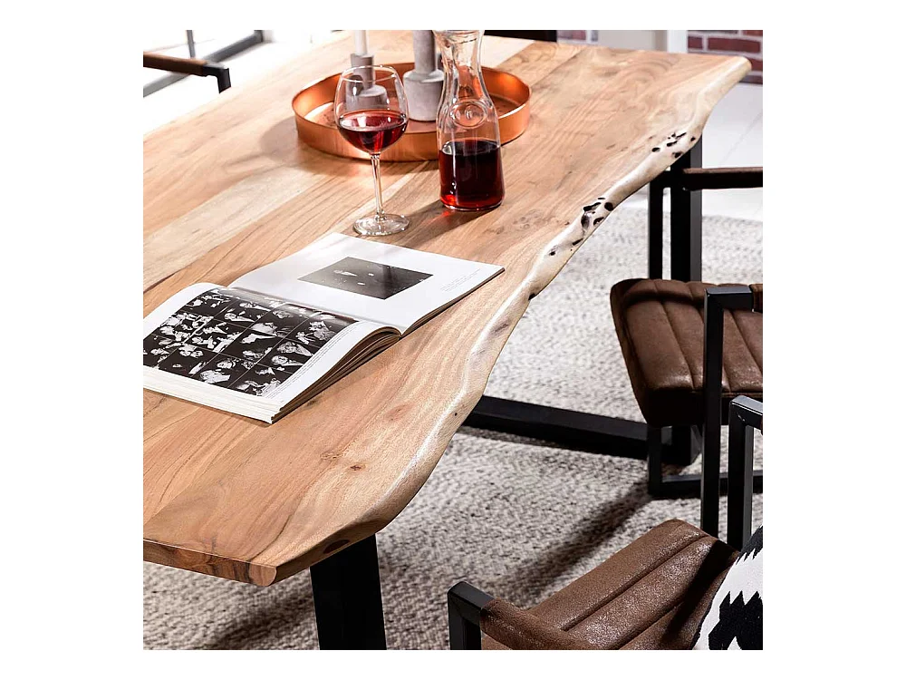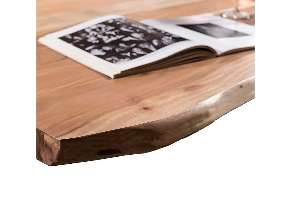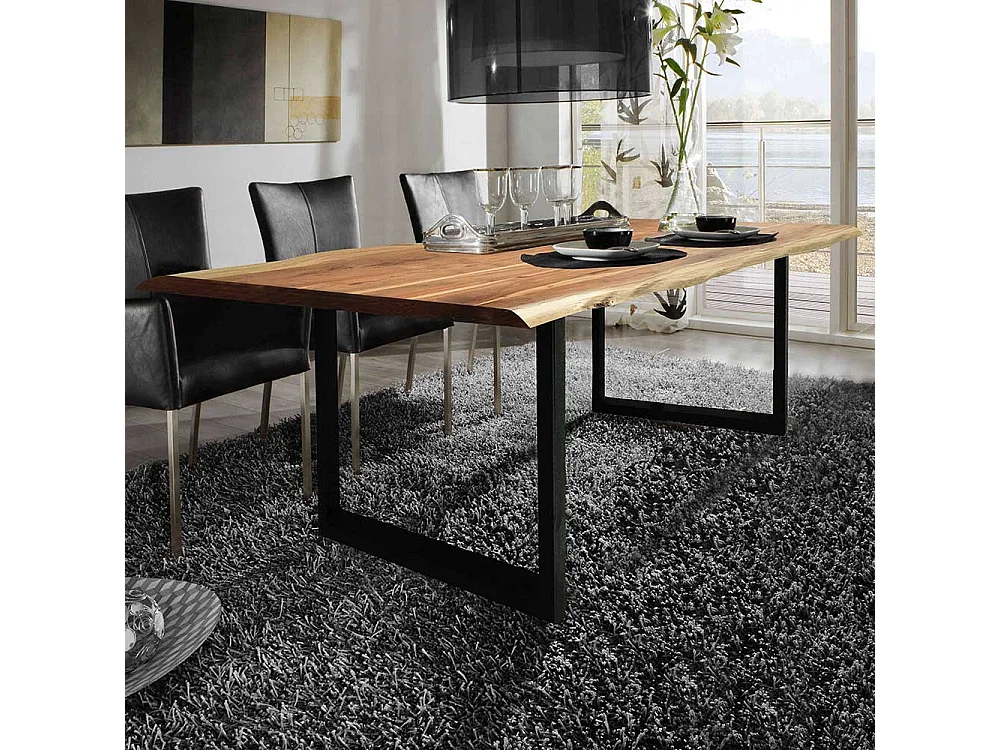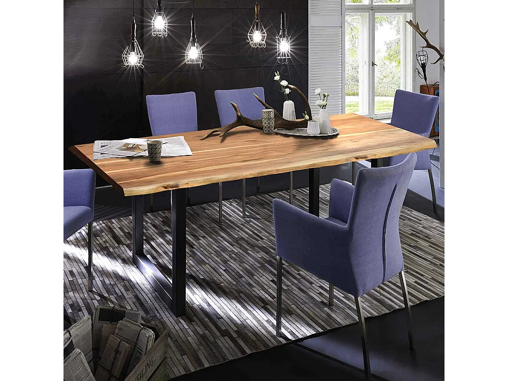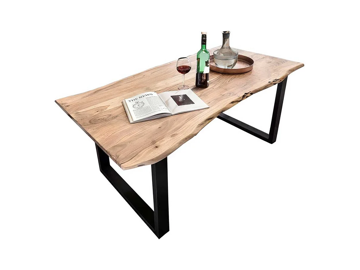 Baumkanten Küchentisch aus Akazie Massivholz Bügelgestell