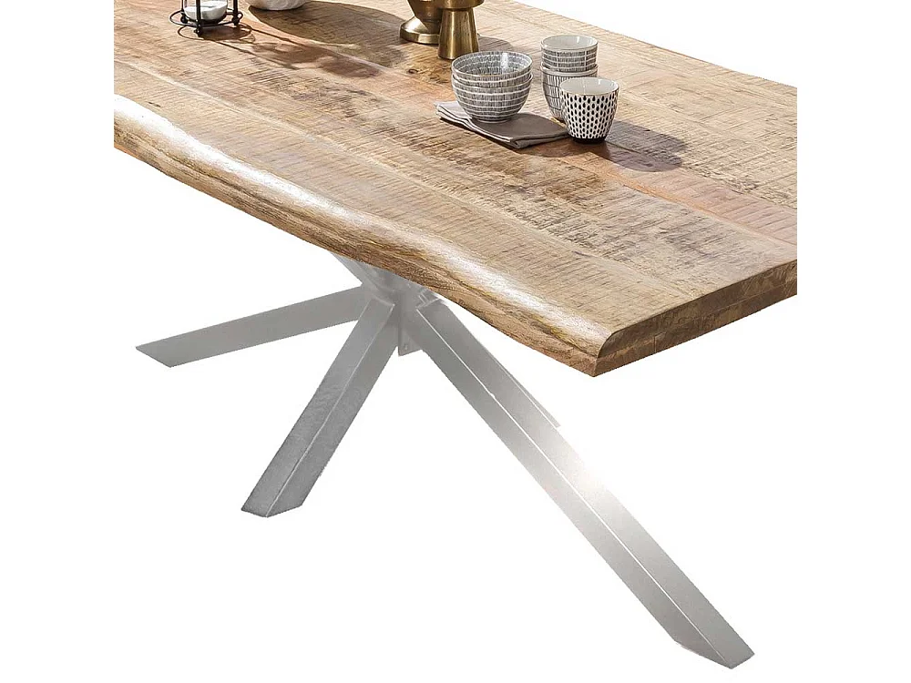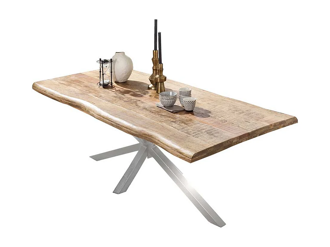 Baumkantentisch aus Mangobaum Massivholz Spider Gestell in Altsilberfarben