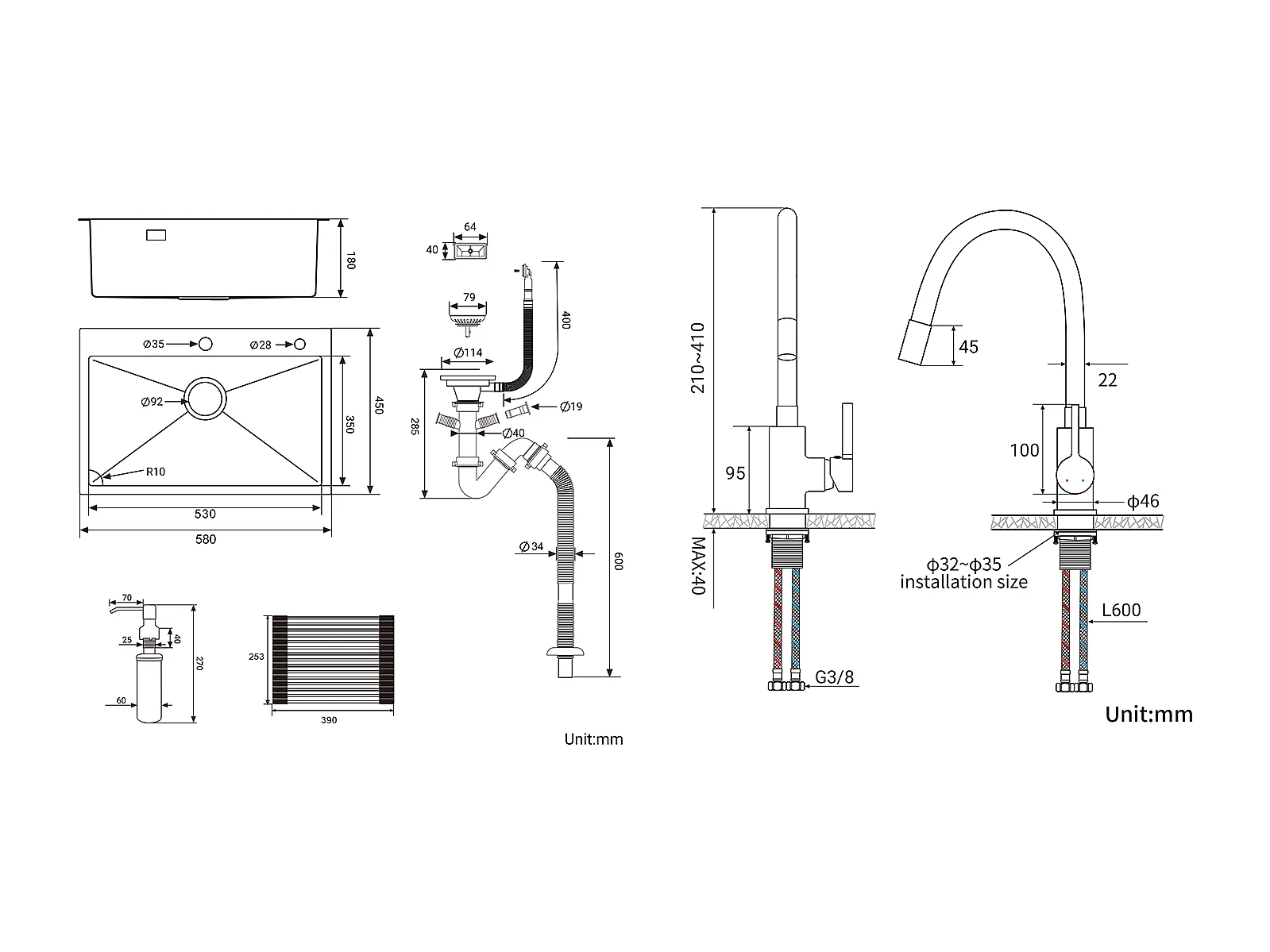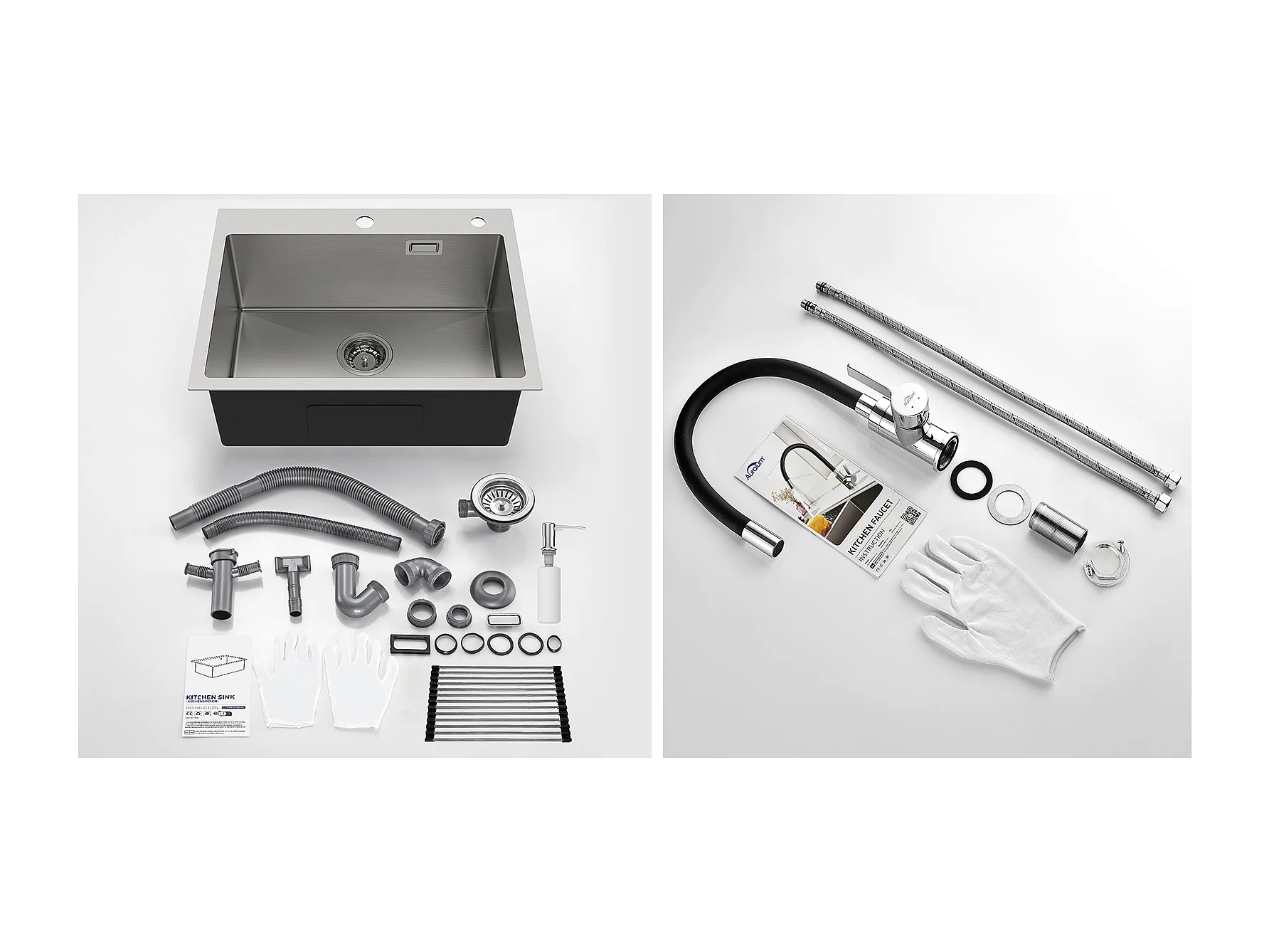 Becken gebürstetes Küchenspülbecken, 58 x 45 x 18 cm, aufrollbare Abtropffläche, Seifenspender + flexibler Küchenhahn mit hohem Schwenkauslauf