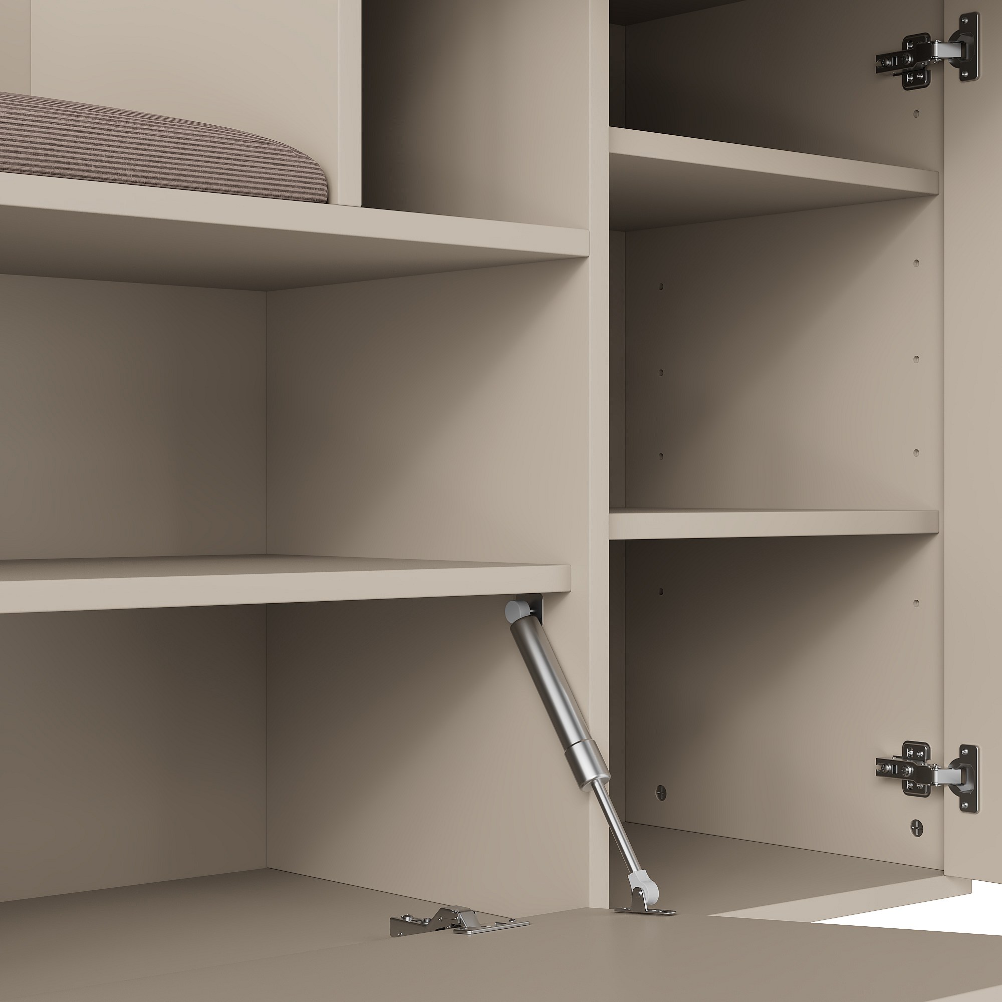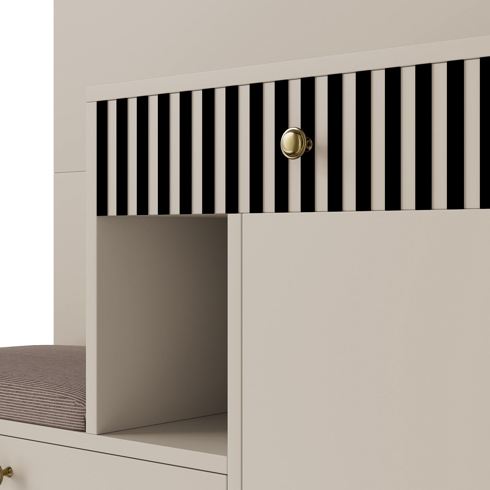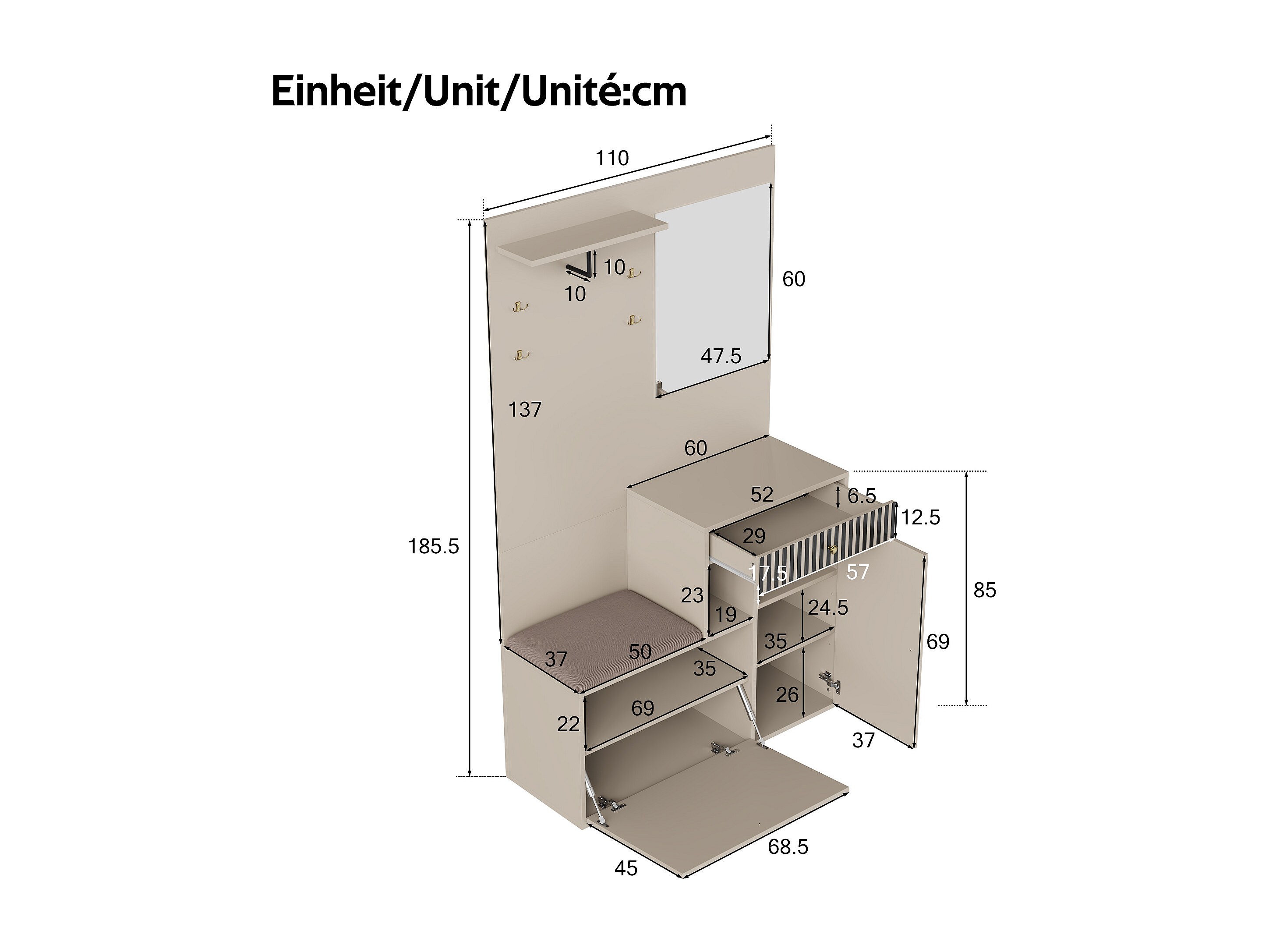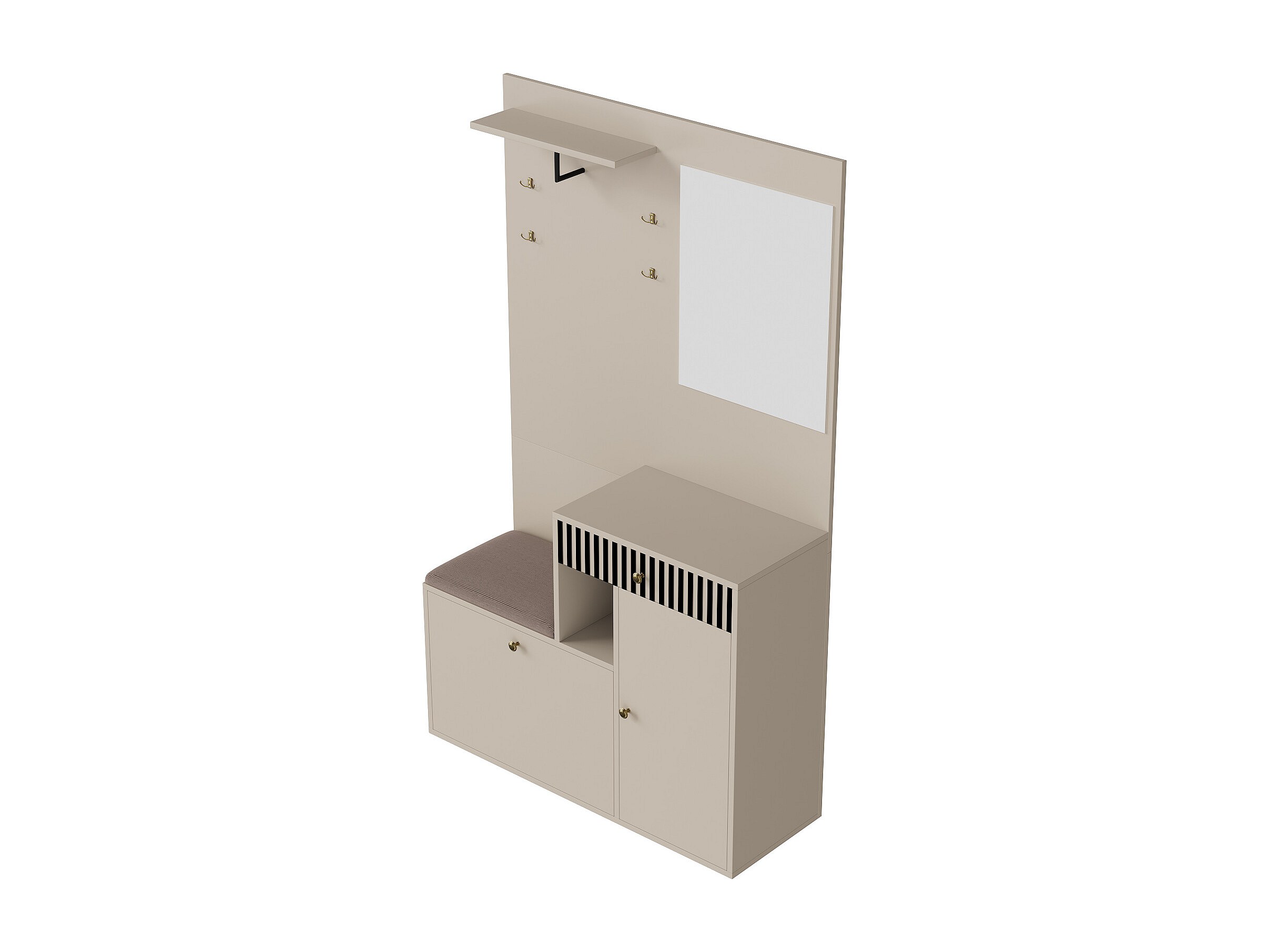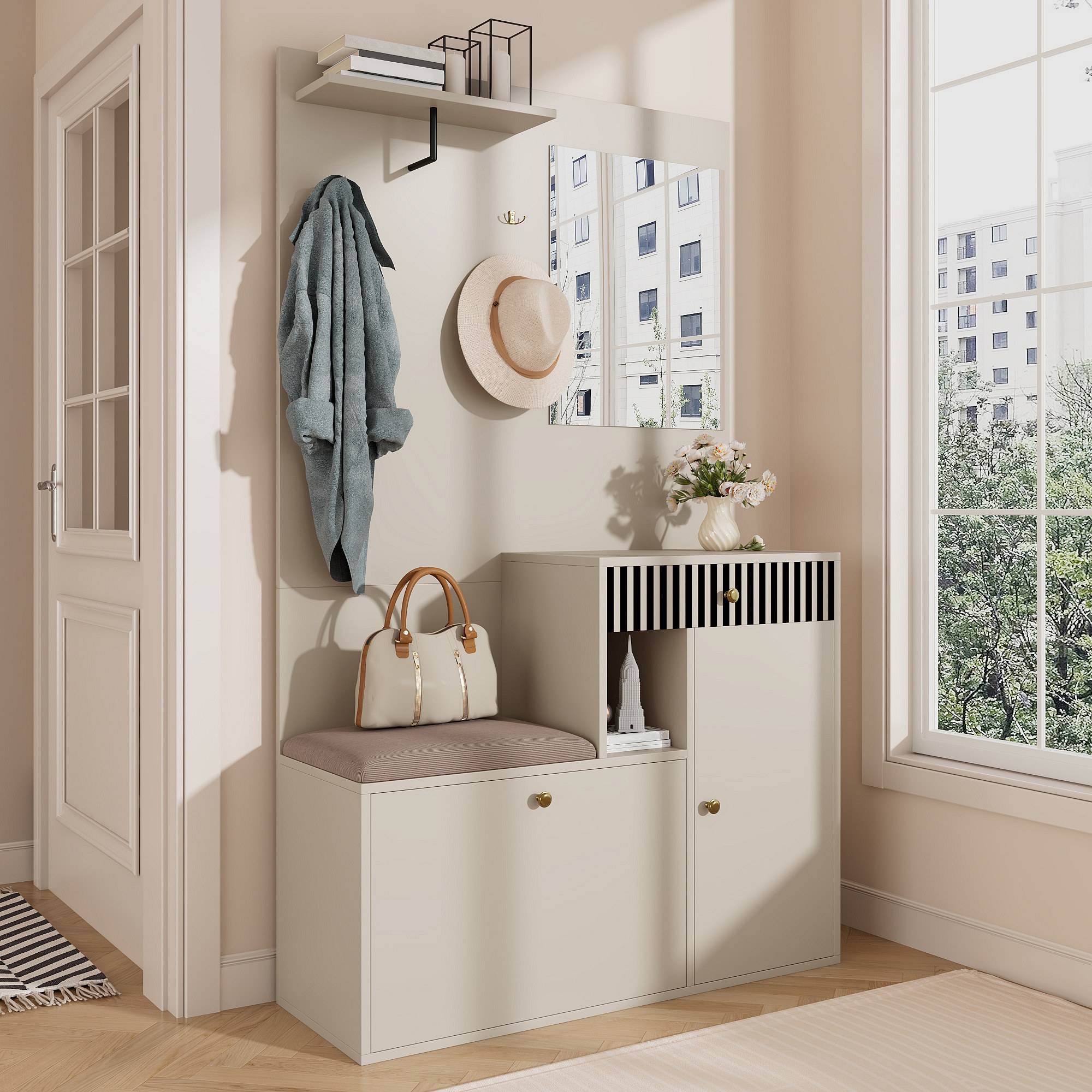 Beige Garderobe mit Spiegel – Kleiderschrank mit 1 Schublade und 2 Türen – mit Kissen und Haken