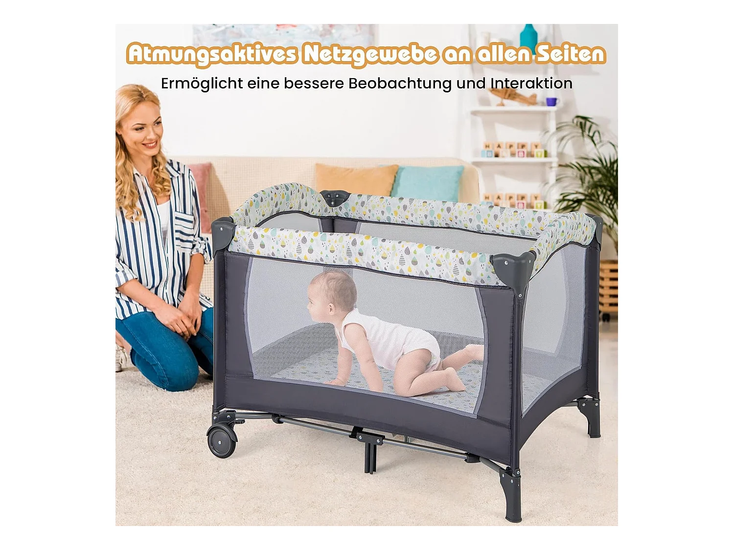 3 in 1 Beistellbett klappbar, Reisebett mit Matratze, Wickeltisch & Tragetasche, 2 Ebene Babybett mit Rollen für Baby bis 36 Monaten NQ32243