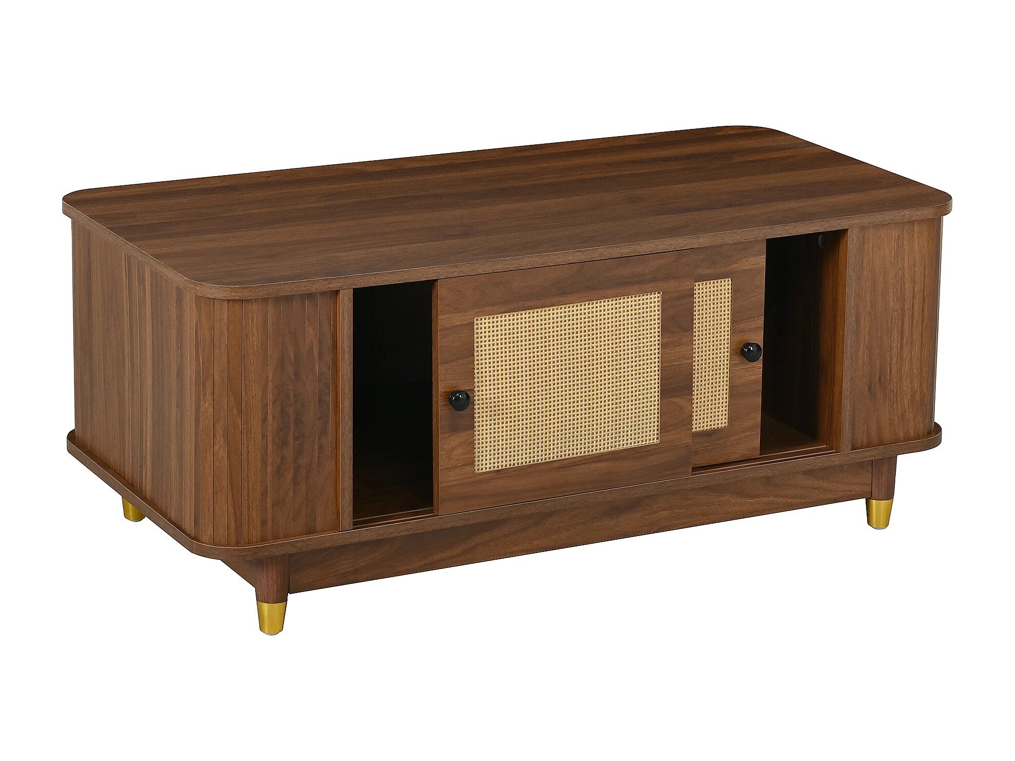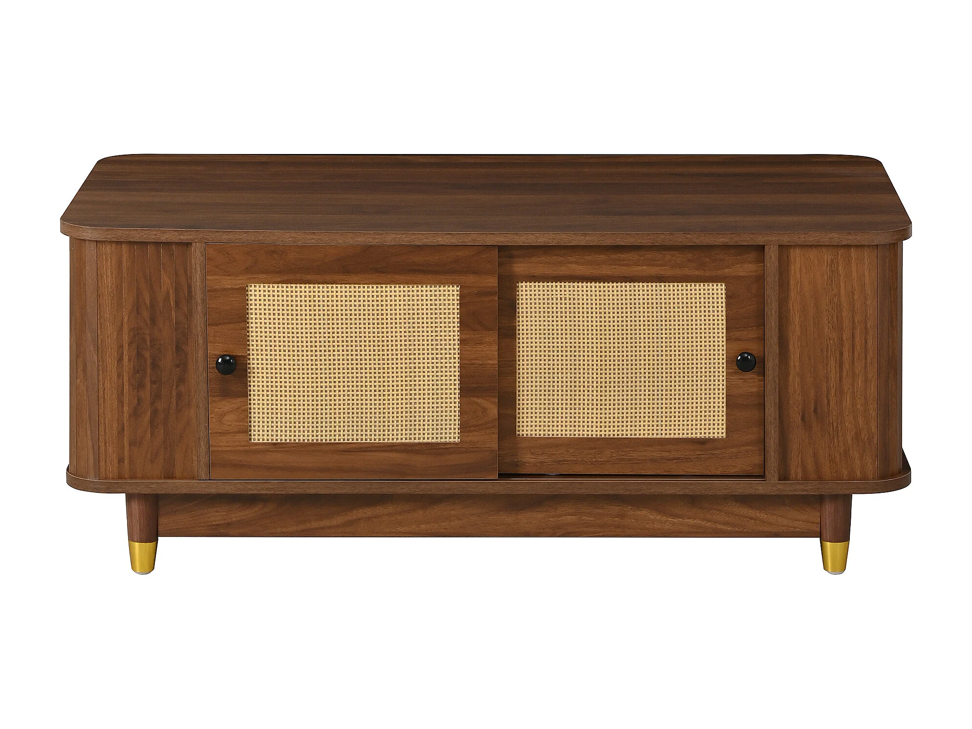Beistelltisch aus Rattan 100x50x42 cm - 2 Schiebetüren - Abgerundete Ecken - Stauraum - Holzoptik - MDF - Braun