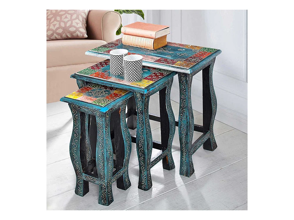 Beistelltisch Set in Blau und Bunt Shabby Chic Design (dreiteilig)