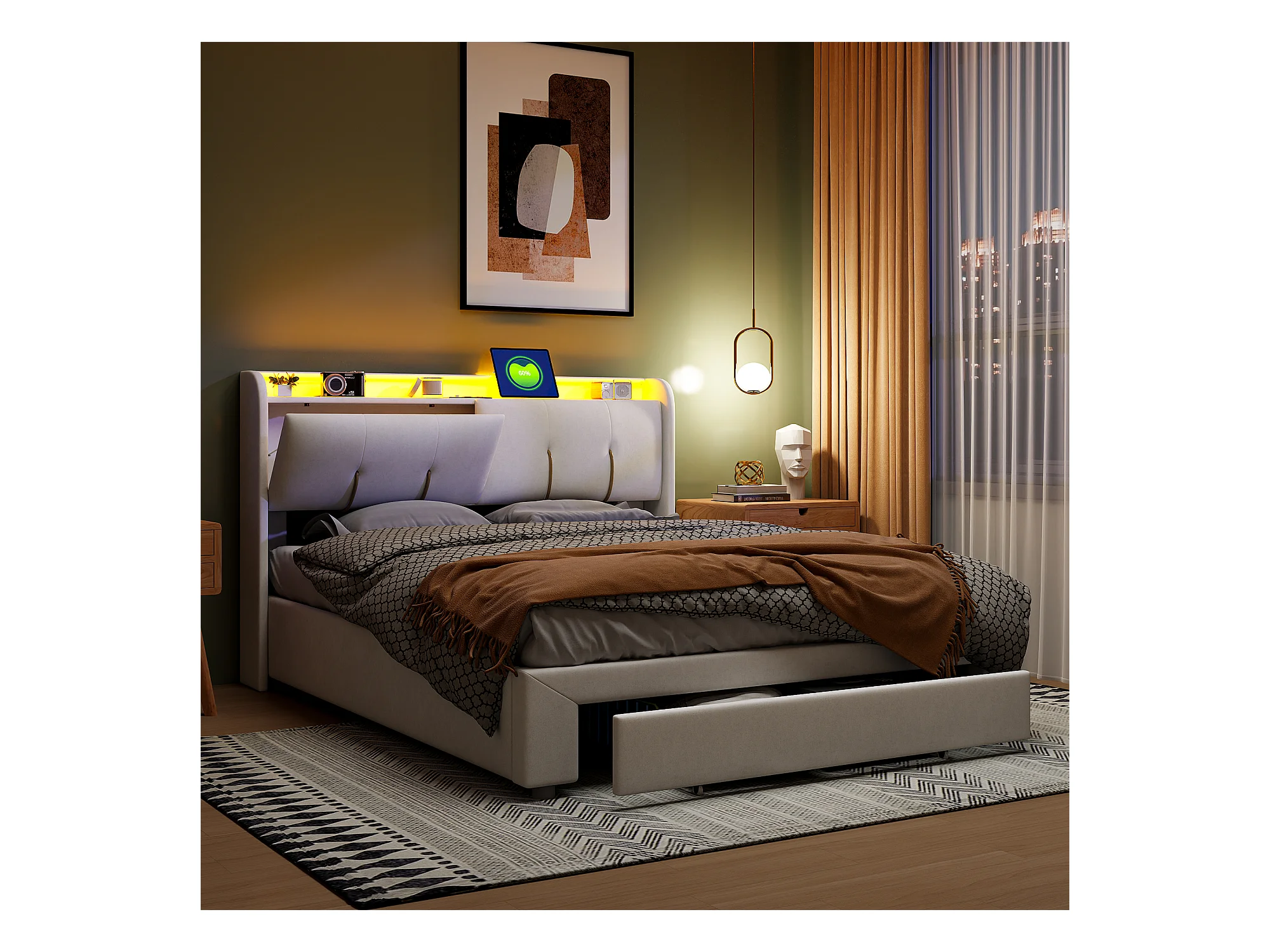 Beleuchteter Koffer 160x200, beleuchteter Doppelkapitonné, Tête de Lit mit Rangement Caché, Velours, weiß