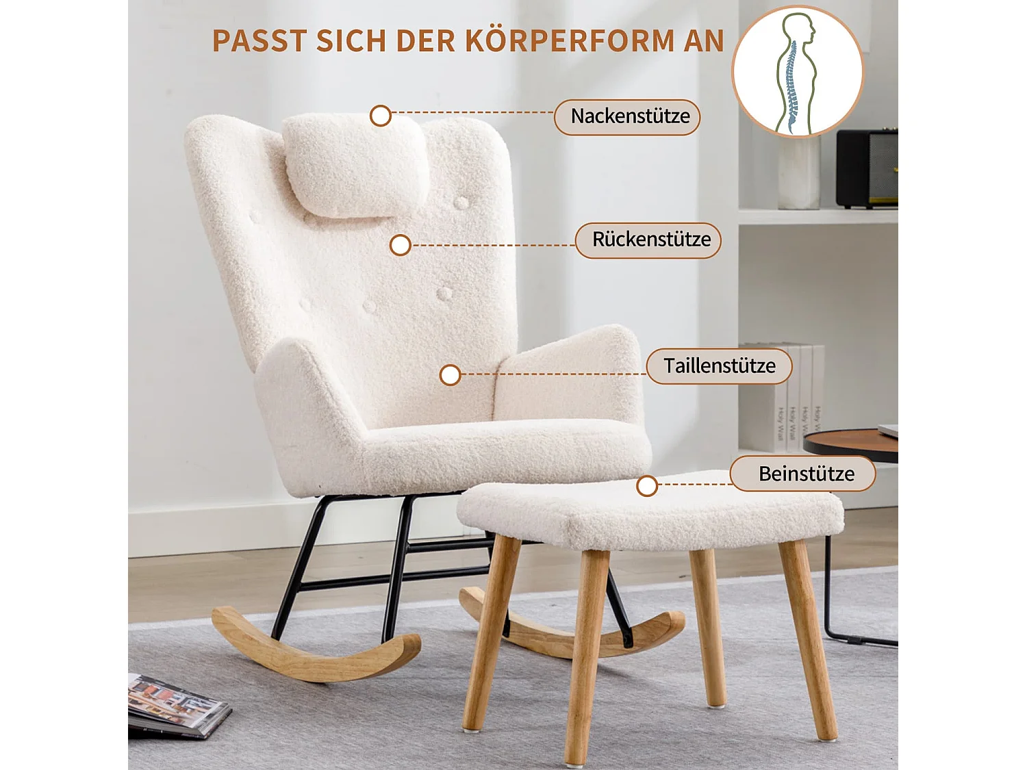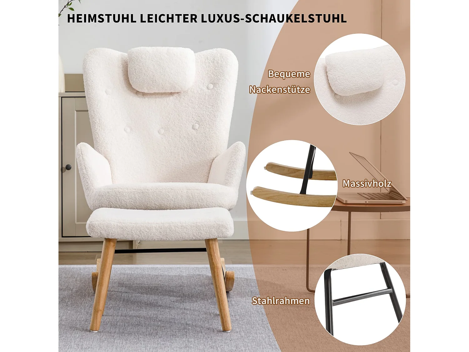 Bequemer weißer Schaukelstuhl, weicher Teddyplüsch-Schaukelstuhl mit Kopfstütze und Fußstütze - Belastbarkeit bis 100 kg