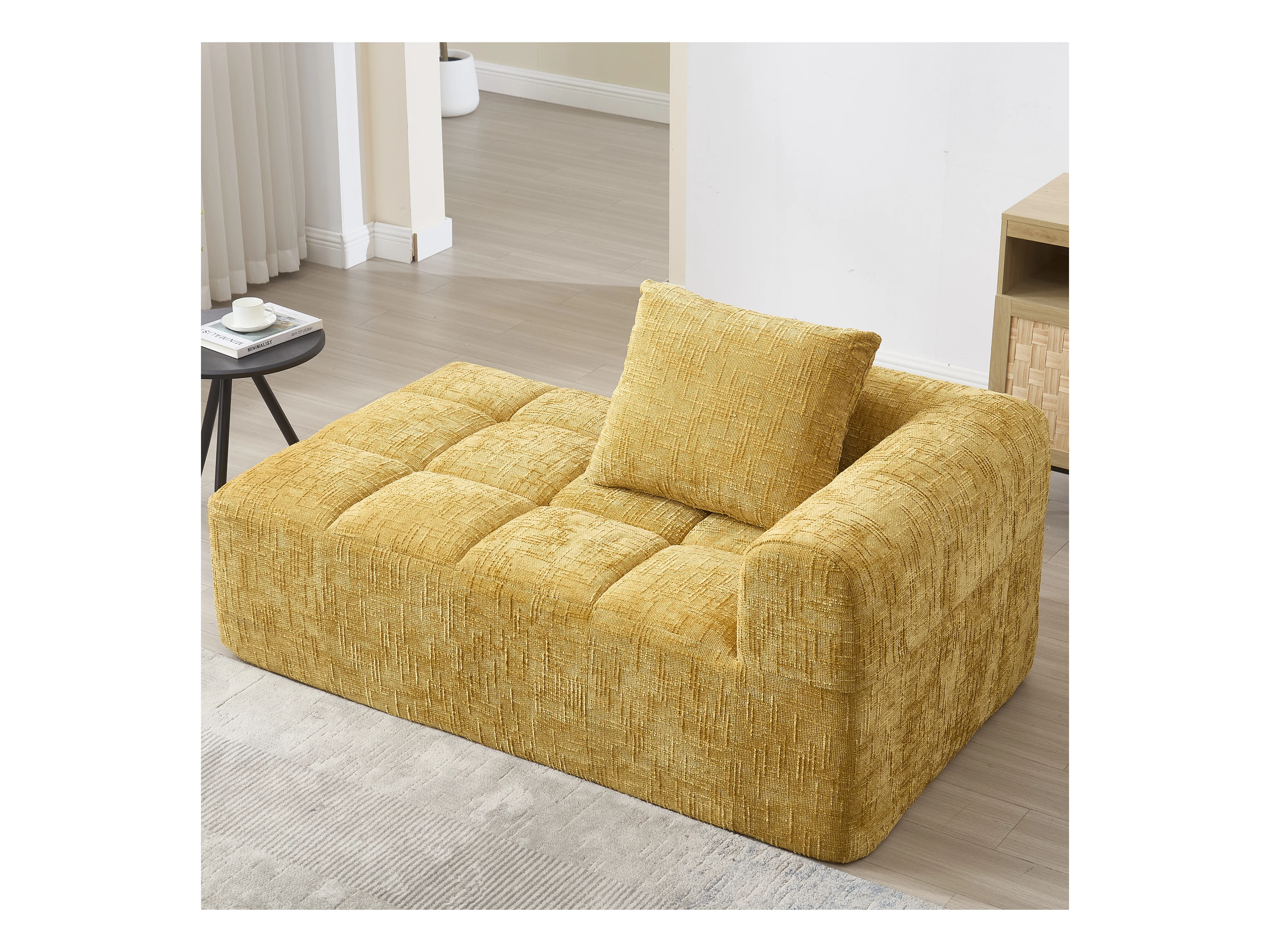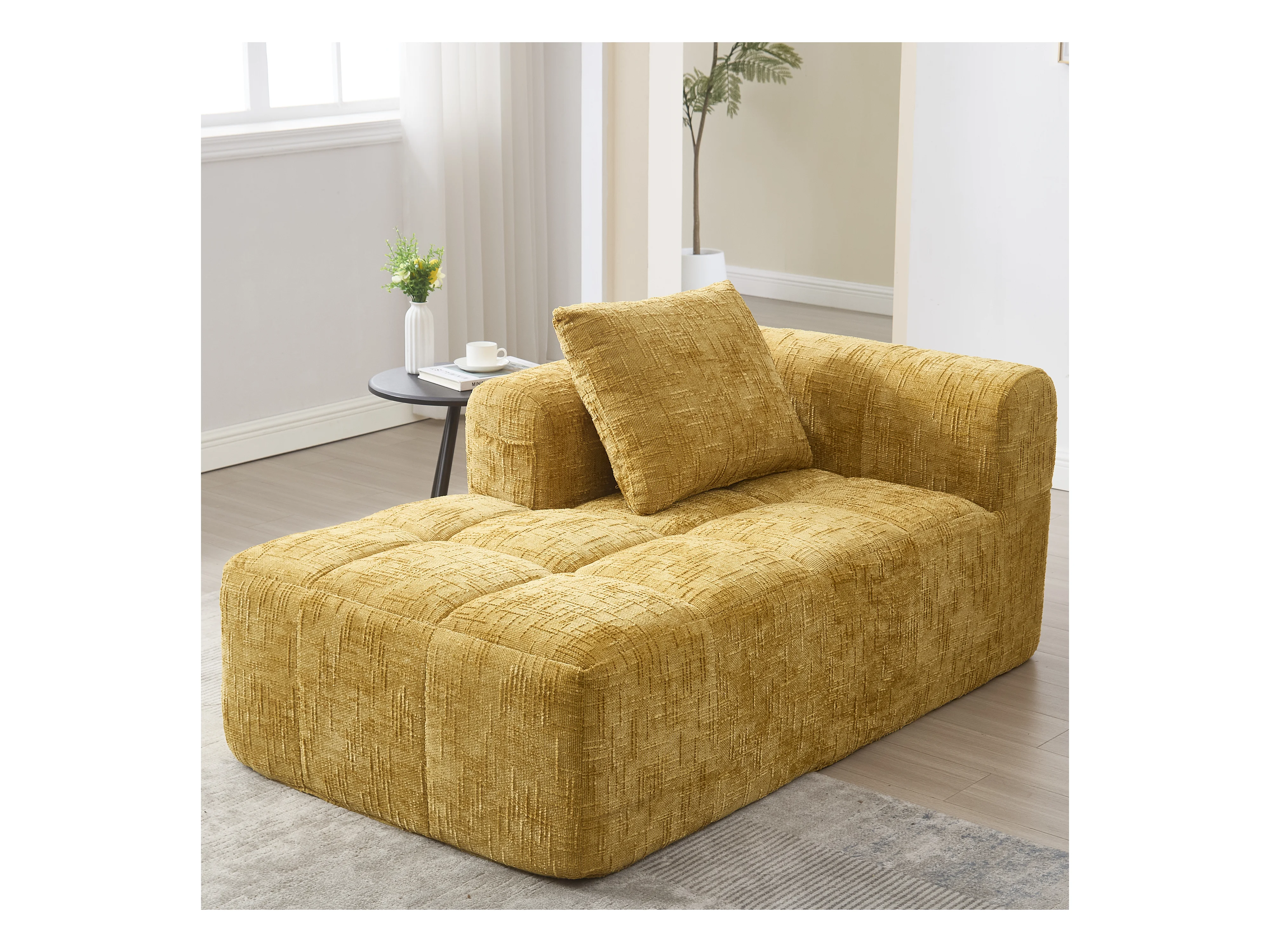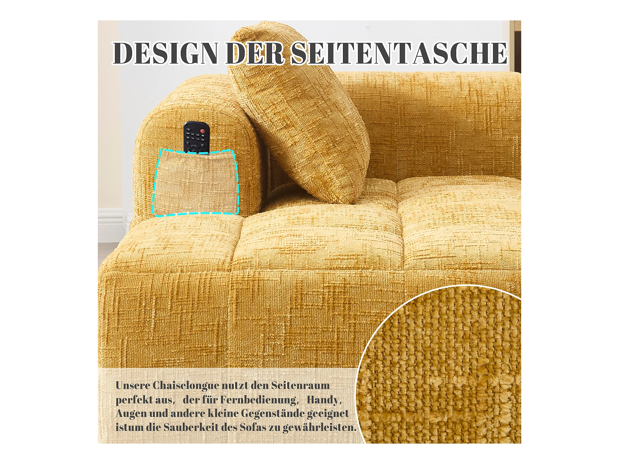 Bequemes Chaiselongue-Sofa – 158 x 90 x 60 cm – einfacher Aufbau – mit Kissen und Taschen – Samt – gelb