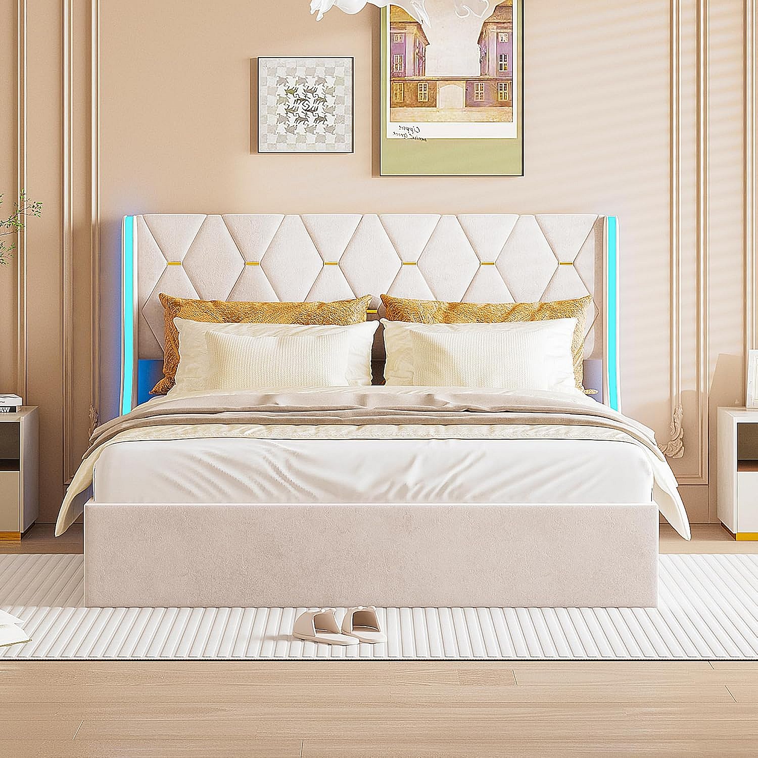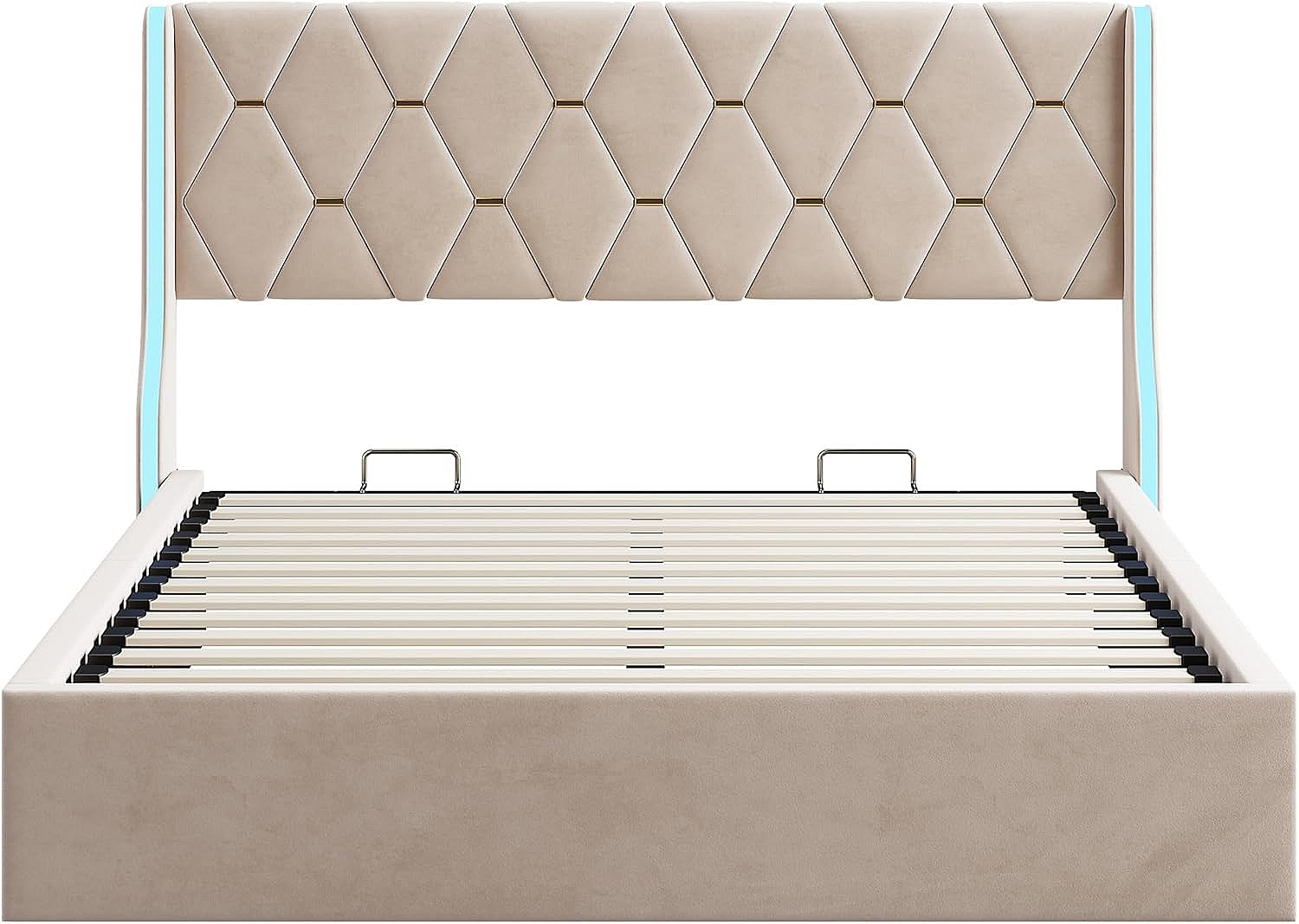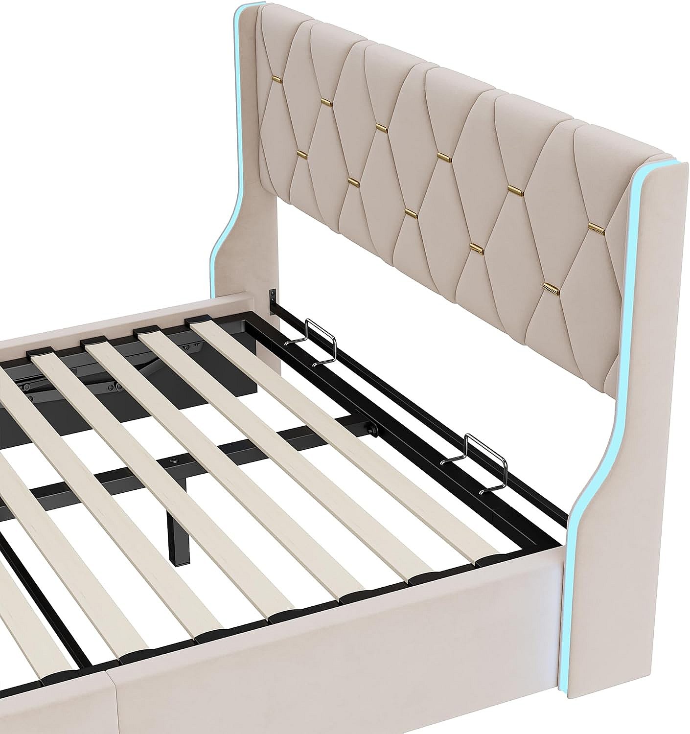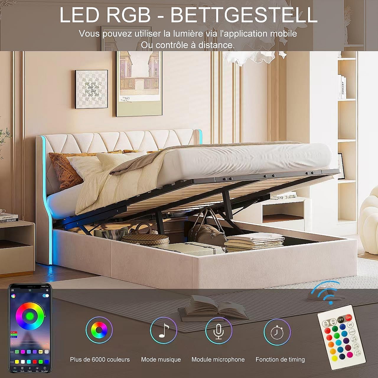 Bett 140x190 cm mit Lattenrost und LED, Stauraumbett 140x190 Lattenrost, Samt, Beige