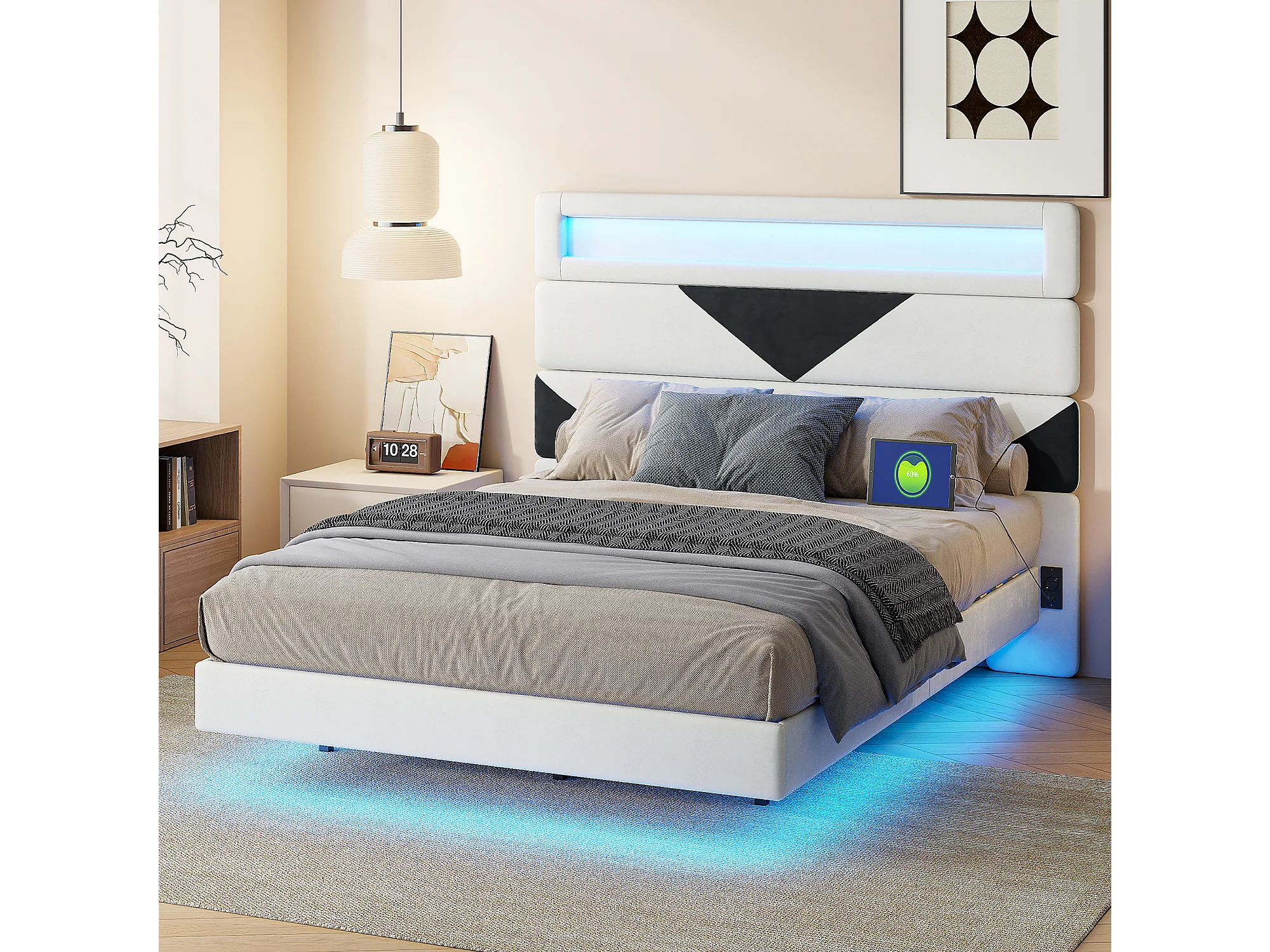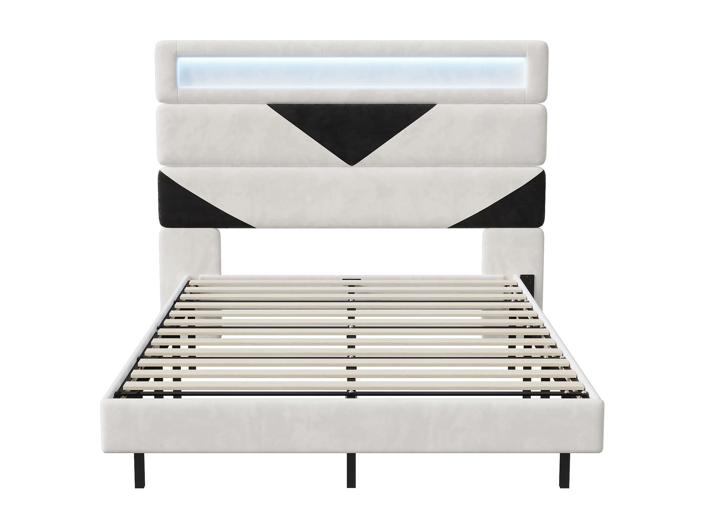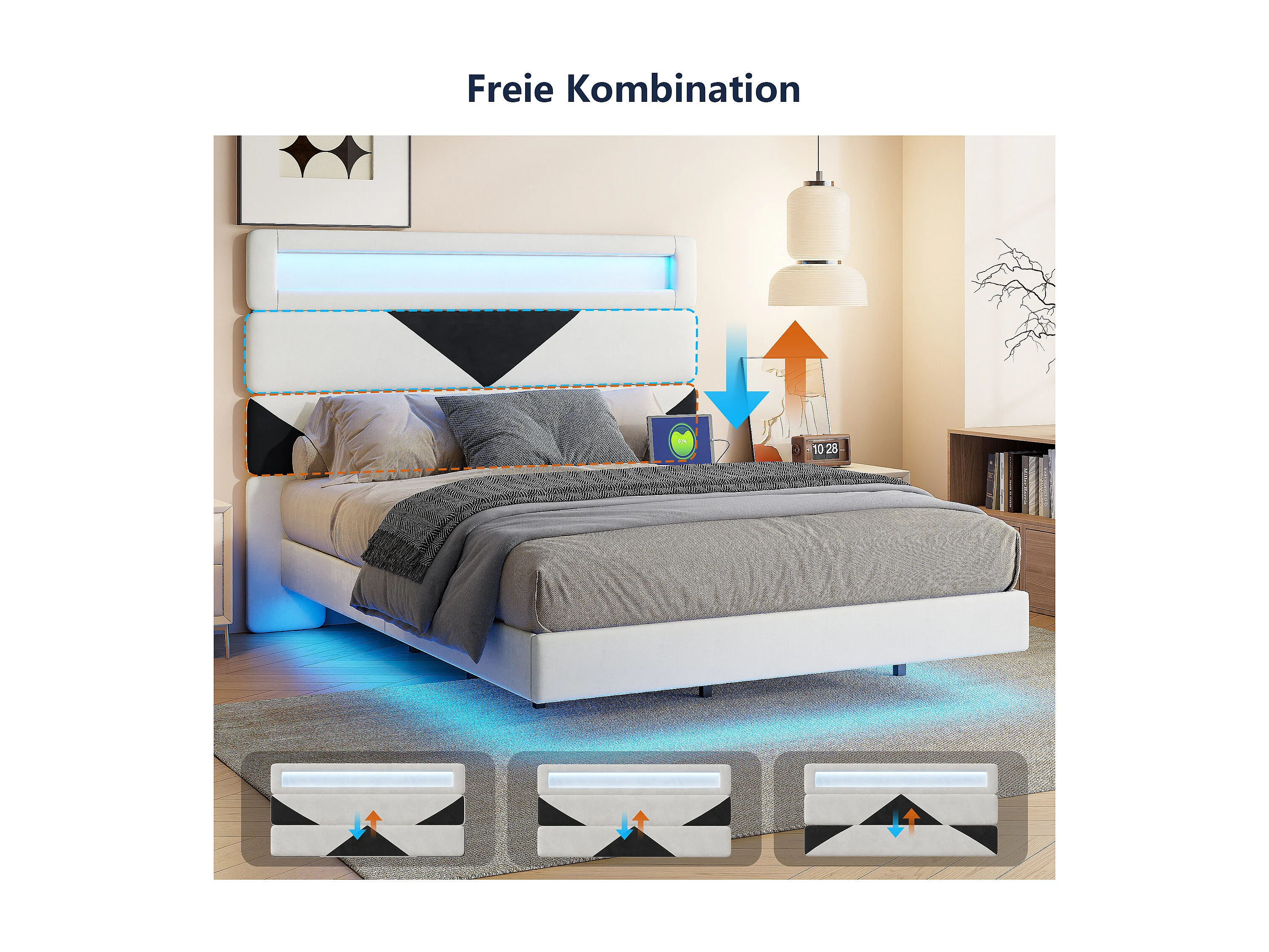 Bett 140x200 cm, MDF, mit USB und LED-Beleuchtung, Erwachsenenbett - Weiß+Schwarz