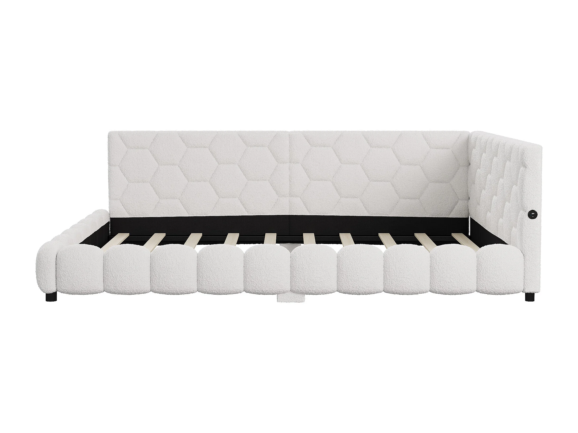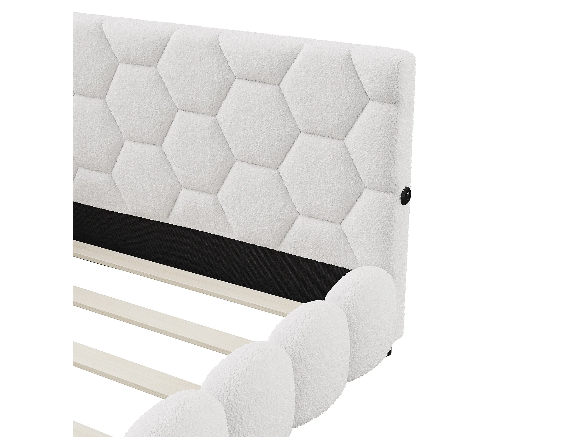 Bett 140x200cm, Doppelbett mit LED, USB-Anschluss, Plüschstoffmaterial, Schlafsofa, Beige