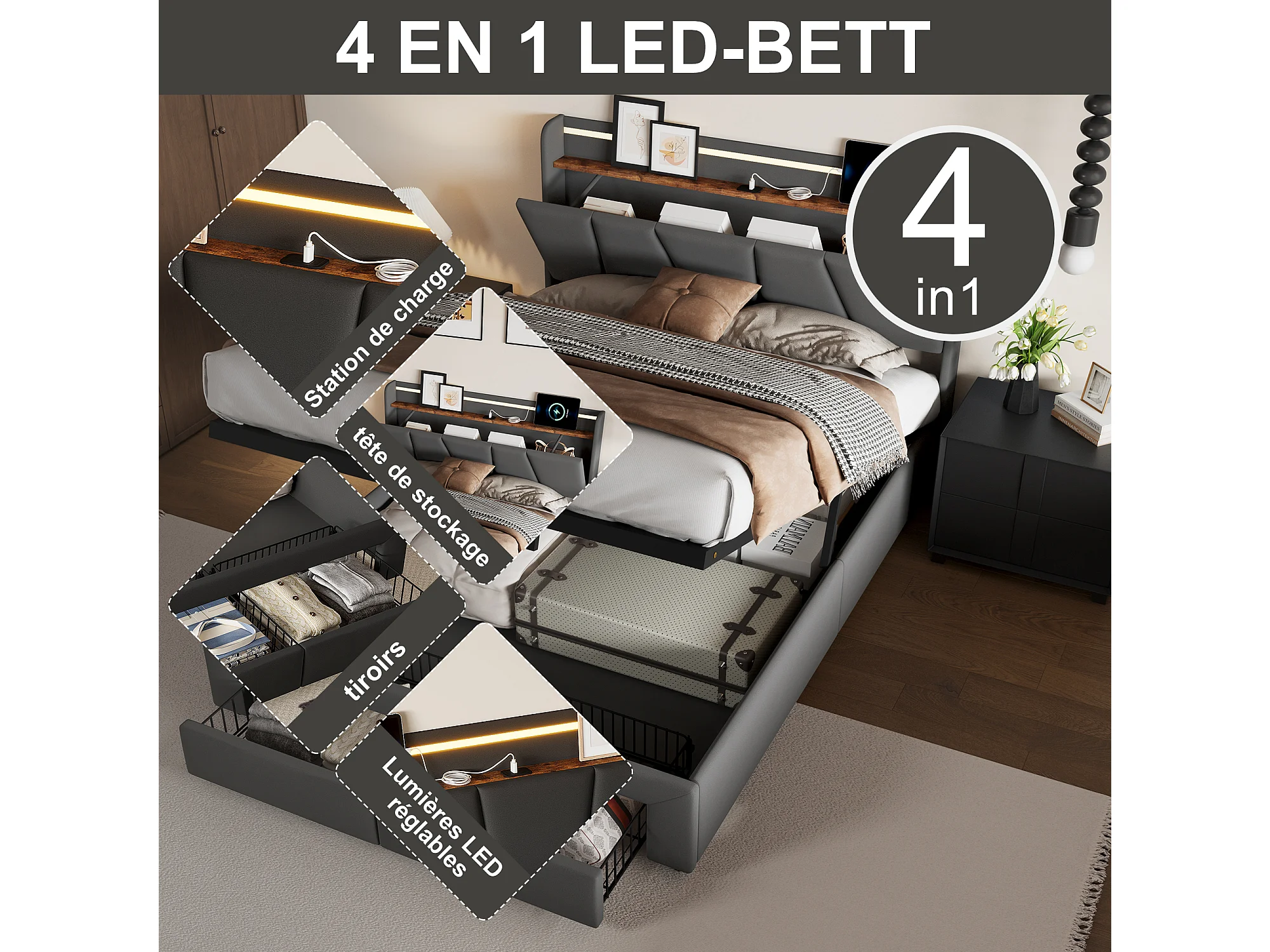 Bett für Erwachsene, 140 × 190 cm, mit mehrfarbiger LED-Beleuchtung, Kopfteil mit Stauraum, 2 Schubladen sowie USB- und Typ-C-Anschlüssen – Dunkelgrau