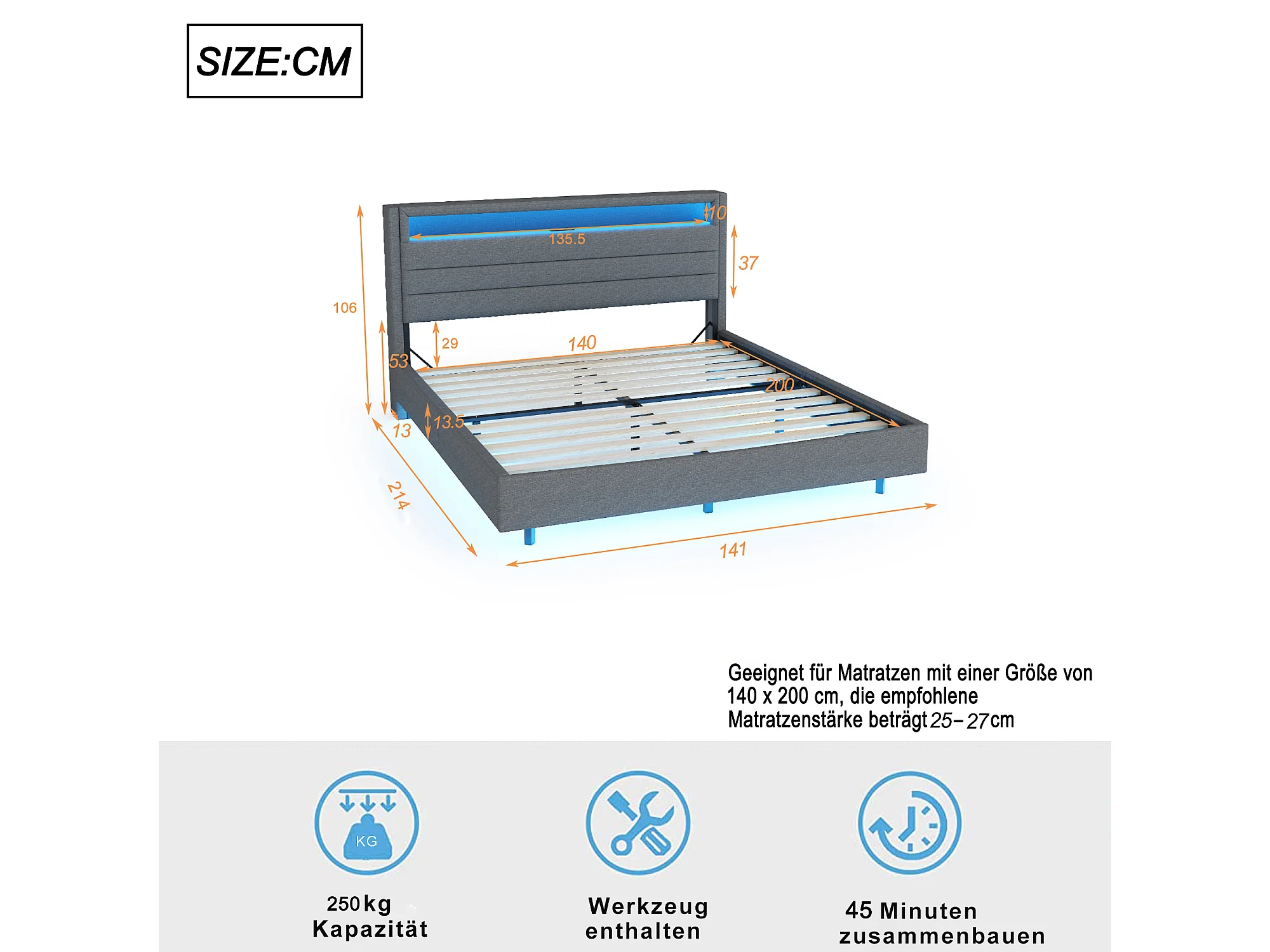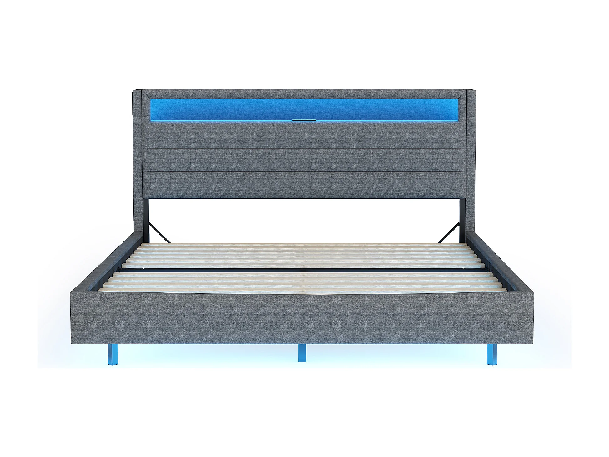 Bett für Erwachsene 140 x 200 cm – mit USB-Anschluss, LED-Beleuchtung, Kopfteil mit Stauraum – graues Leinen – Matratze nicht enthalten