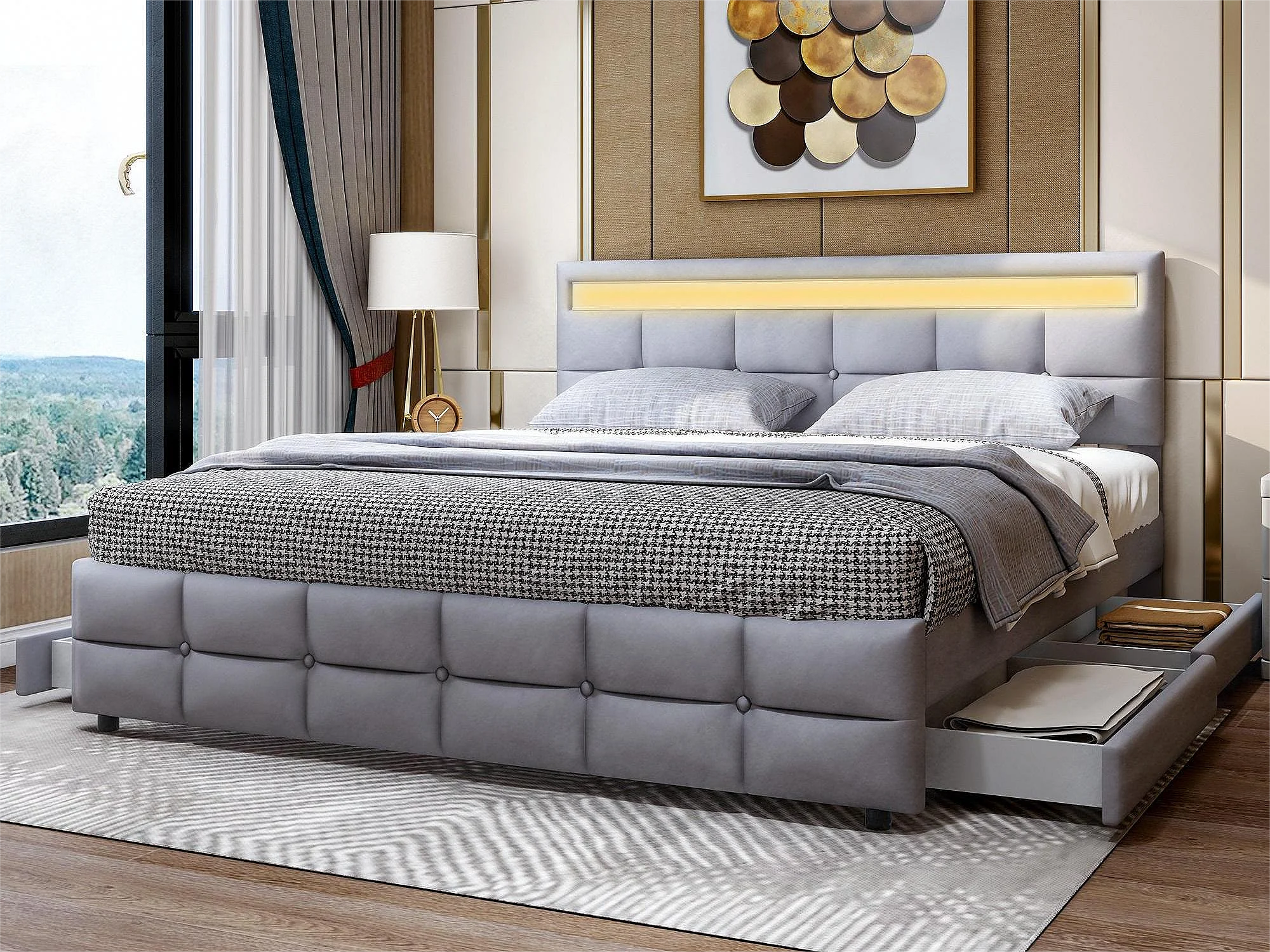 Bett mit Kopfteil – 180 x 200 cm – 4 Schubladen – Samtstoff – LED-Beleuchtung – Lattenrost – Grau