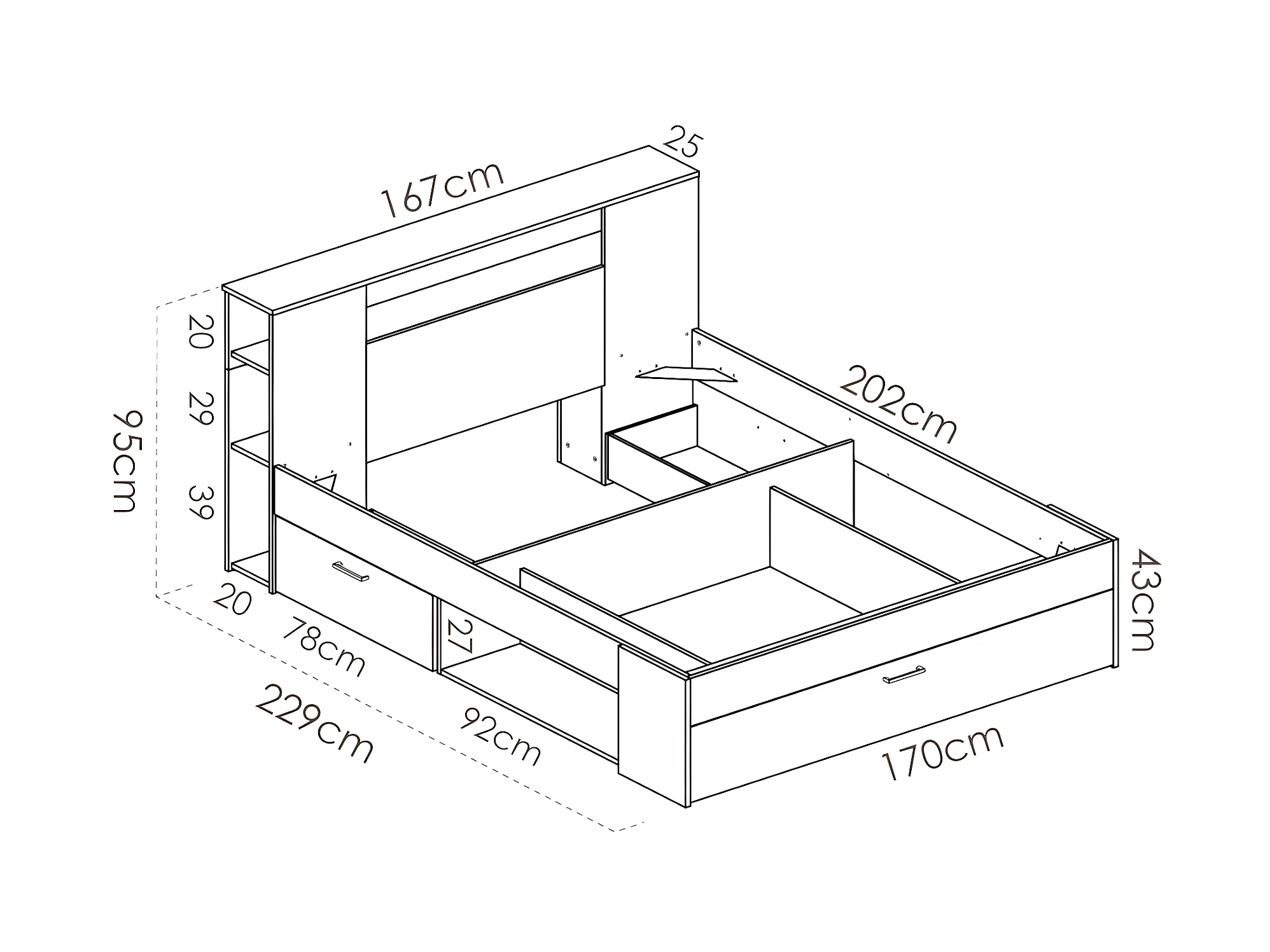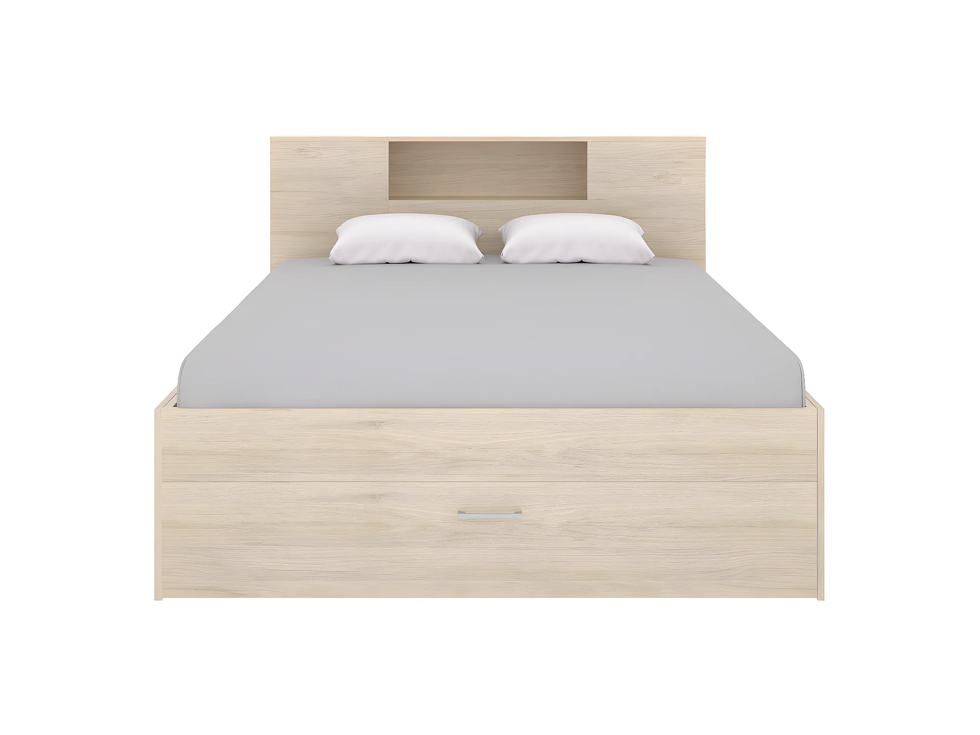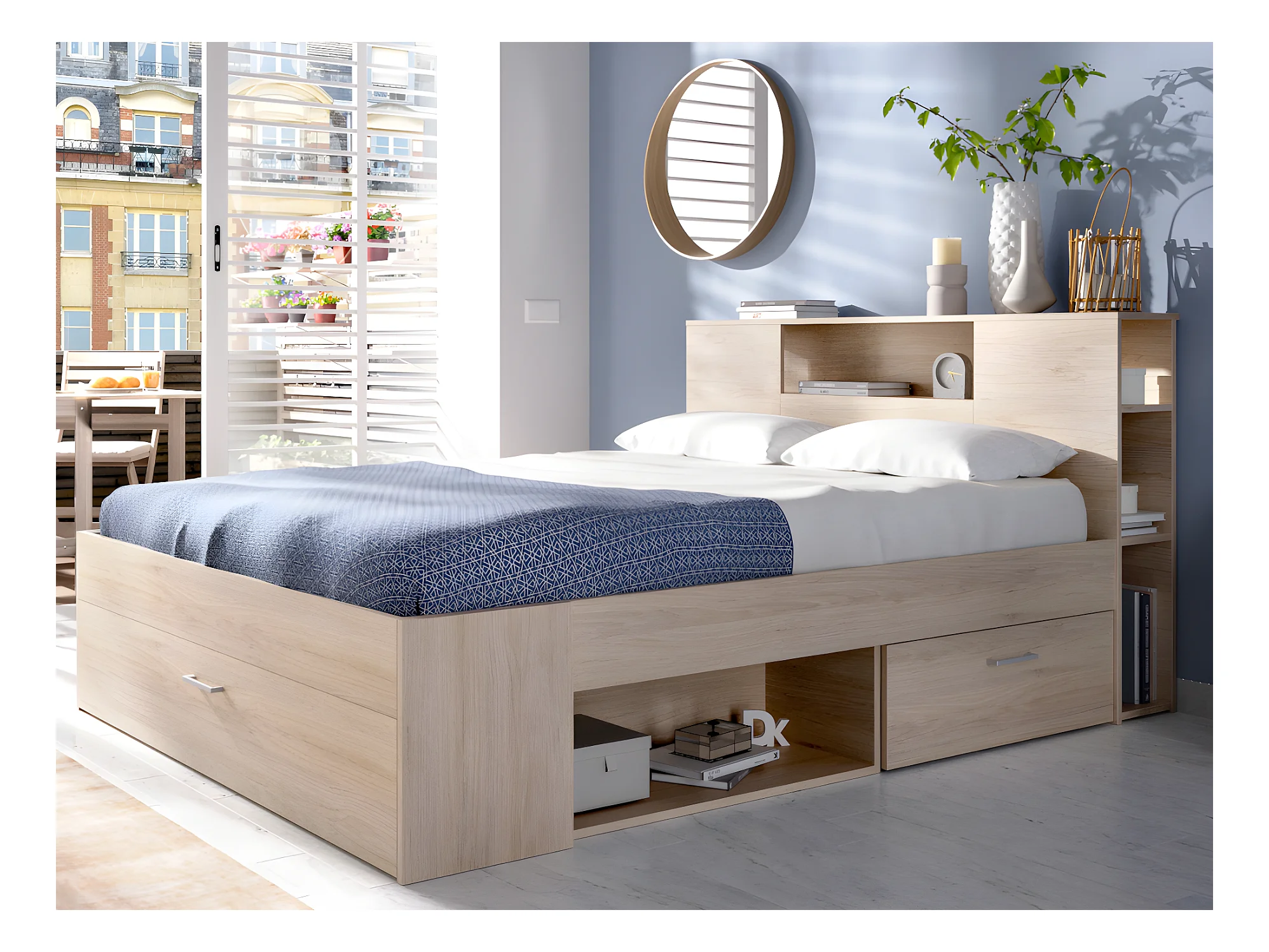 Bett mit Kopfteil, Stauraum & Schubladen + Lattenrost + Matratze - 160 x 200 cm - Holzfarben - LEANDRE