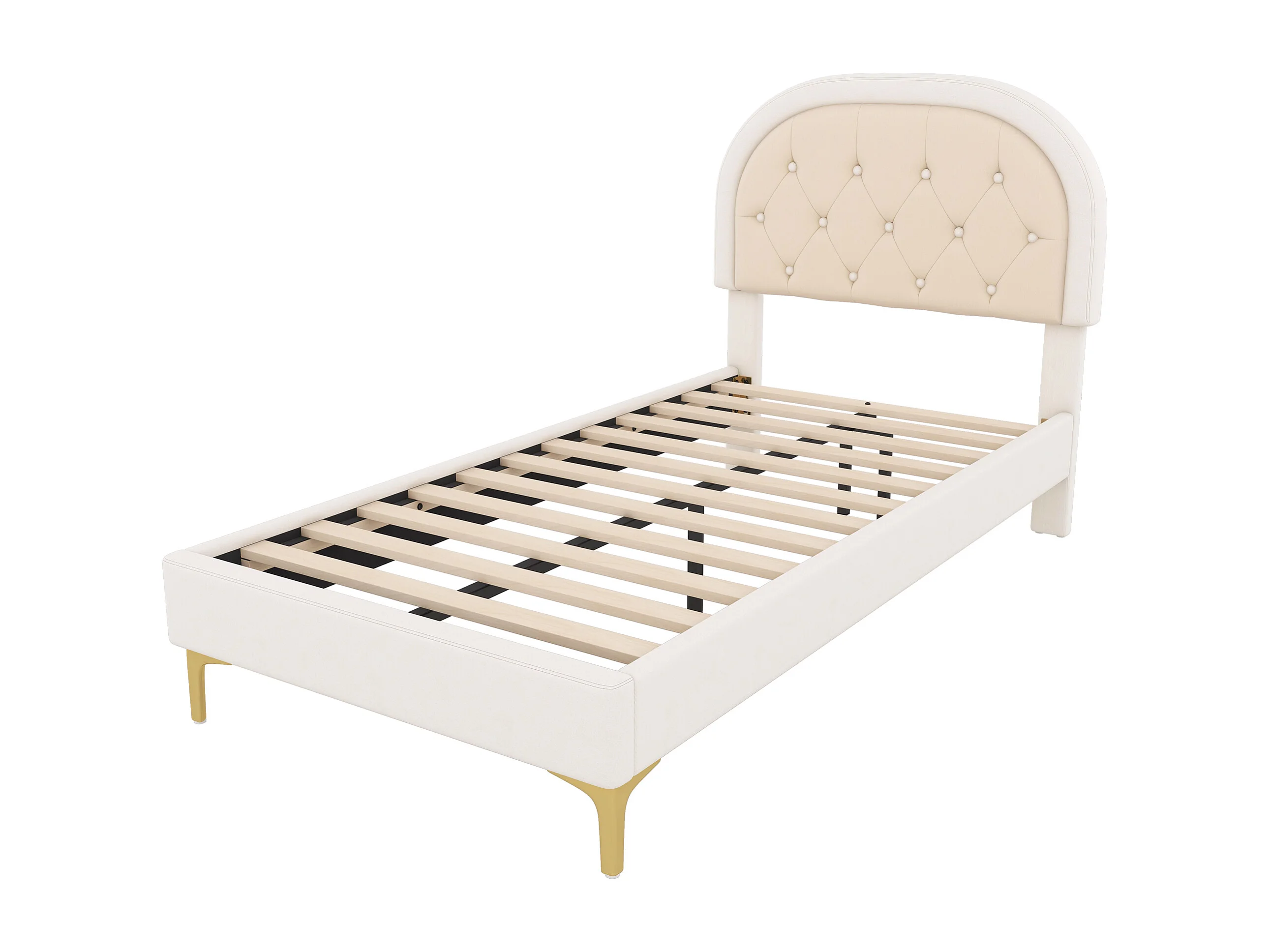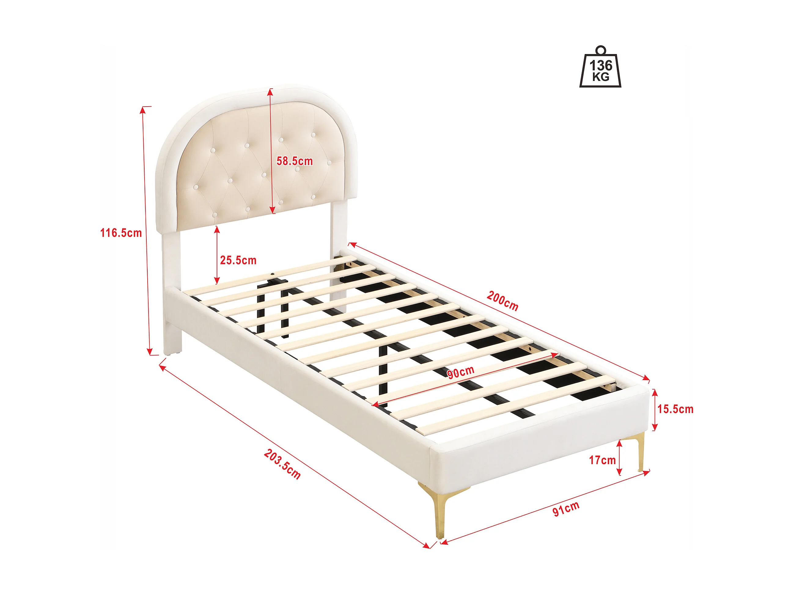 Bett mit Lattenrost und Metallbeinen, geschwungenes Kopfteil, Samt, minimalistisch, beige, 90x200cm (ohne Matratze)