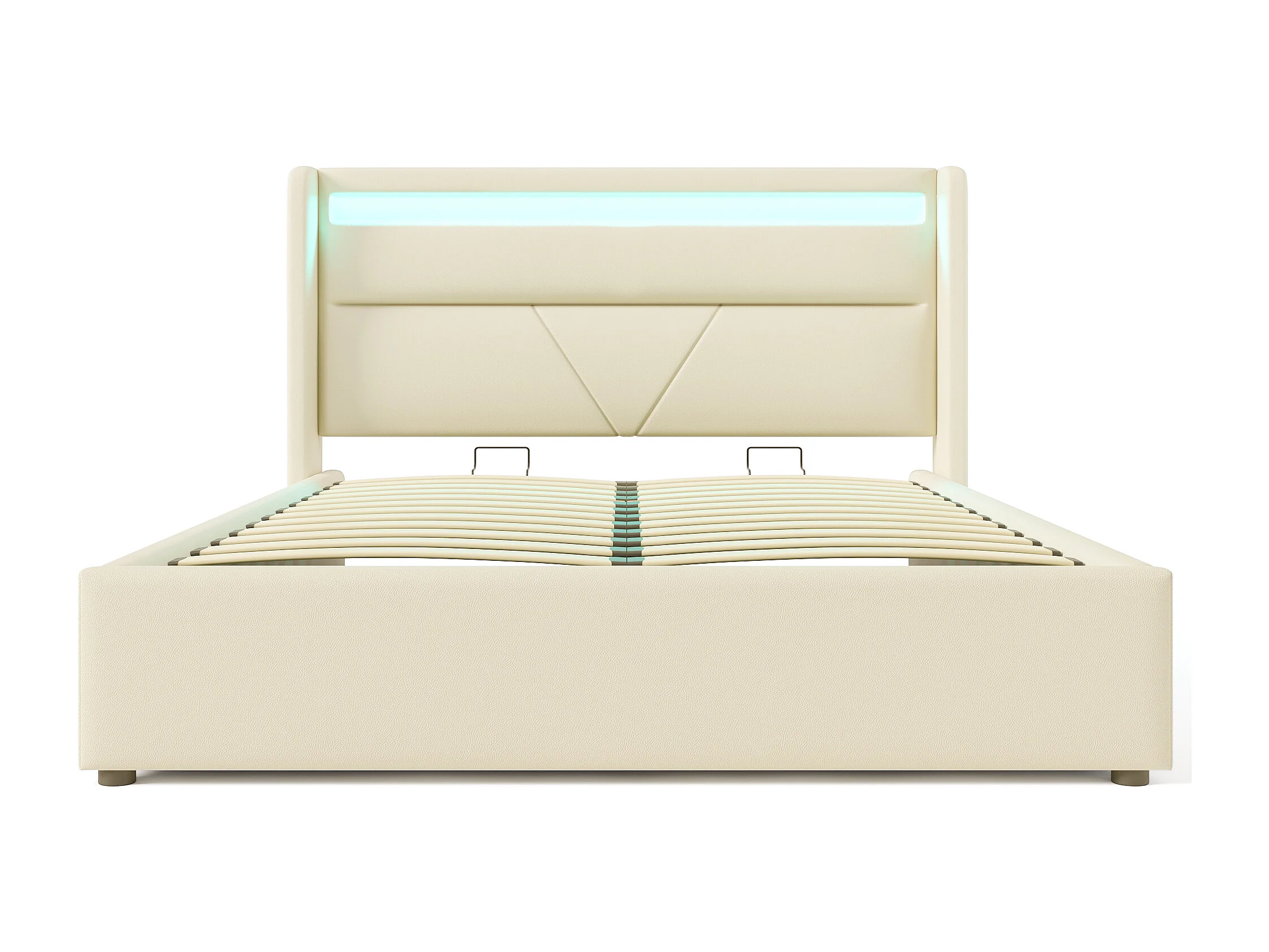 Bett mit Stauraum 140 x 200 cm – Erwachsenenbett mit LED-beleuchtetem Kopfteil – weißes Leder – Matratze inklusive