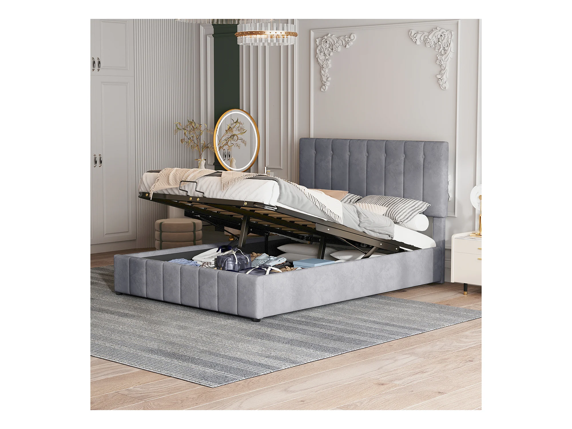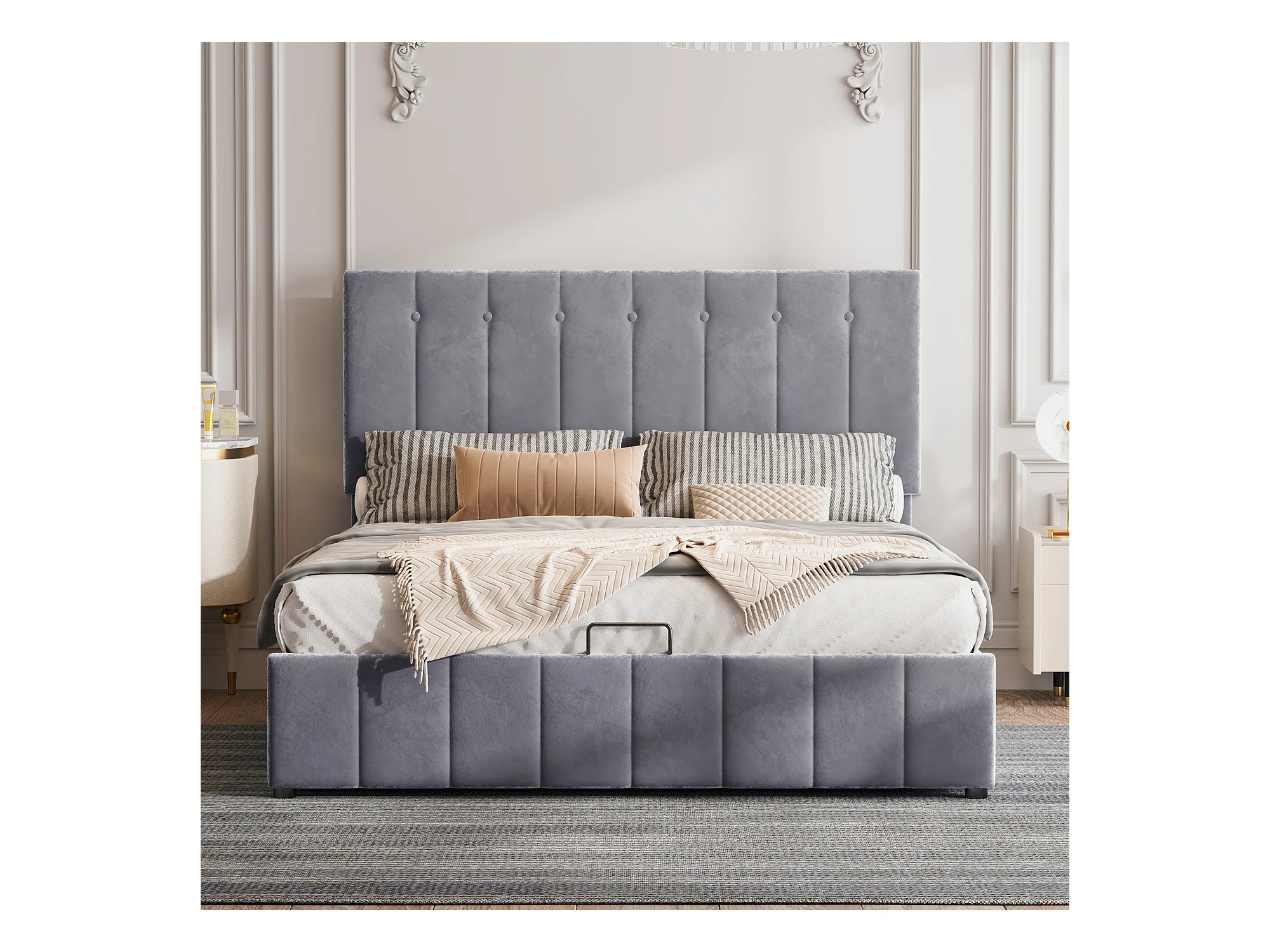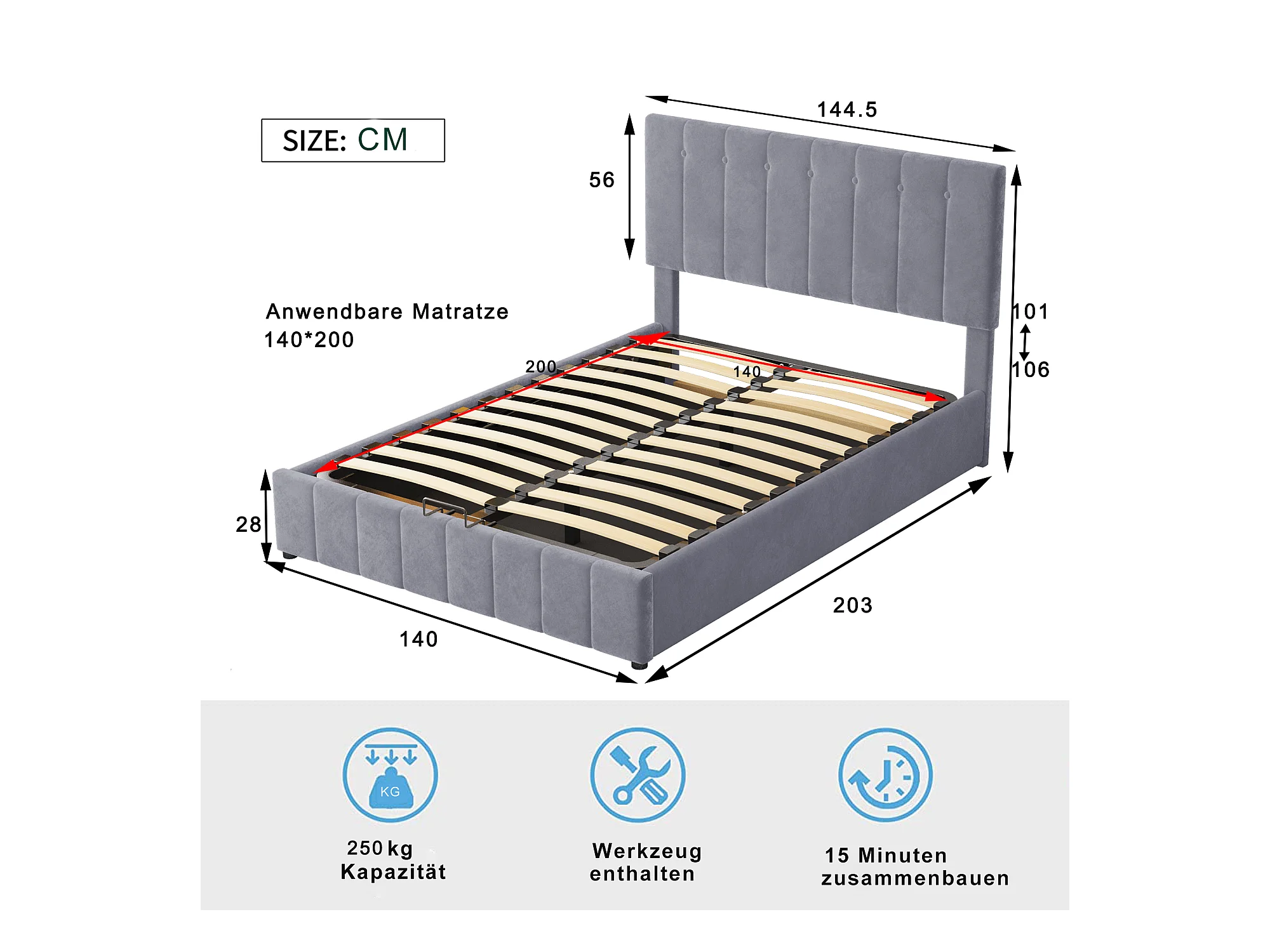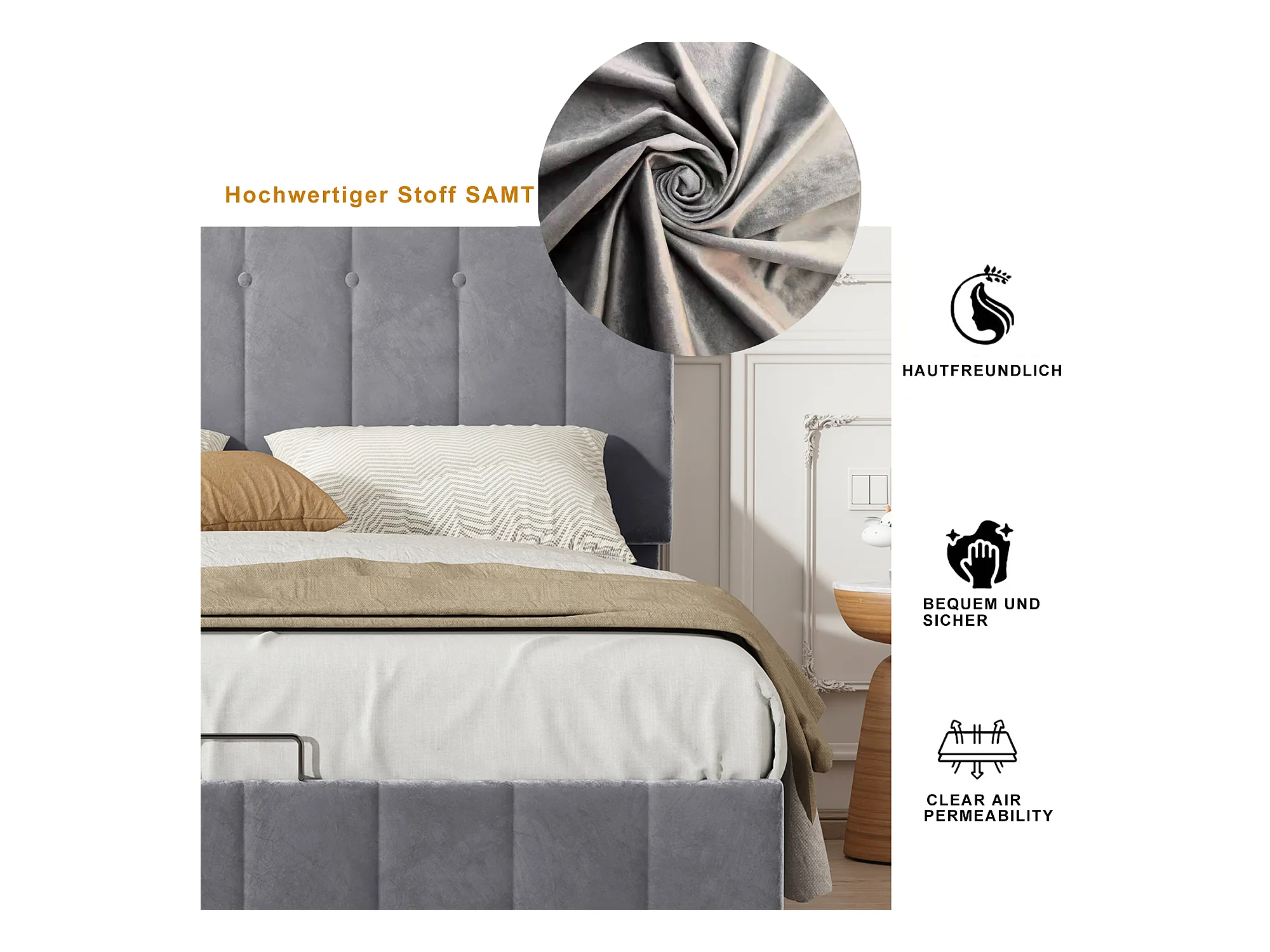Bett mit Stauraum 140x200 cm – grauer Samtstoff – Polsterbett mit verstellbarem Kopfteil – Metalllattenrost