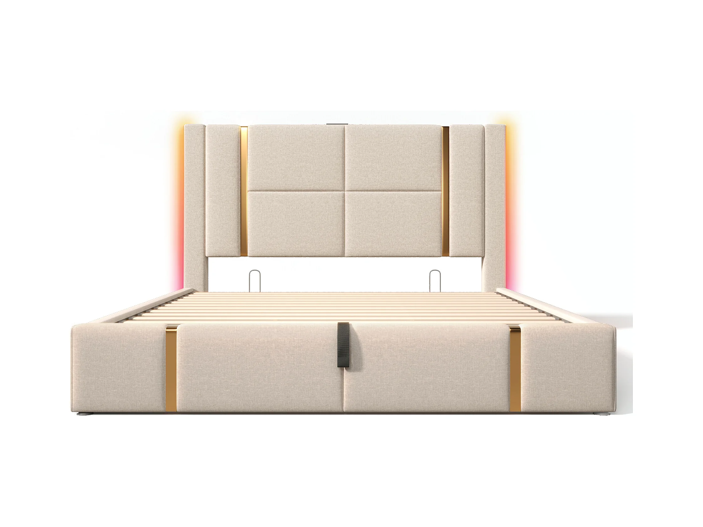 Bett mit Stauraum 160 x 200 cm – beigefarbenes Leinen – Doppelbett mit LED- und USB-Ladefunktion – ohne Matratze