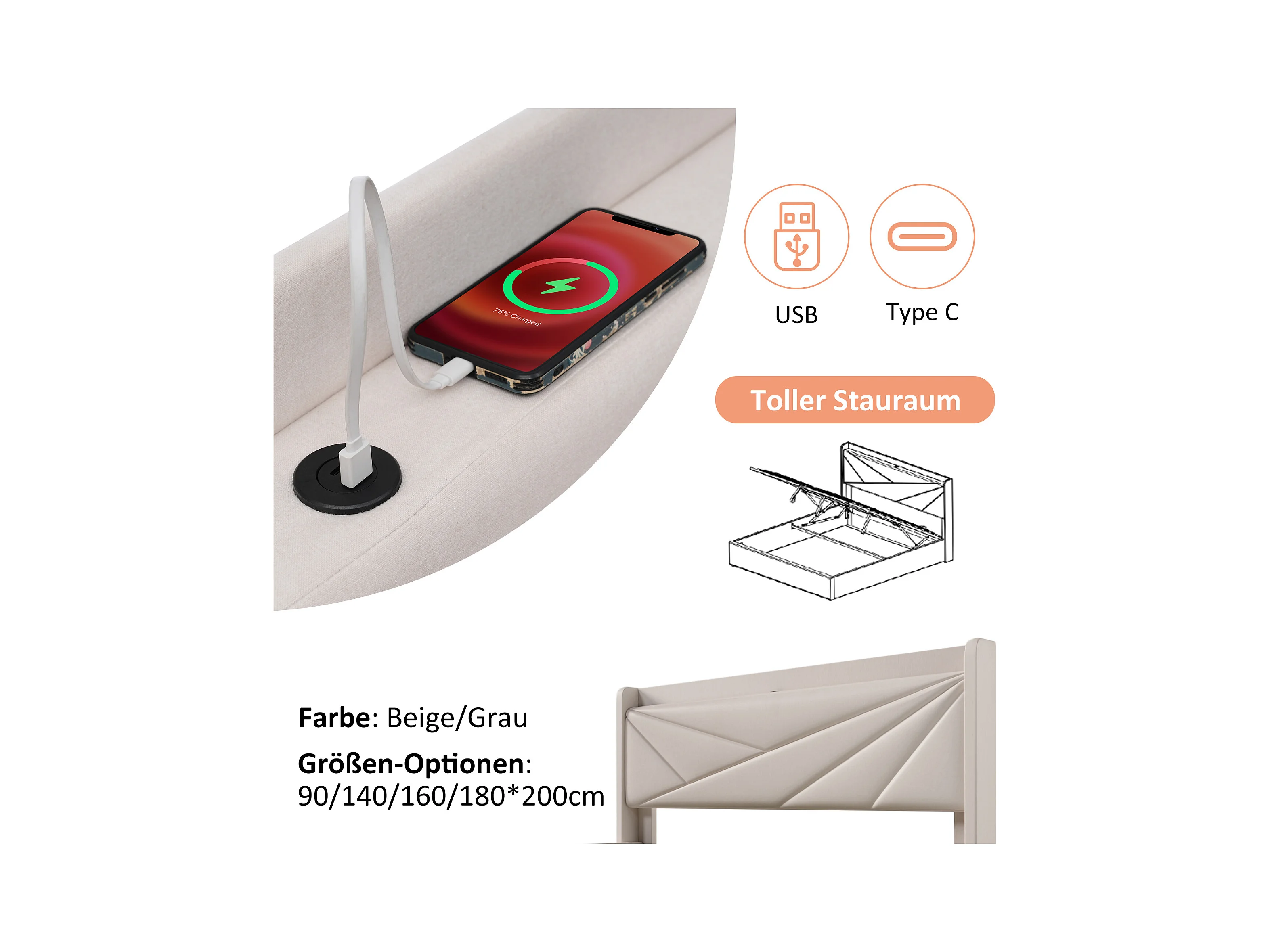 Bett mit Stauraum - 180x200 cm - Doppelbett mit USB Typ C Ladefunktion Kopfteil - Leinenmaterial - Beige