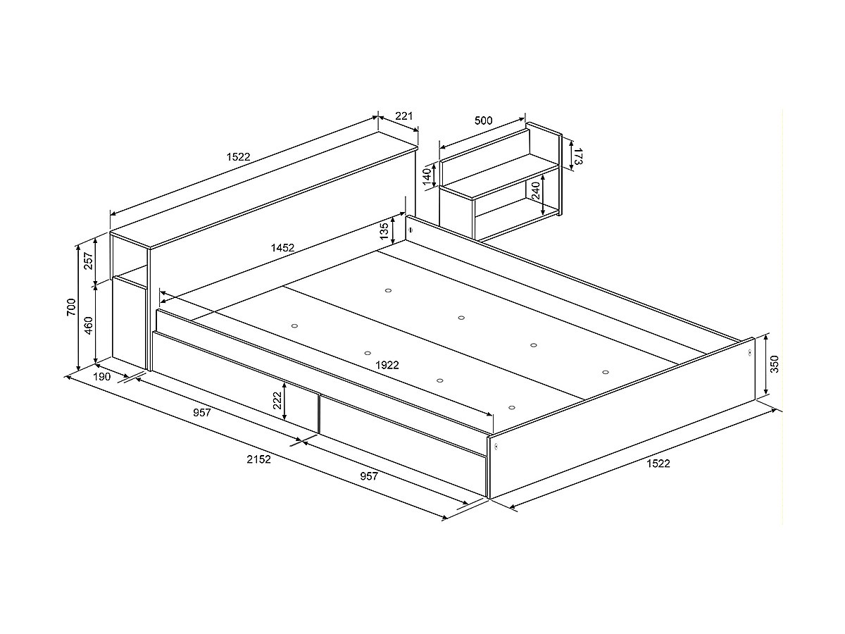 - 2 Nachttische im Innern des Bett-Kopfteils integriert