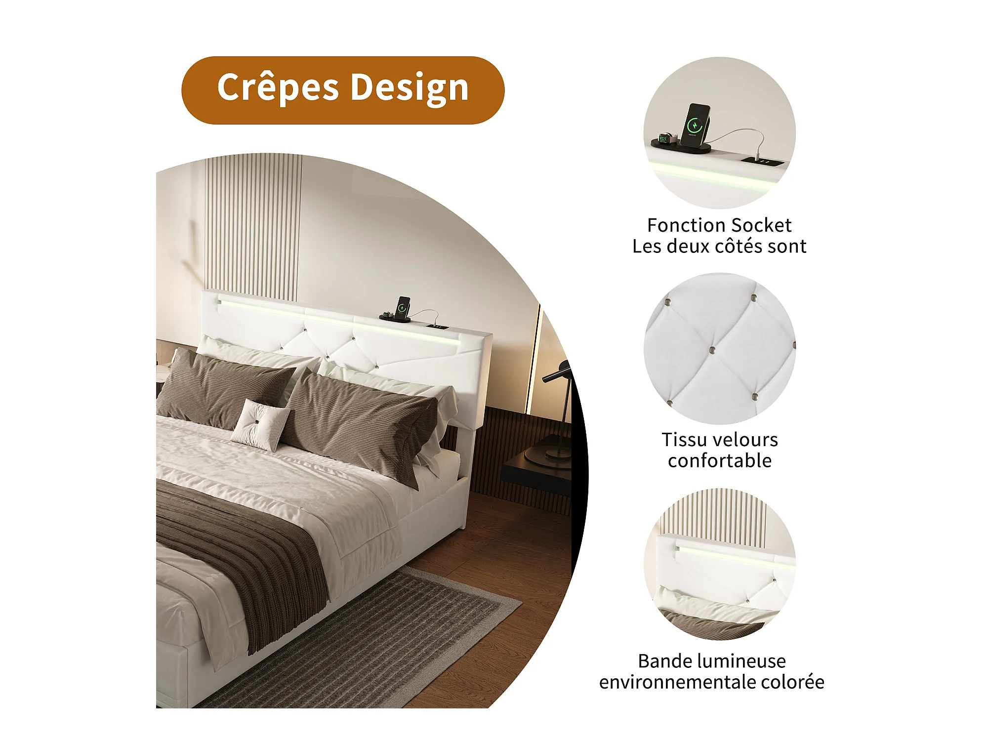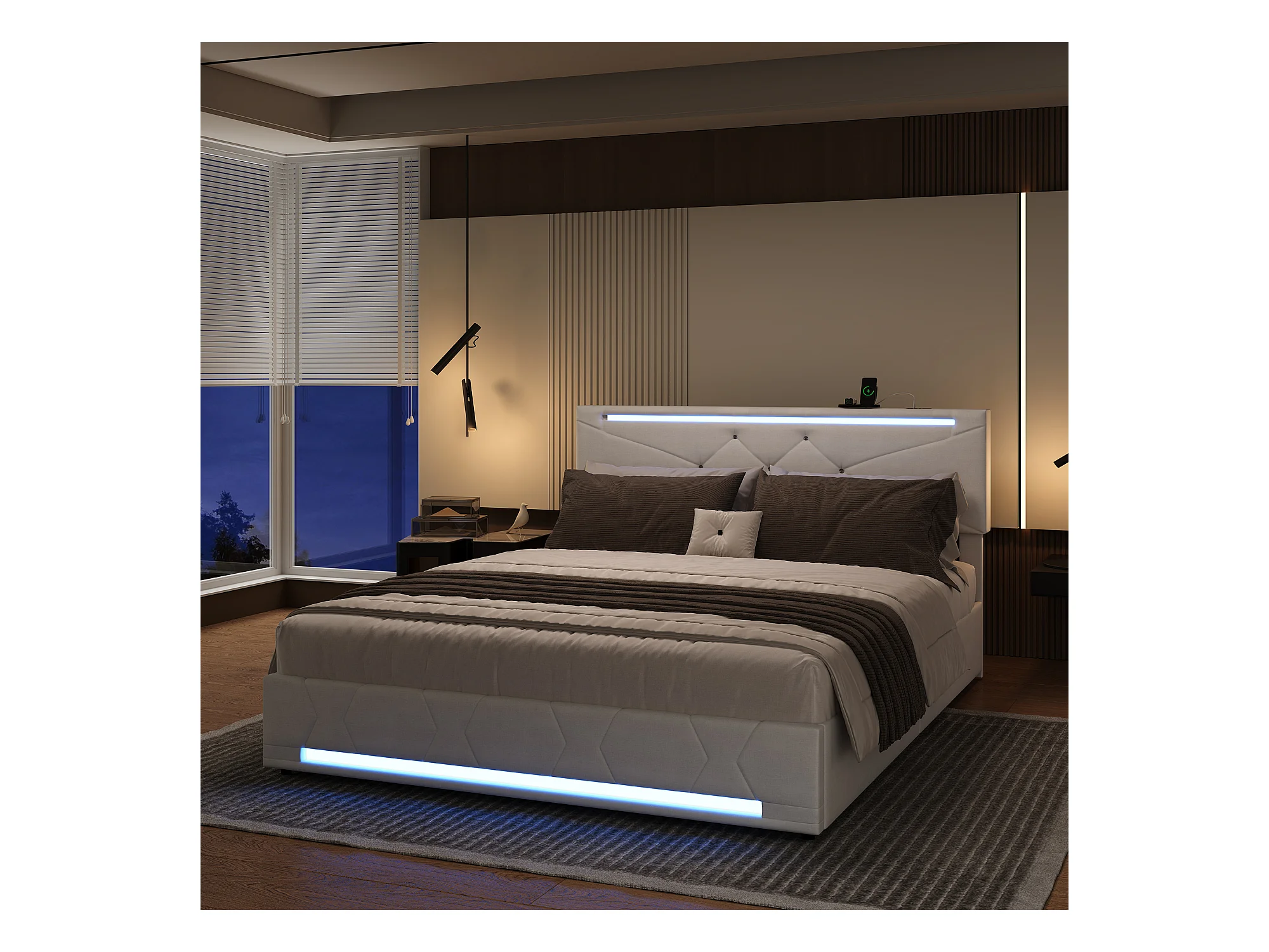 Bett mit Stauraum, RGB-LED und USB-C/USB-Anschlüssen – 160 x 200 cm – Beigefarbener Stoff – Verstellbares Kopfteil – Großer Stauraum