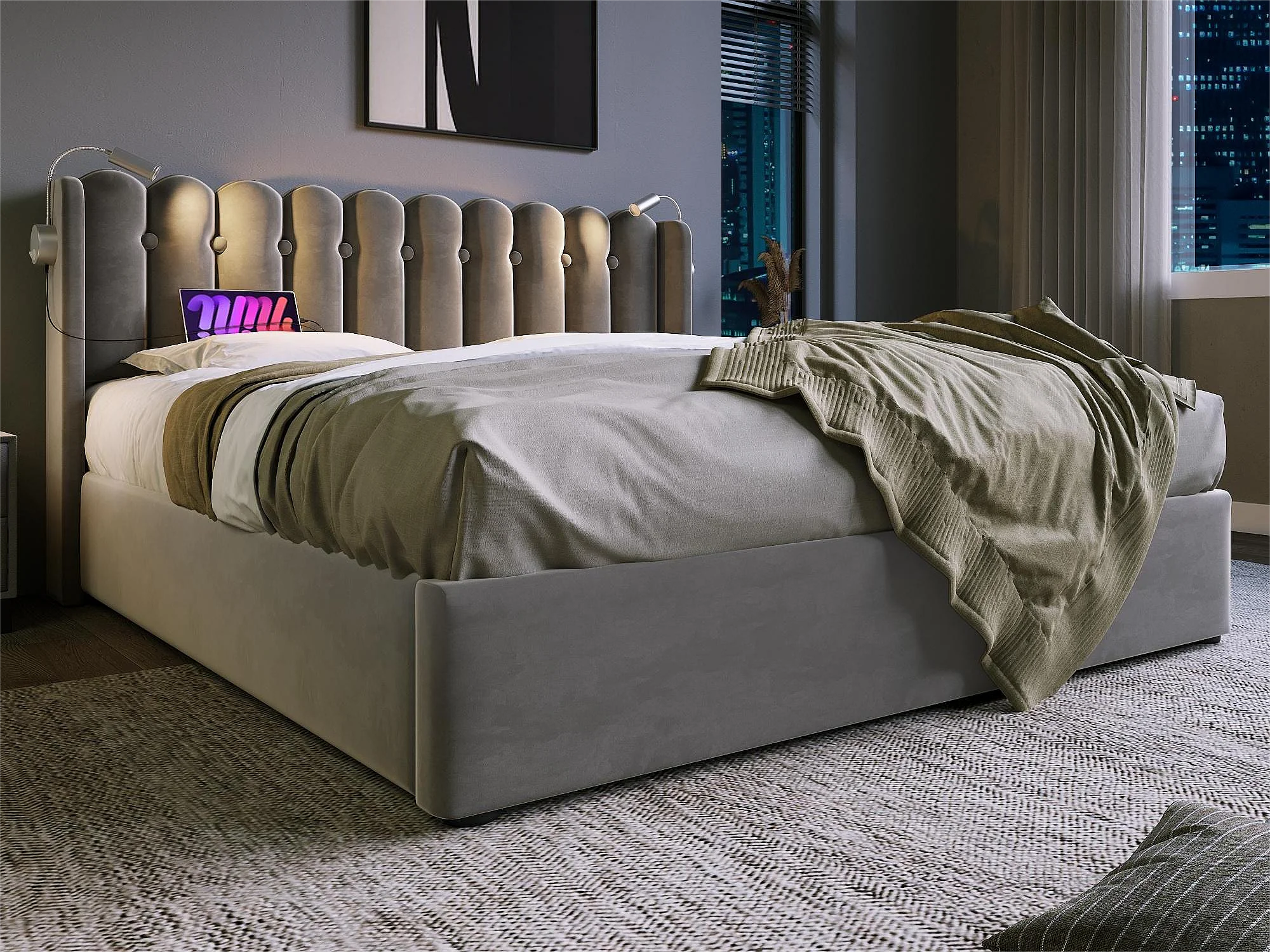 Bett mit Stauraum und Kopfteil – 140 x 200 cm – Leselampe und USB-Anschluss – Leinenstoff – graue Farbe