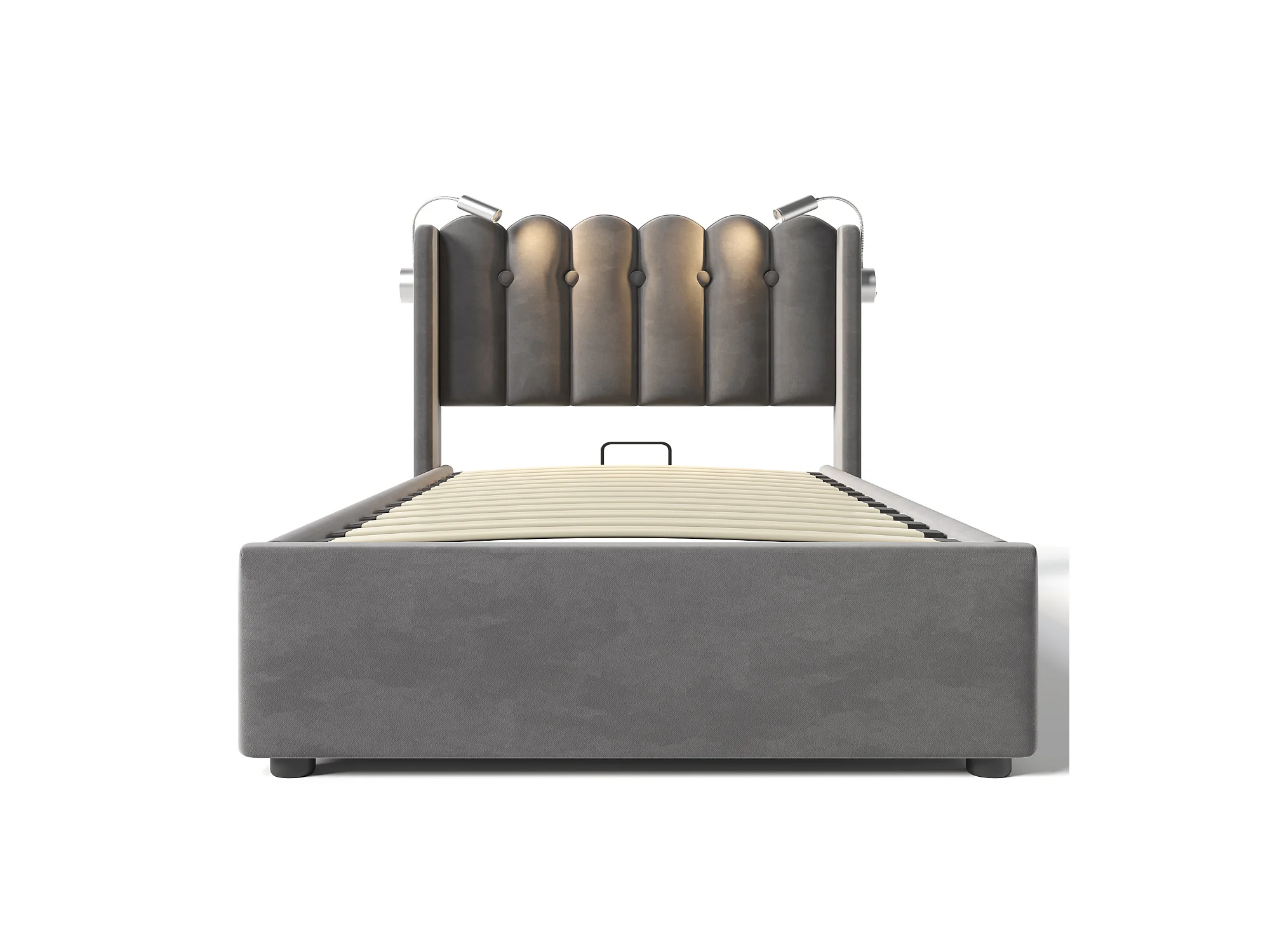 Bett mit Stauraum und Kopfteil – 90 x 200 cm – Leselampe und USB-Anschluss – Leinenstoff – graue Farbe