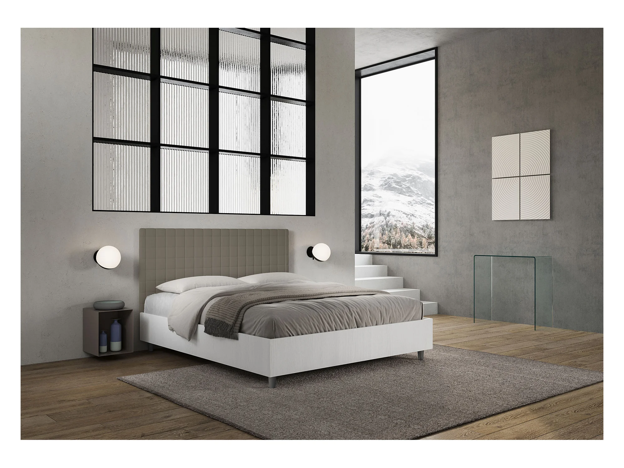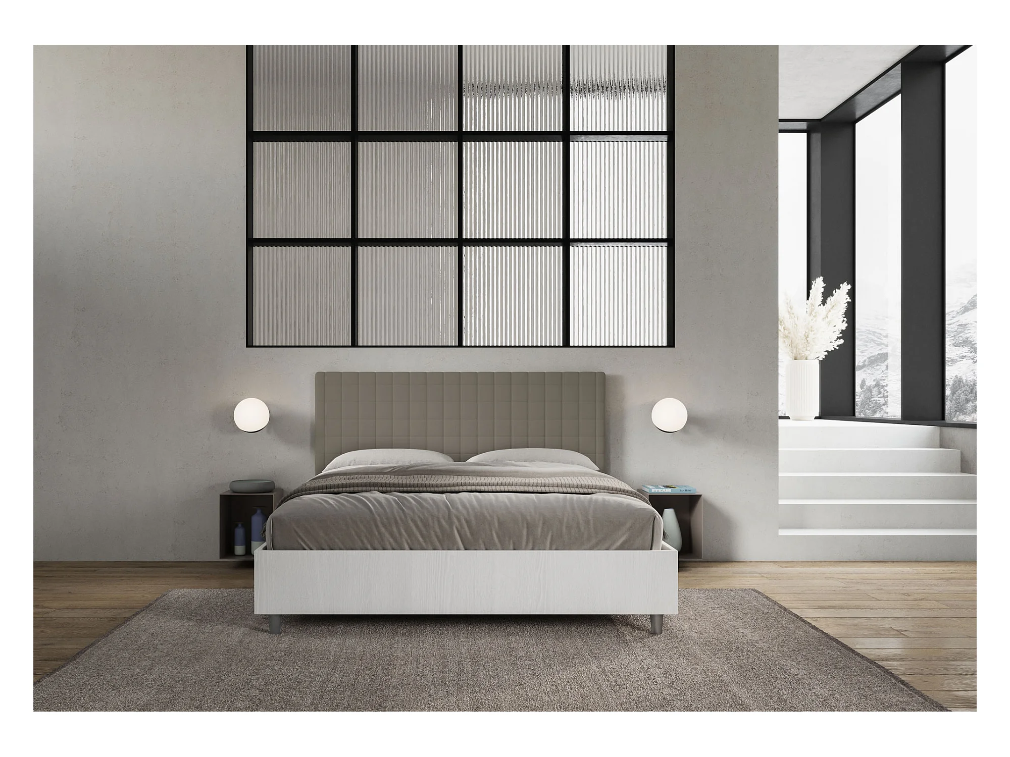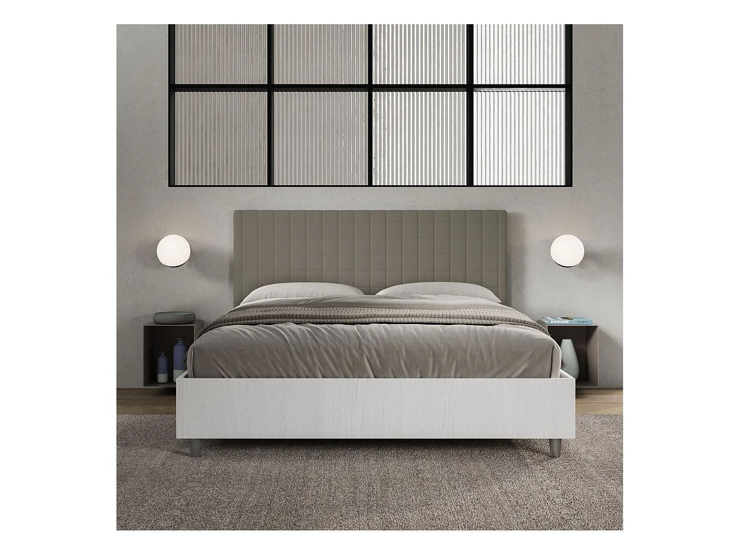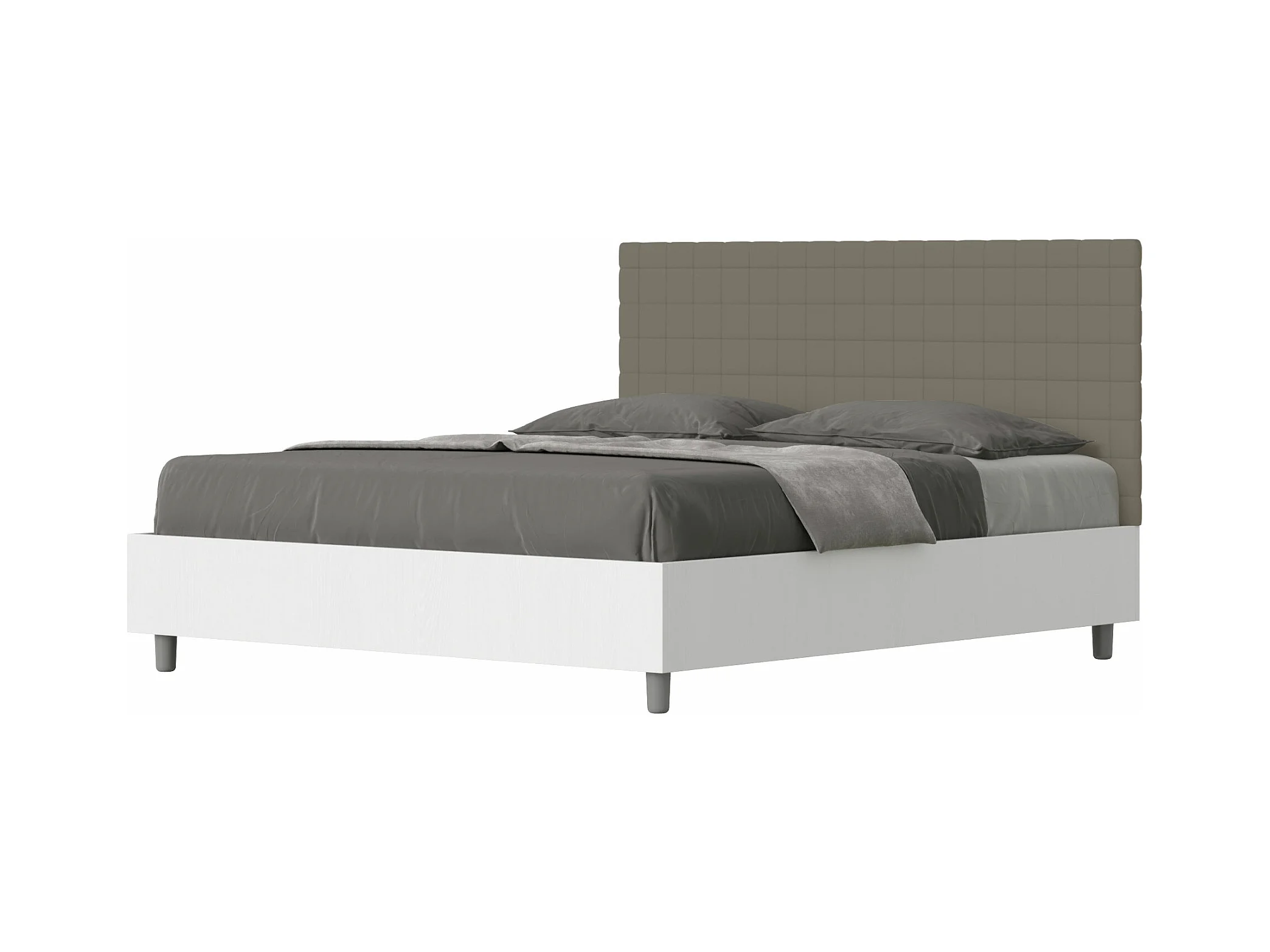 Bett ohne Untergestell 160x190 mit Struktur aus weißer Esche und Kopfteil aus Melamin-/Burmy-Cappuccino-Kunstleder