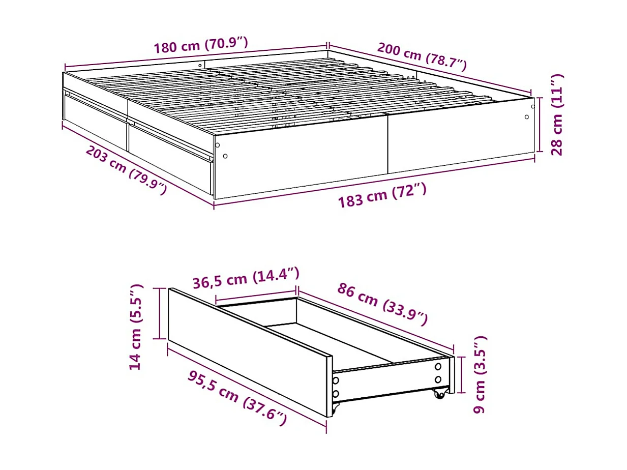 Bettgestell mit Schubladen Räuchereiche 180x200cm Holzwerkstoff