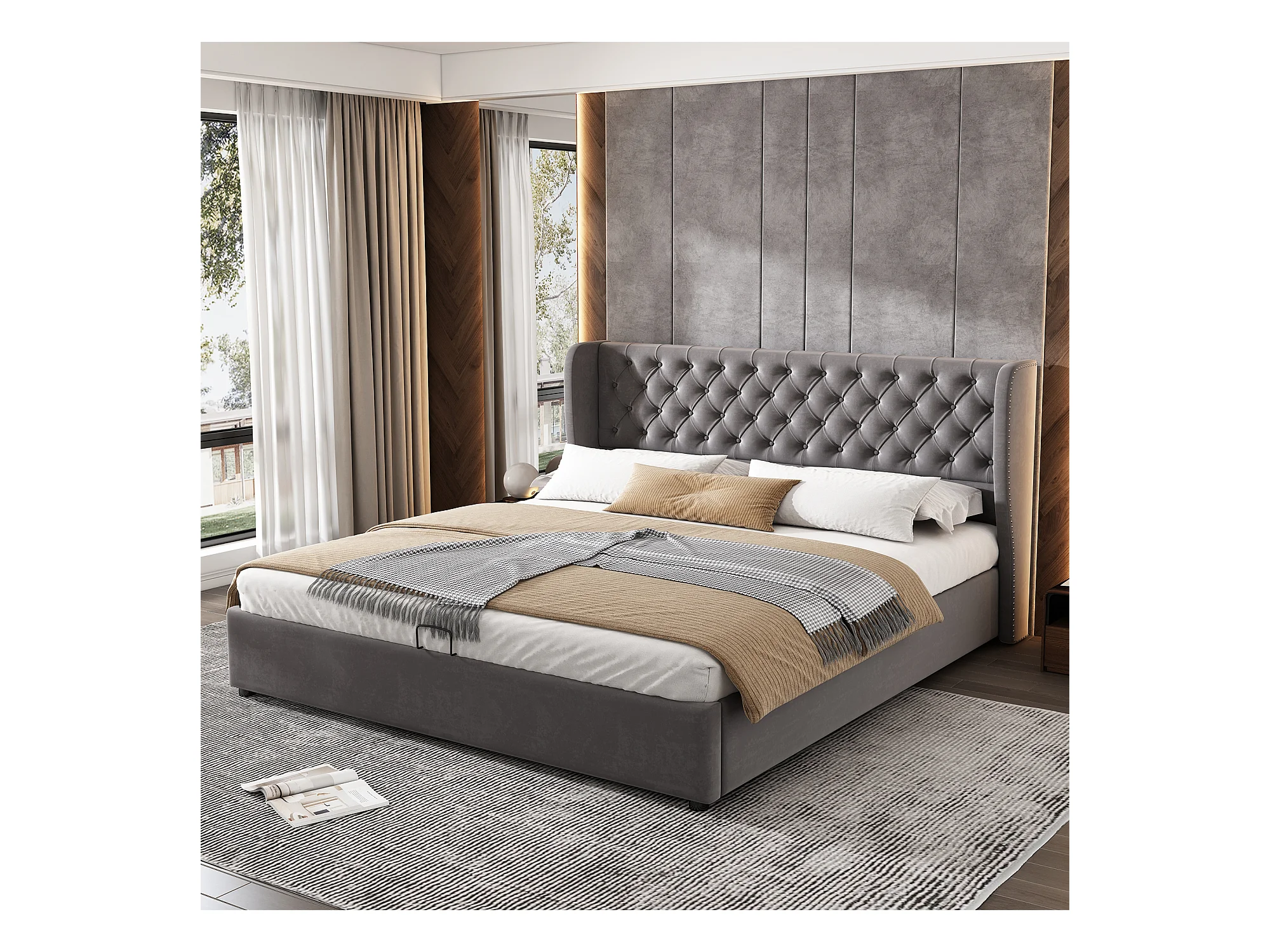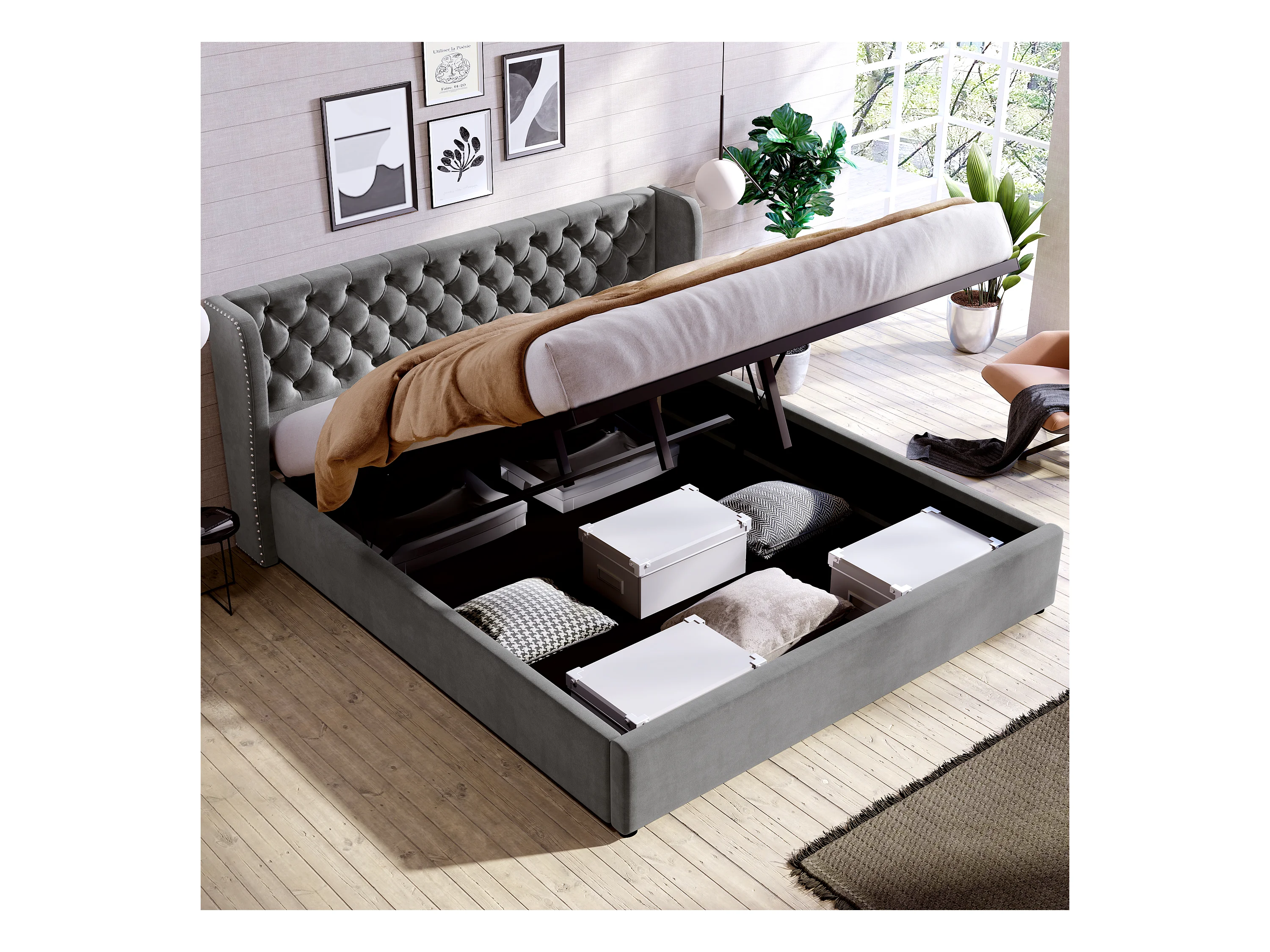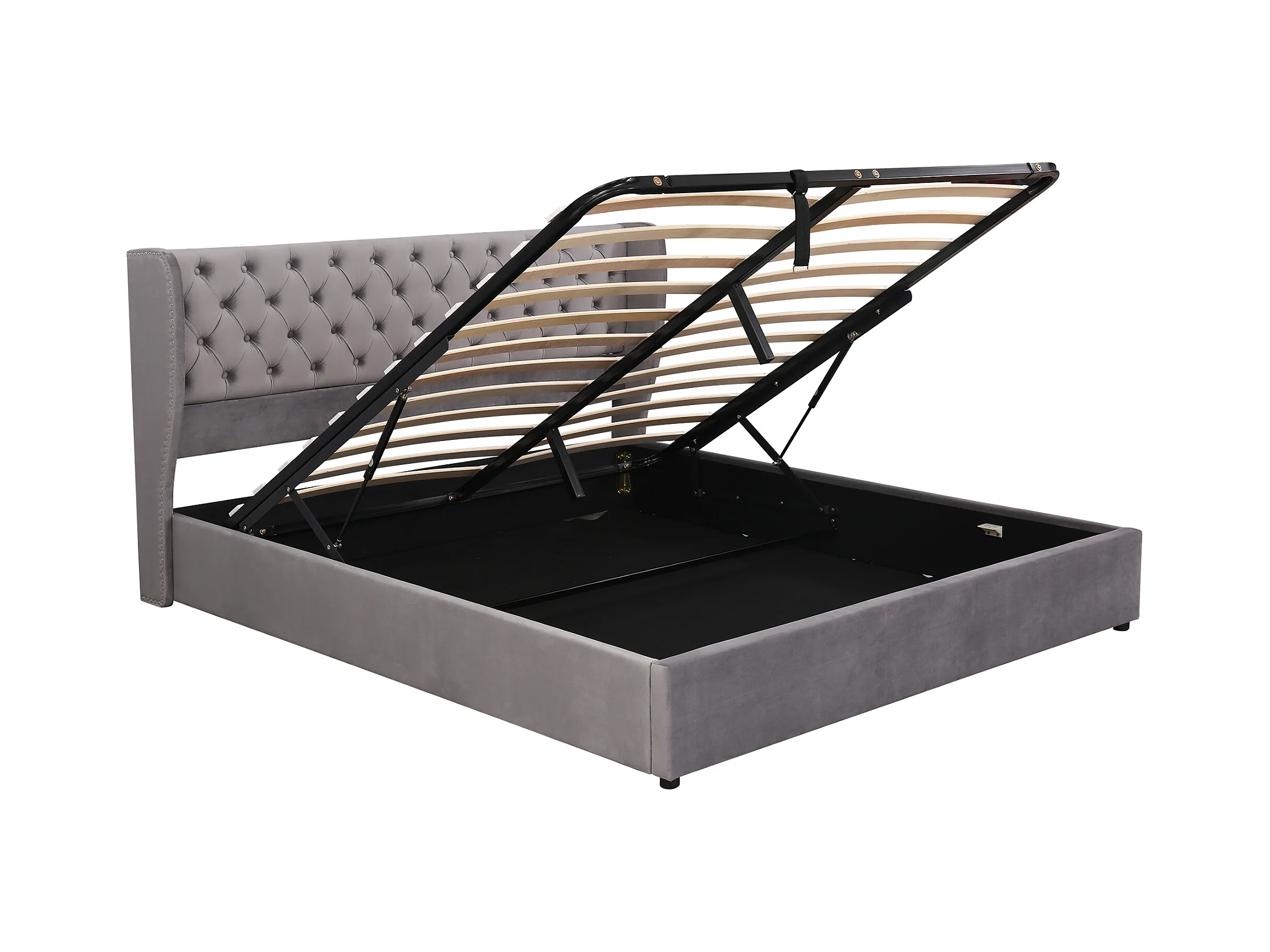Bettkasten 160 x 200 cm, Erwachsenenbett mit Samtbezug, Dekor mit Nieten und Knöpfen, Lattenrost, grau