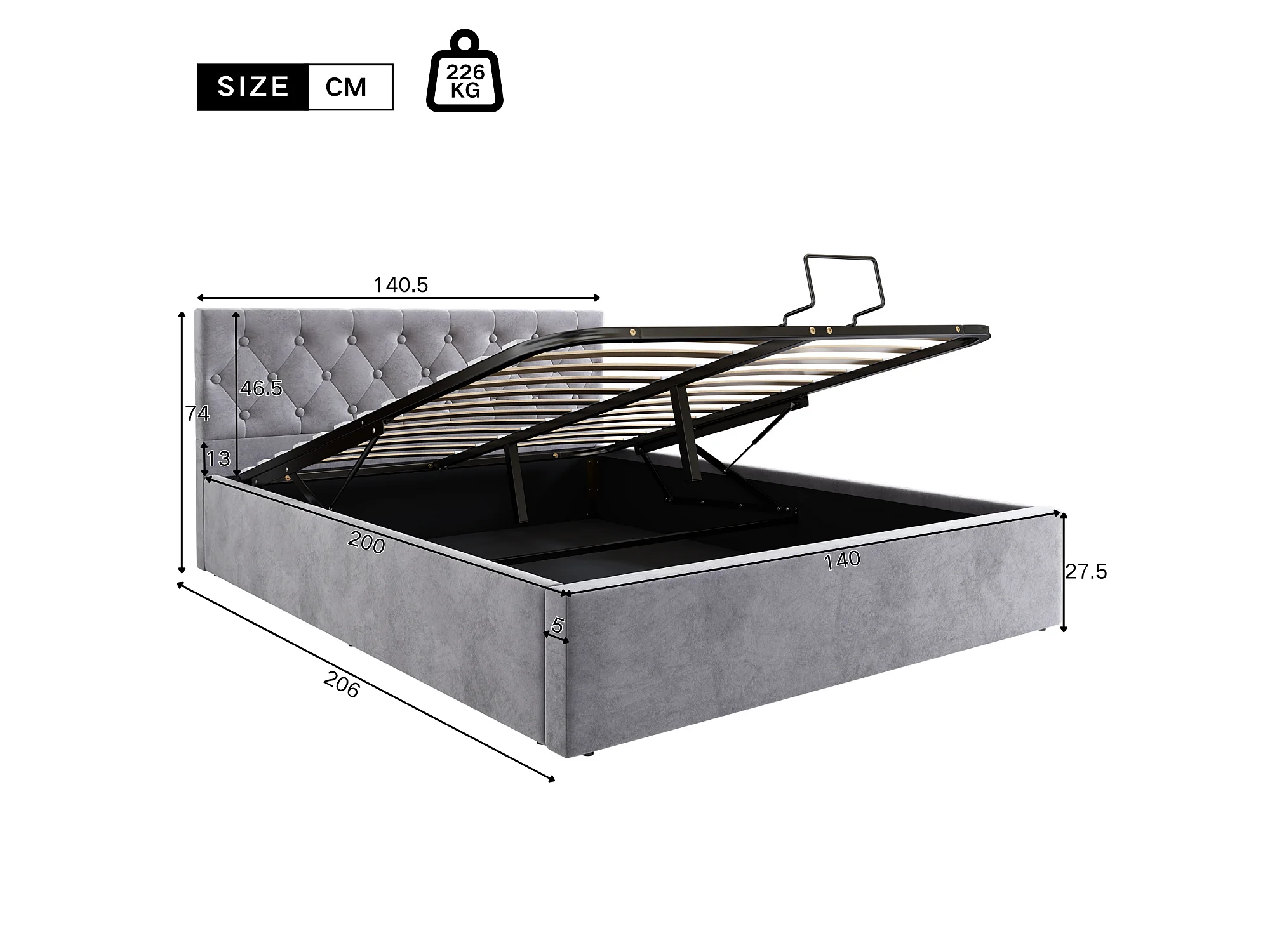 140 x 200 cm großes Samtbett mit Lattenrost – Grau