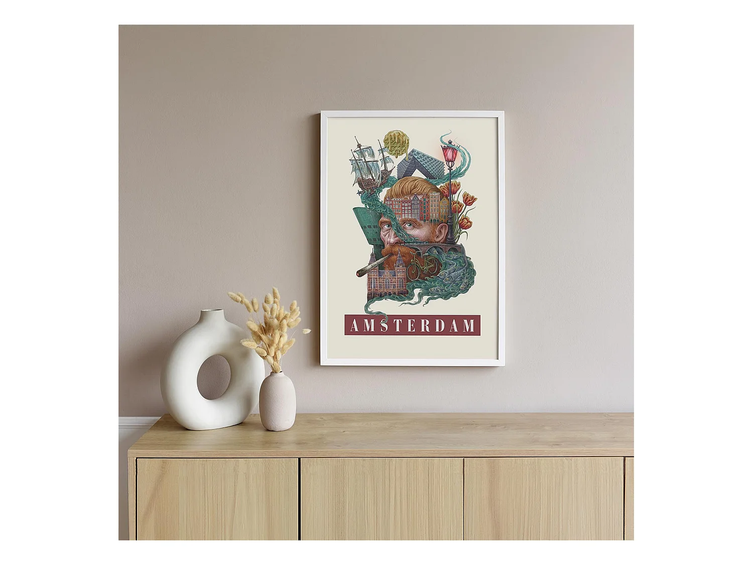 Bild im Rahmen, modernes niederländisches Dekor, Amsterdamer Kunst mit weißem Rahmen, Amsterdamer Stadtbild, Druck 50x70 cm.